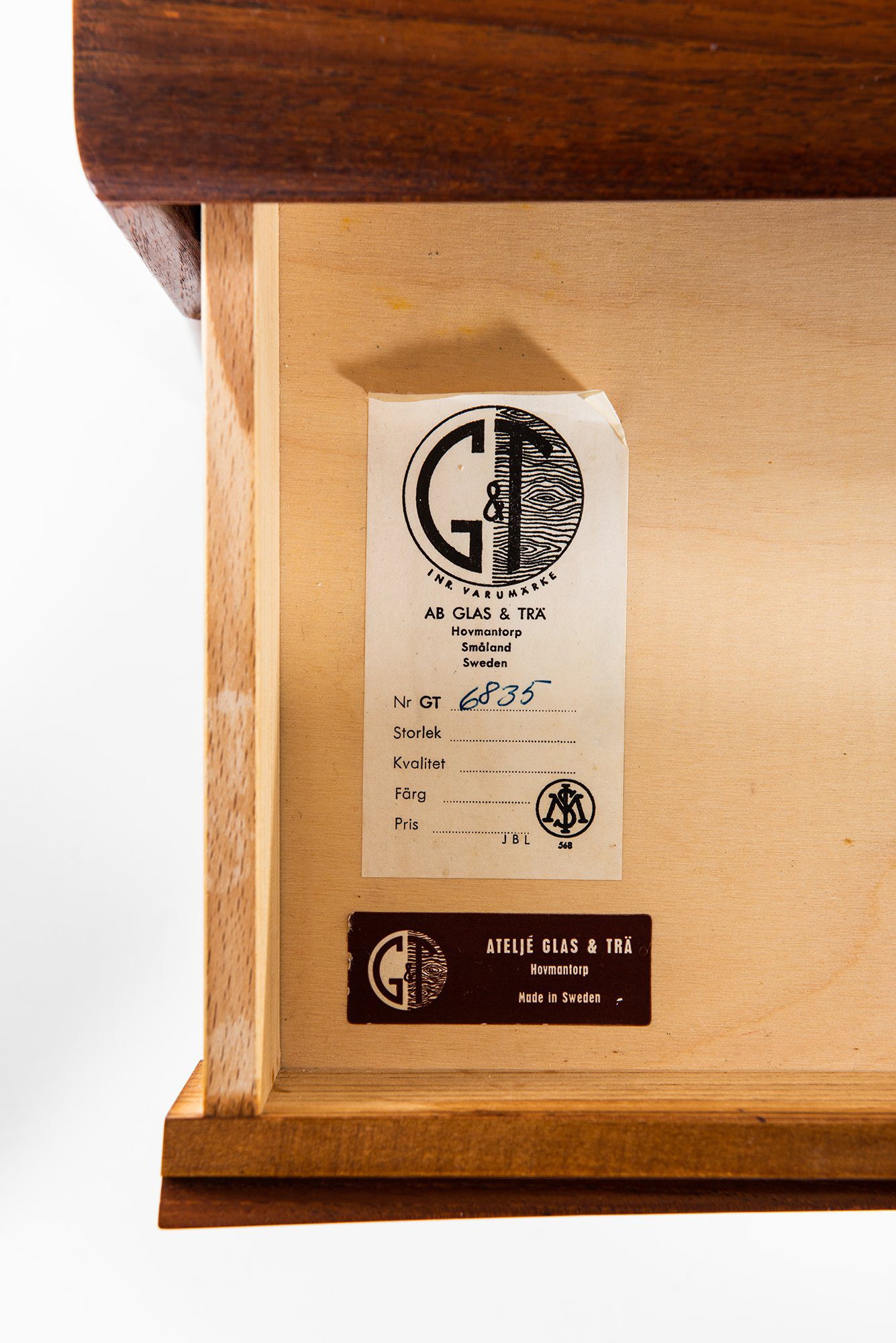 The table stands on slender, tapering legs that provide an elegant contrast to the solid volume of the drawer section. The craftsmanship is typical of Glas & Trä’s production, known for its precision joinery and refined finishes. The overall proportions and lightness of the piece make it suitable for use as a side table, nightstand, or small console.