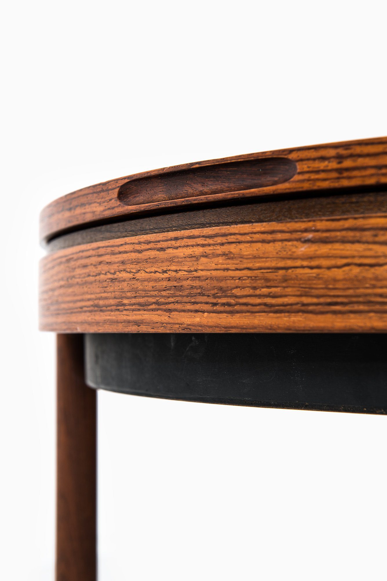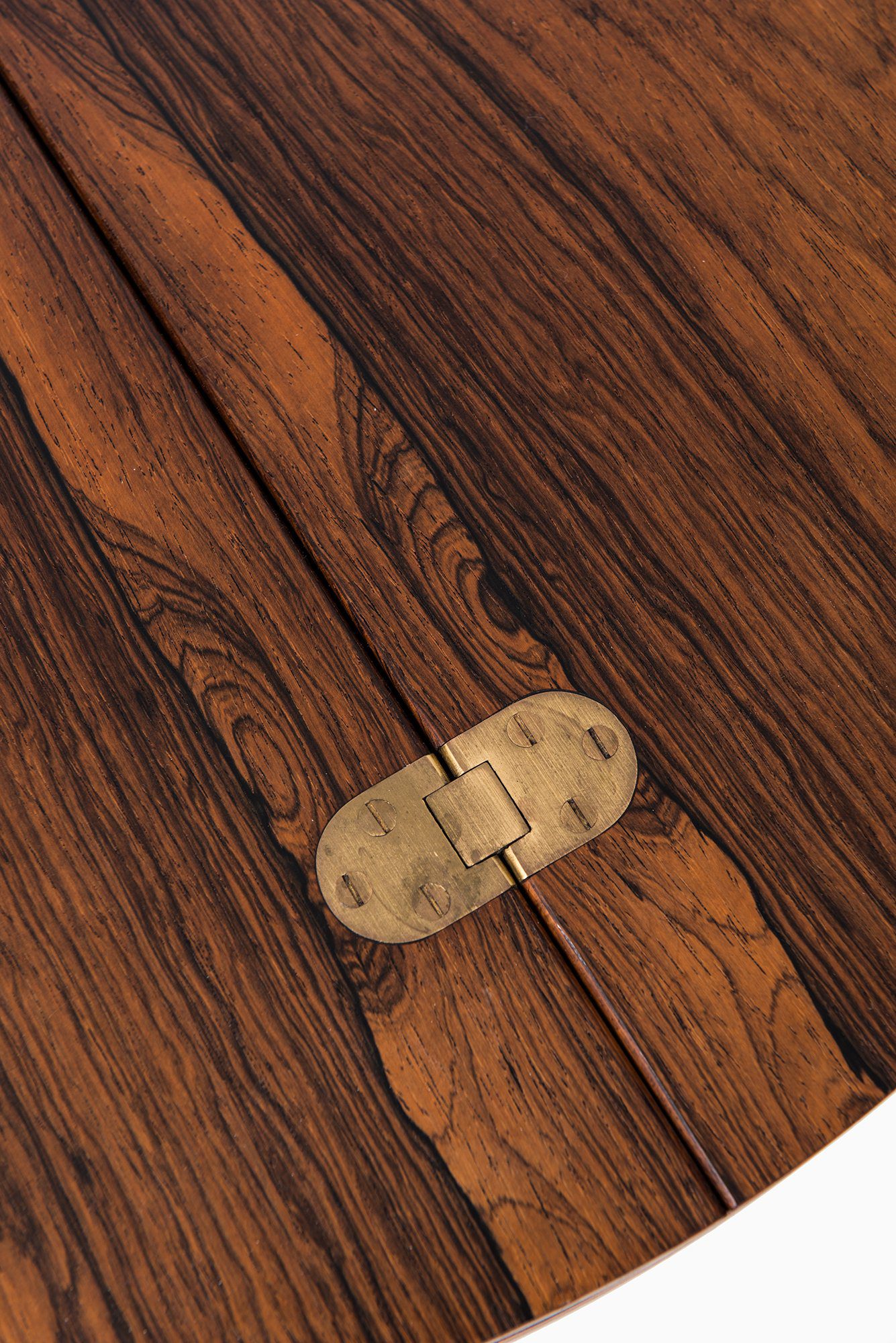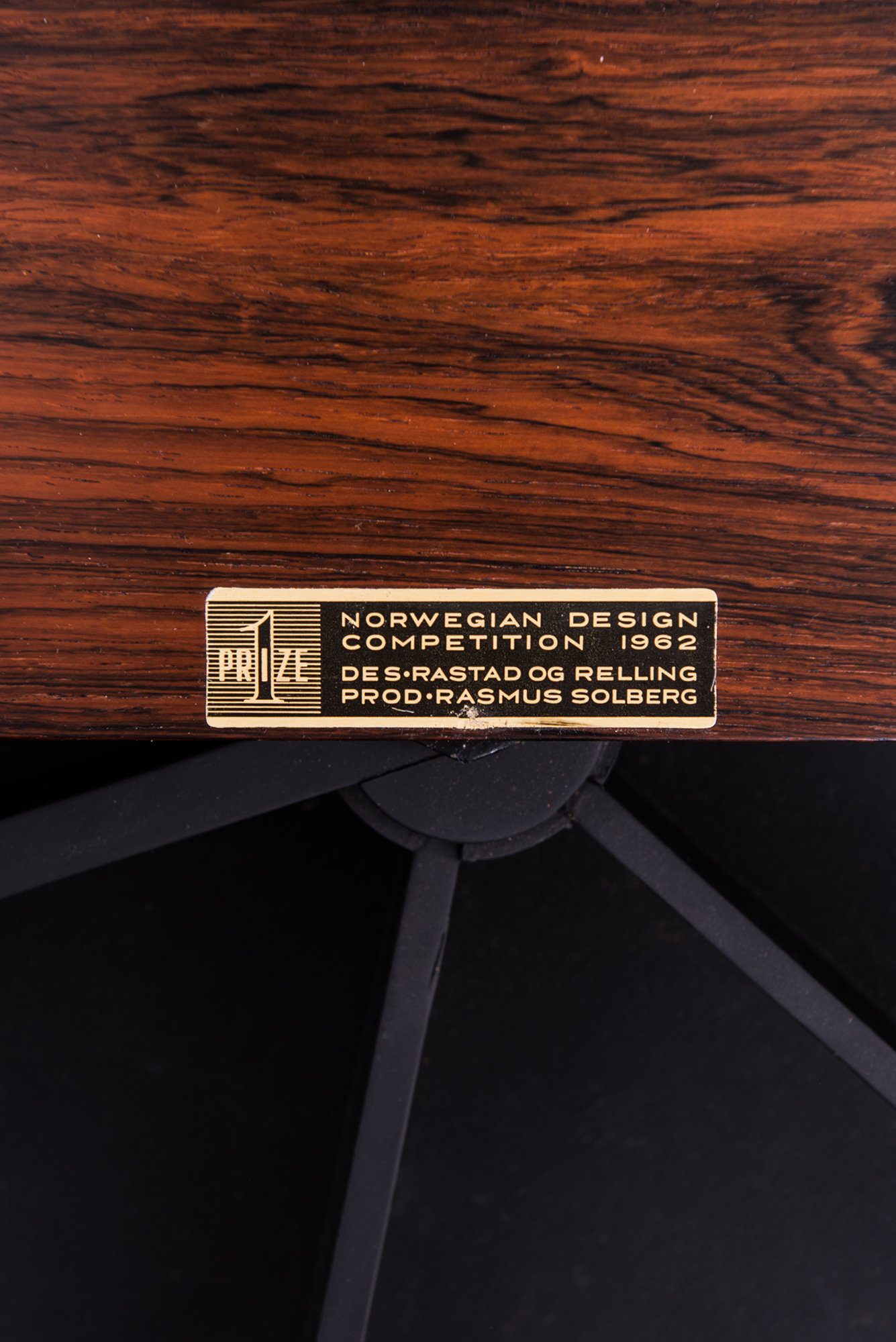 This rare side table is model Syklus, designed by Rolf Rastad and Adolf Relling and produced by Rasmus Solberg in Norway in 1962. The table is executed in rich Brazilian rosewood with visible, expressive grain patterns and brass hardware. The top consists of two hinged semicircles that pivot open to reveal a black lacquered storage compartment with divided sections, originally intended for bottles and bar accessories. The design balances functional storage with a refined sculptural presence.