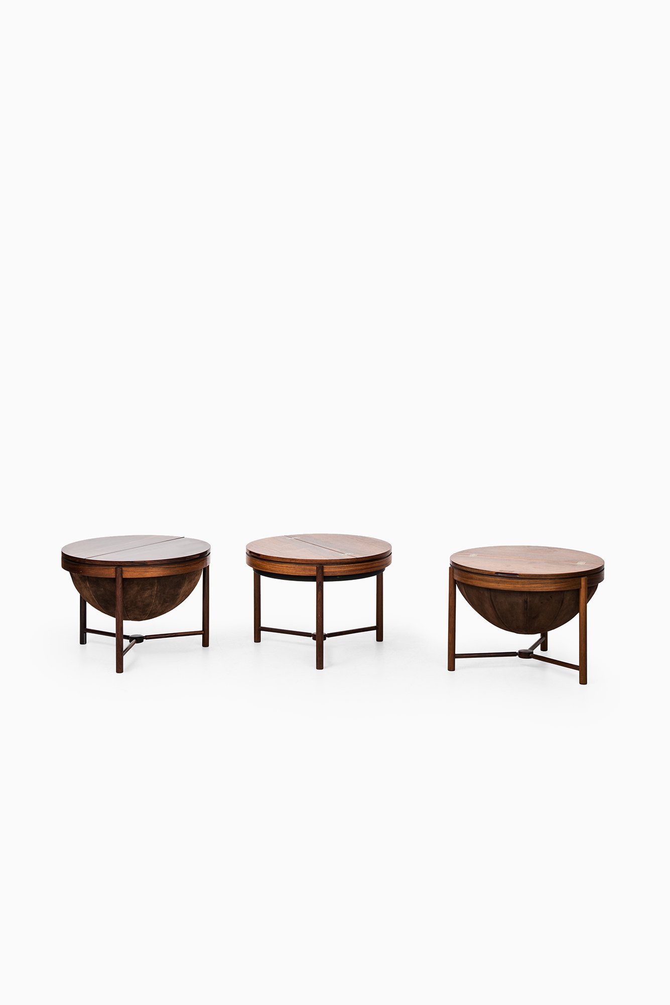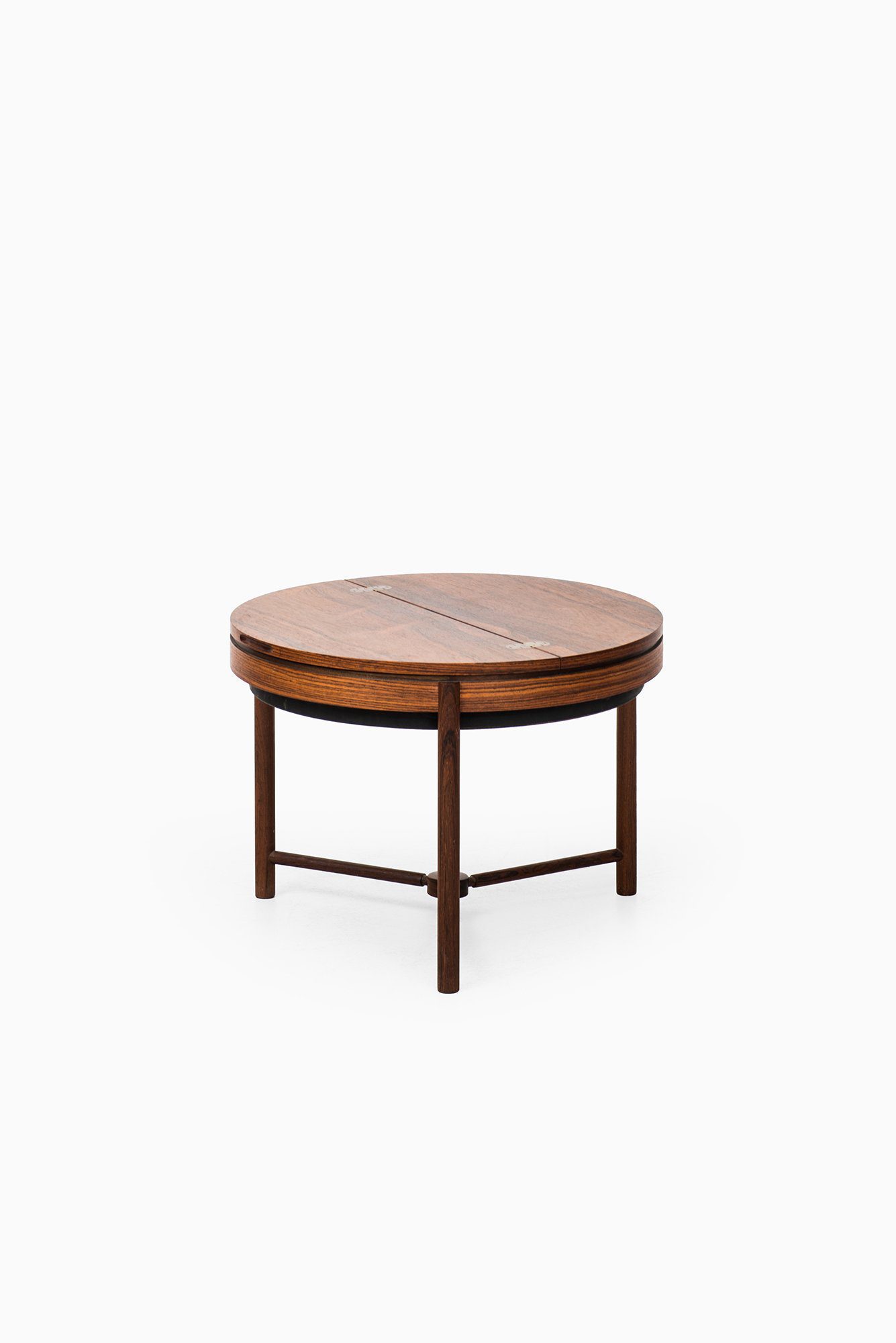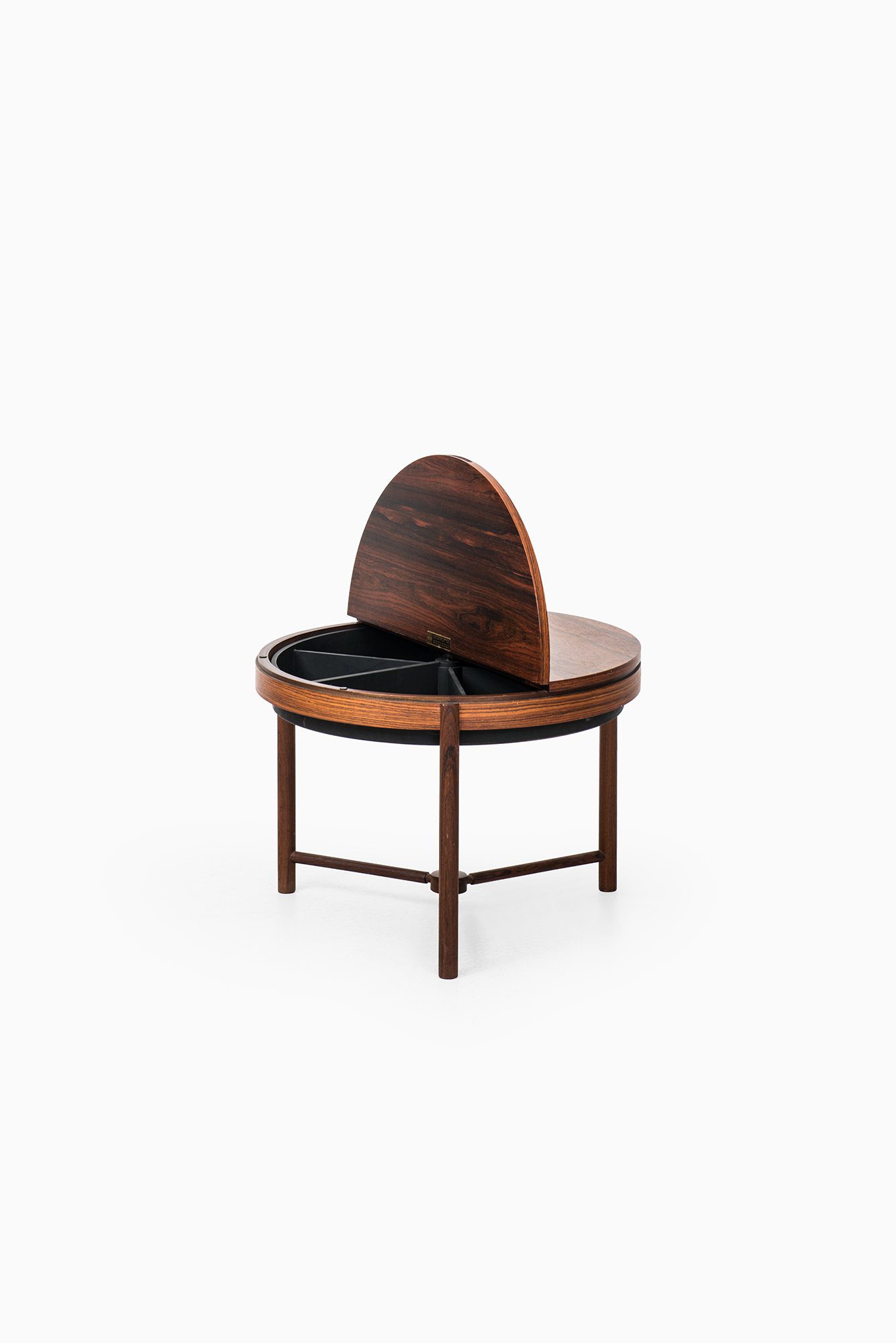 This rare side table is model Syklus, designed by Rolf Rastad and Adolf Relling and produced by Rasmus Solberg in Norway in 1962. The table is executed in rich Brazilian rosewood with visible, expressive grain patterns and brass hardware. The top consists of two hinged semicircles that pivot open to reveal a black lacquered storage compartment with divided sections, originally intended for bottles and bar accessories. The design balances functional storage with a refined sculptural presence.