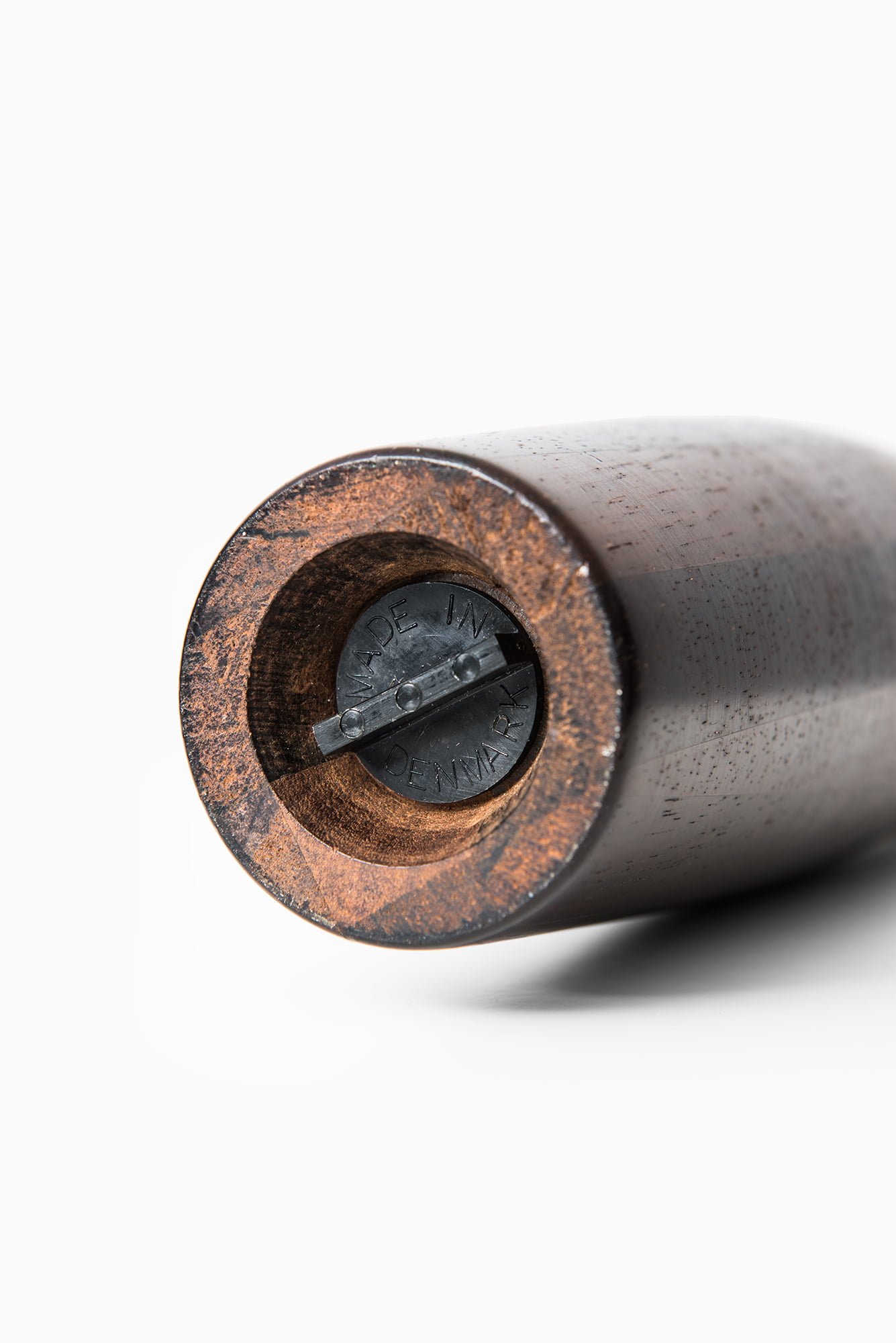 The object is in good vintage condition with minor signs of usage, consistent with its age and careful handling. The wood retains a fine polish that enhances the natural figure of the material. The underside shows the original Danish marking and houses the grinding mechanism, confirming its origin and functional authenticity.