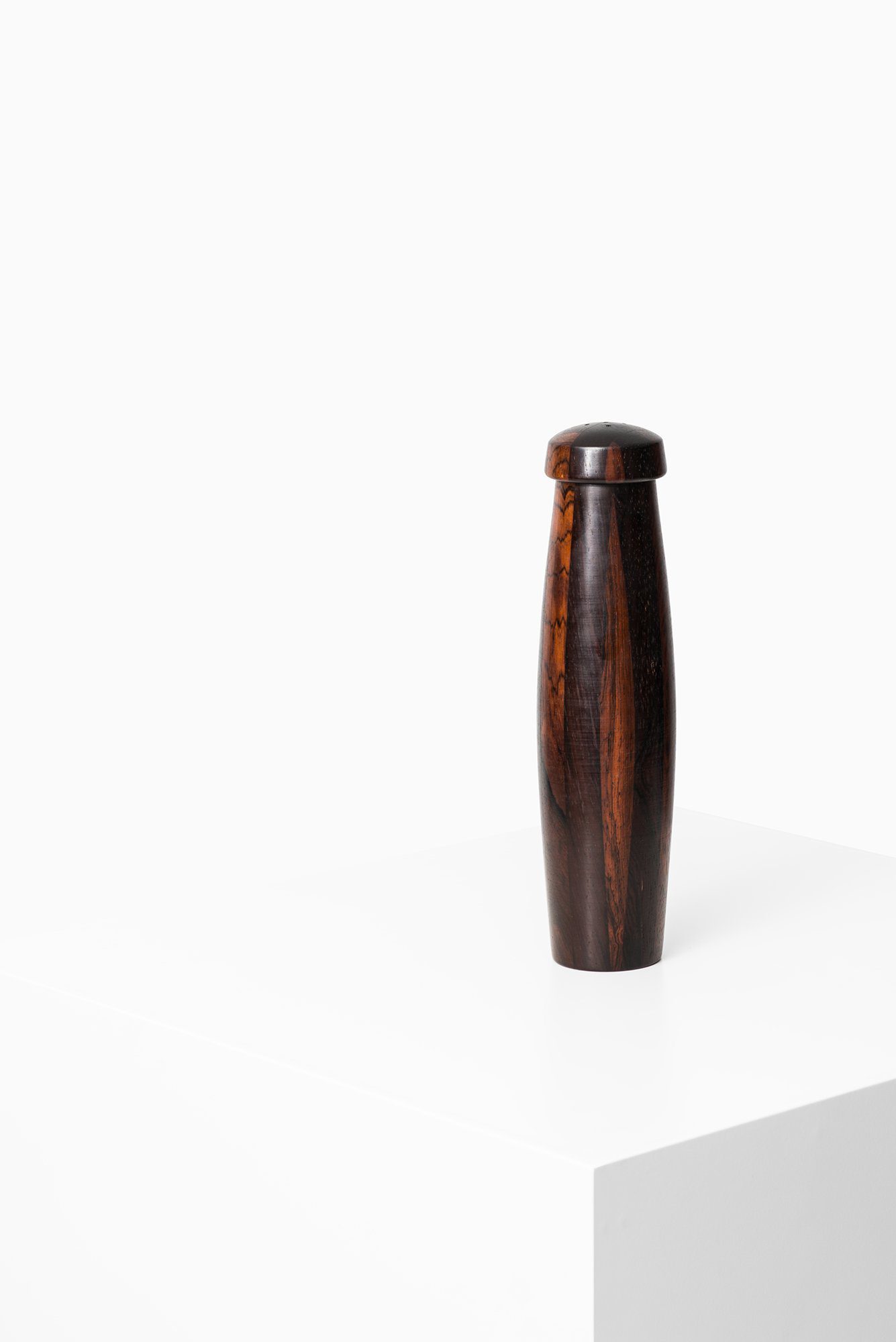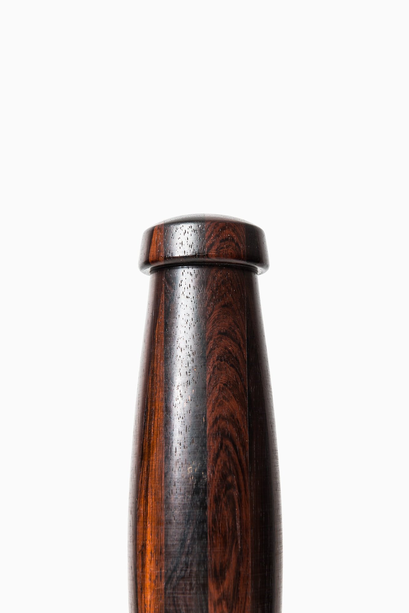 This is a large salt shaker crafted in solid rosewood, produced in Denmark during the 1960s. The object has a tall, elongated cylindrical body with a slightly tapering profile that gives it a refined and elegant silhouette. The top is rounded with a subtly protruding rim that separates the lid visually from the main body. The surface displays the characteristic deep brown and reddish tones of rosewood, with highly visible and dramatic grain patterns running vertically, adding a dynamic natural ornamentation to the piece.