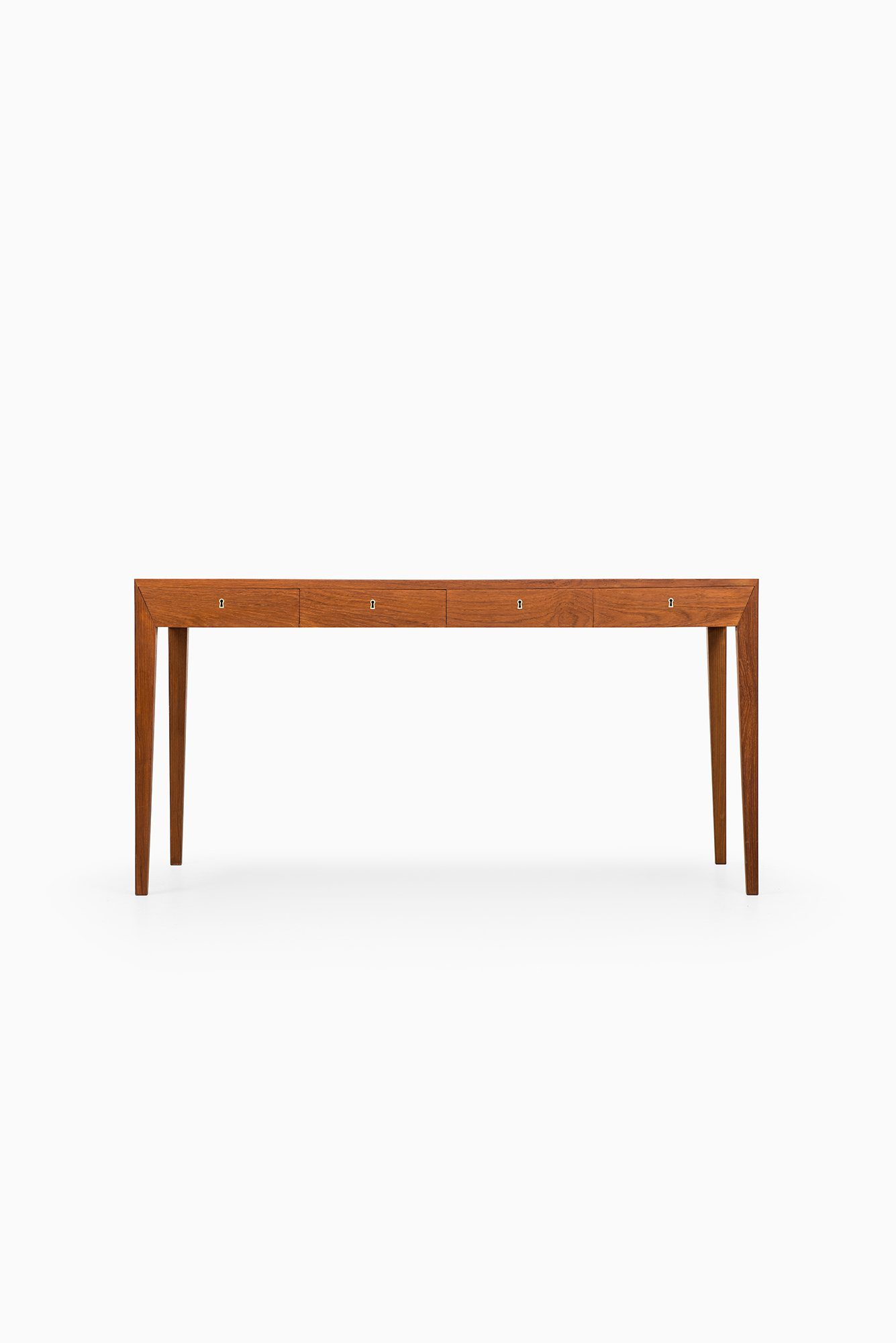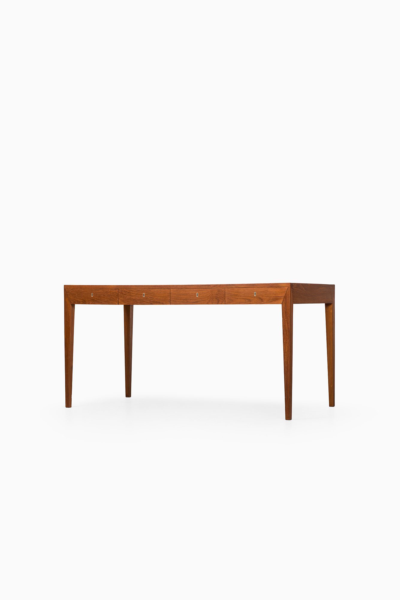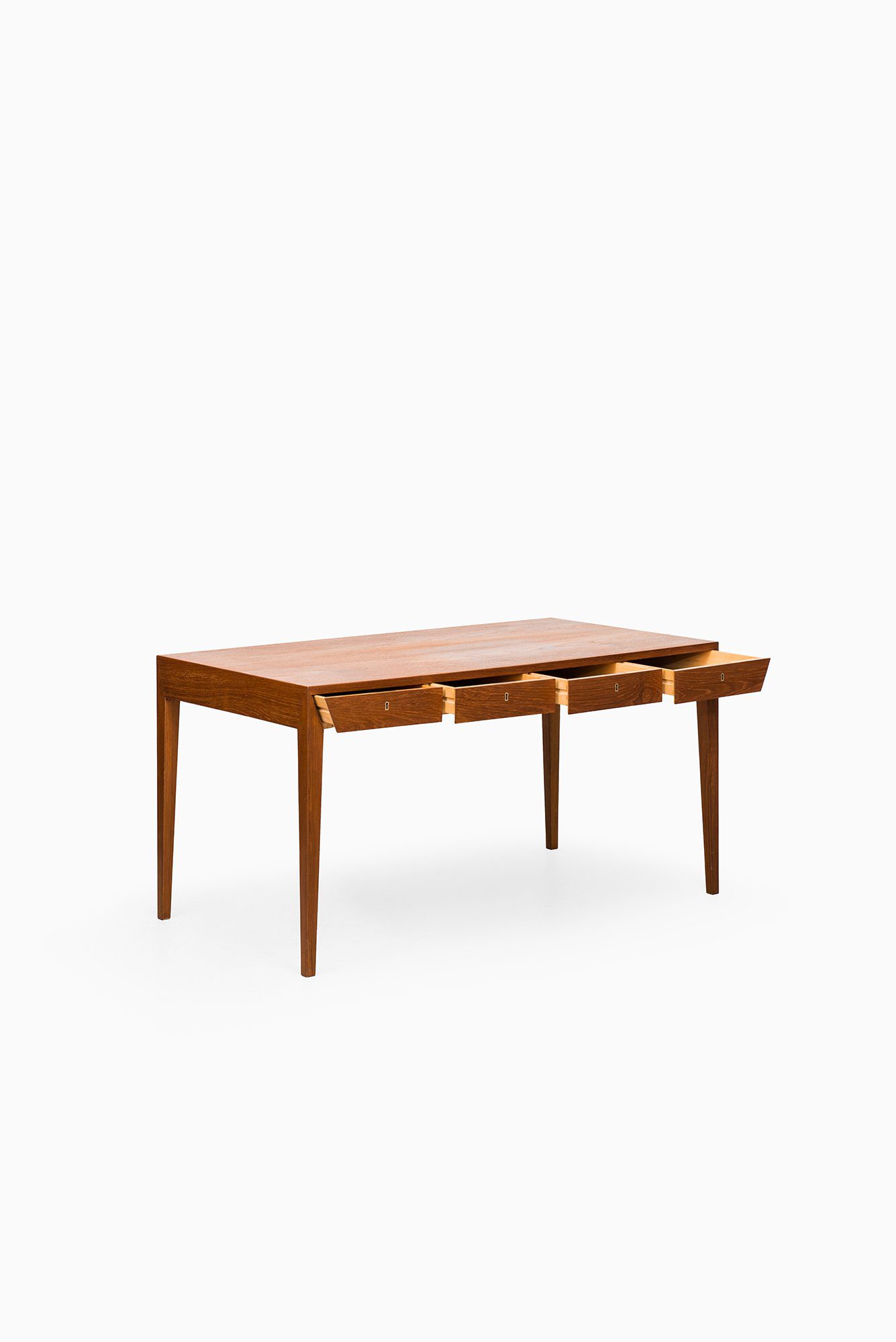 This rare freestanding desk was designed by Severin Hansen during the 1950s and produced by Haslev Møbelsnedkeri in Denmark. Executed in teak, the desk is a refined example of Hansen’s precise design language and his hallmark attention to structural detail. The rectangular top rests on four tapered legs, which are seamlessly integrated into the frame with his characteristic mitered corner joints, creating a clean and sharply defined silhouette.