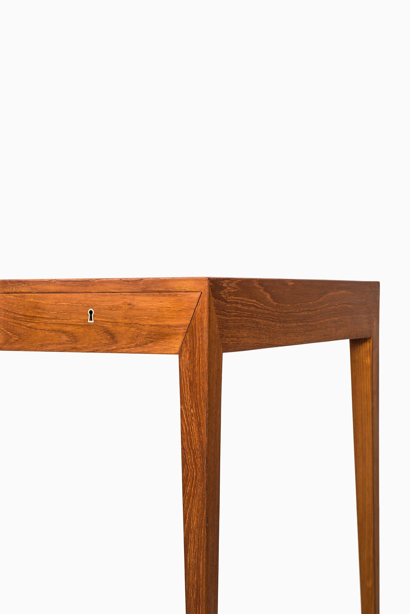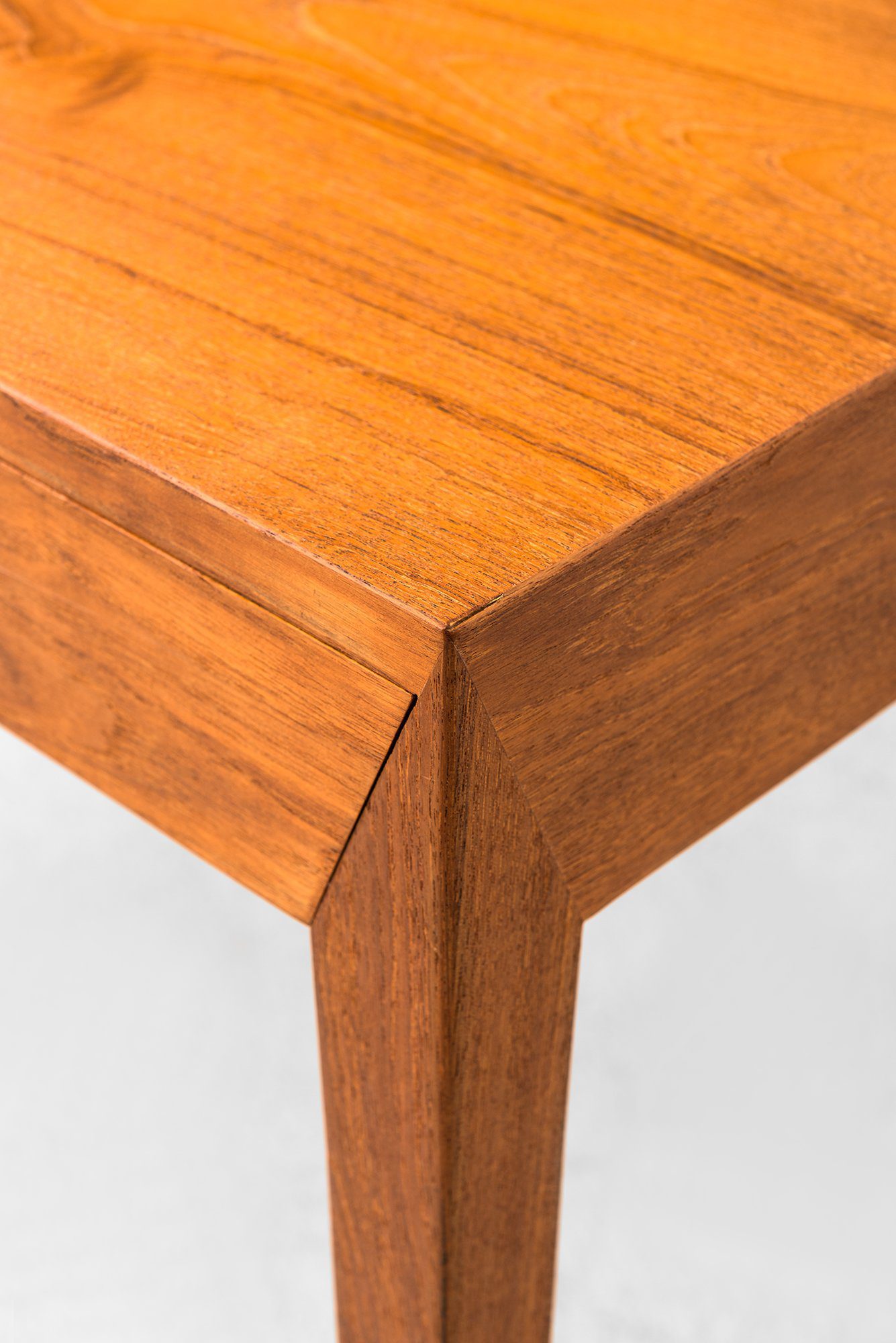 The desk is equipped with three front-facing drawers, each fitted with a discreet keyhole. The drawers are recessed into the apron, continuing the desk’s minimalistic character without disturbing its smooth visual rhythm. This understated detailing reflects Hansen’s ability to combine functional storage with a strong architectural presence. The craftsmanship of Haslev Møbelsnedkeri is evident in the precision of the joinery and the high-quality teak grain, which displays a warm hue with subtle variations that highlight the natural beauty of the material.