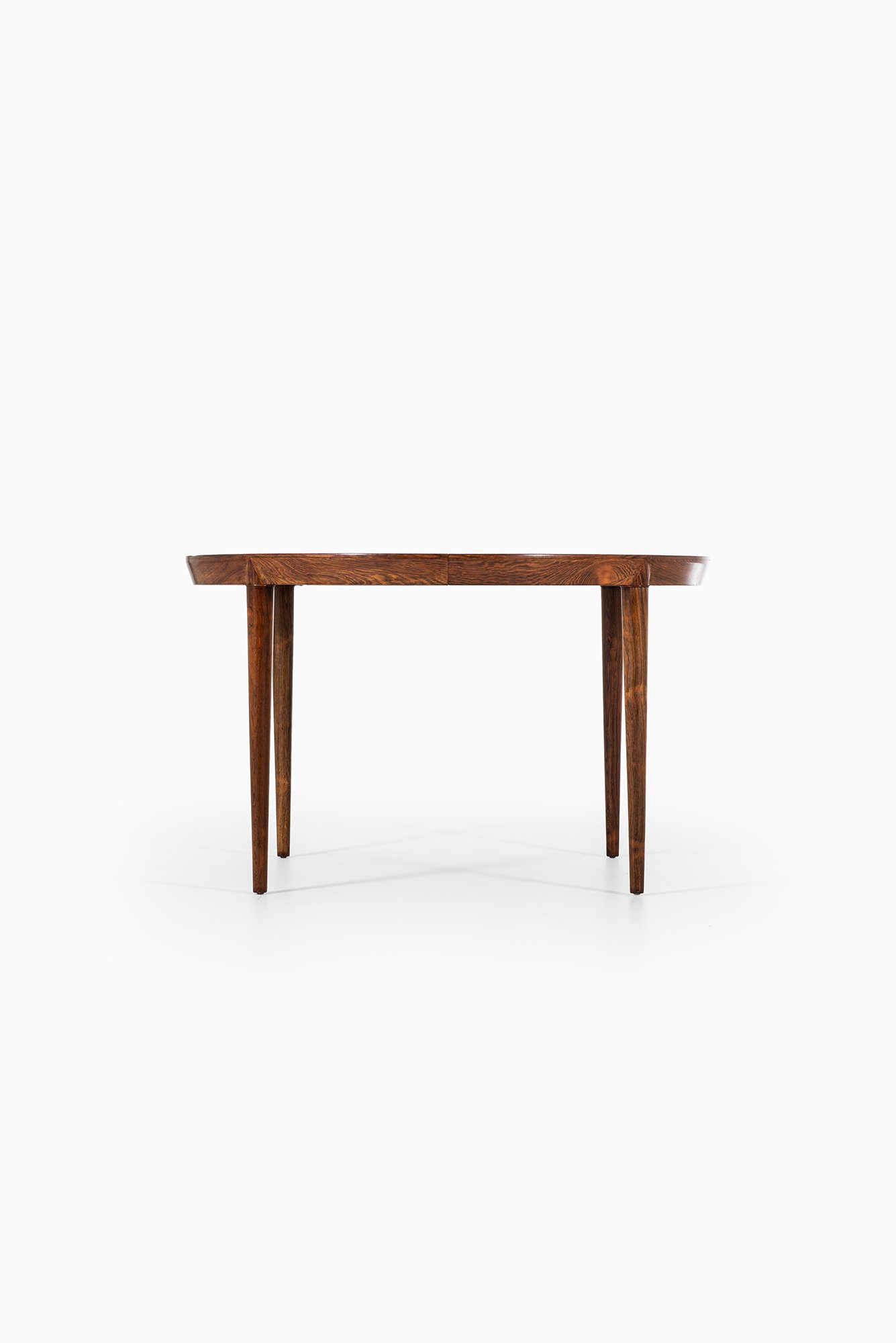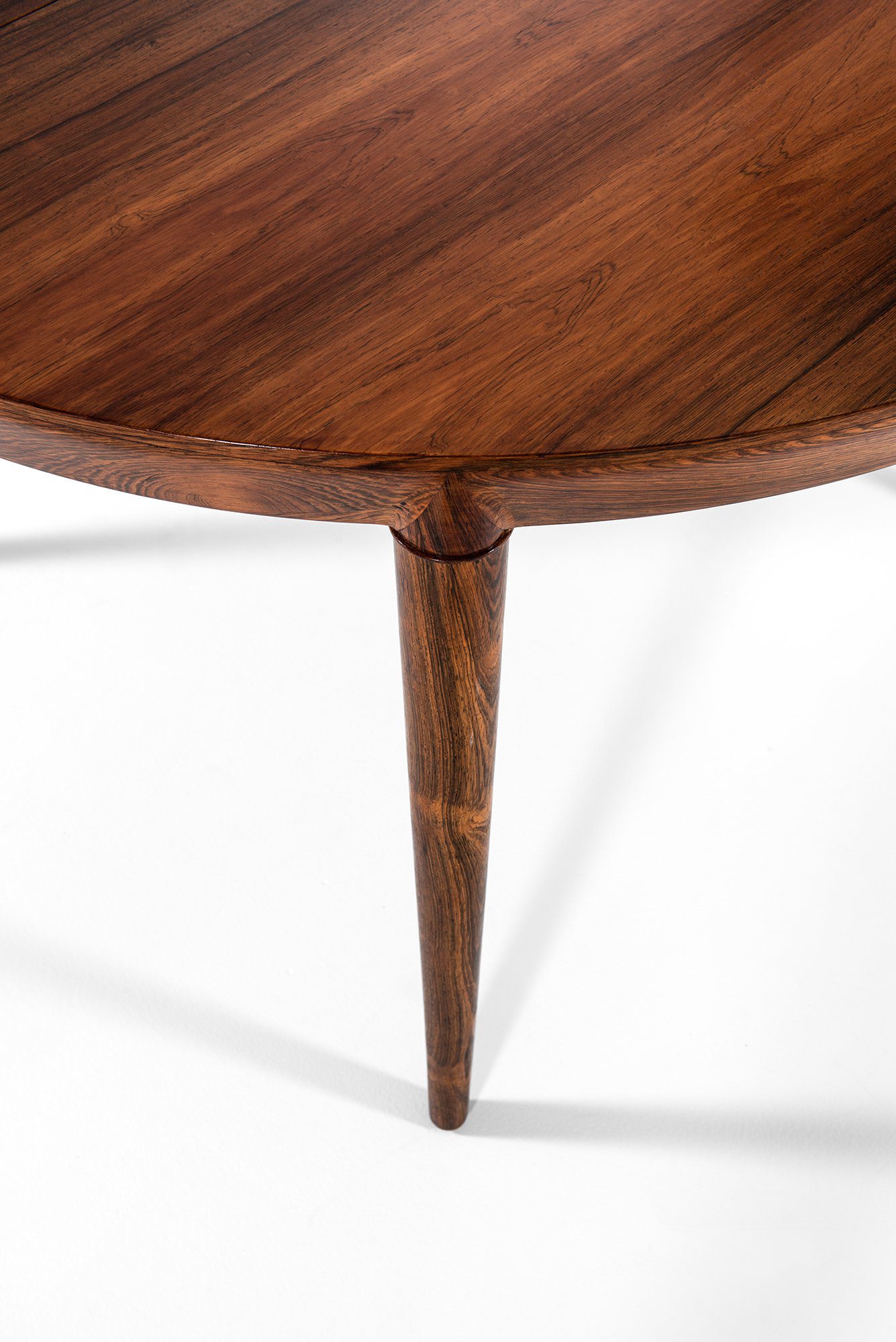 This example remains in excellent vintage condition with small, age-consistent signs of use. The surface retains its original finish, exhibiting a fine patina that enhances the depth of the rosewood grain. The dimensions are 117.5 cm in diameter, extendable to 216 cm in length, with a height of 71.5 cm, corresponding to approximately 46.3 inches (extendable to 85 inches) in length and 28.1 inches in height.