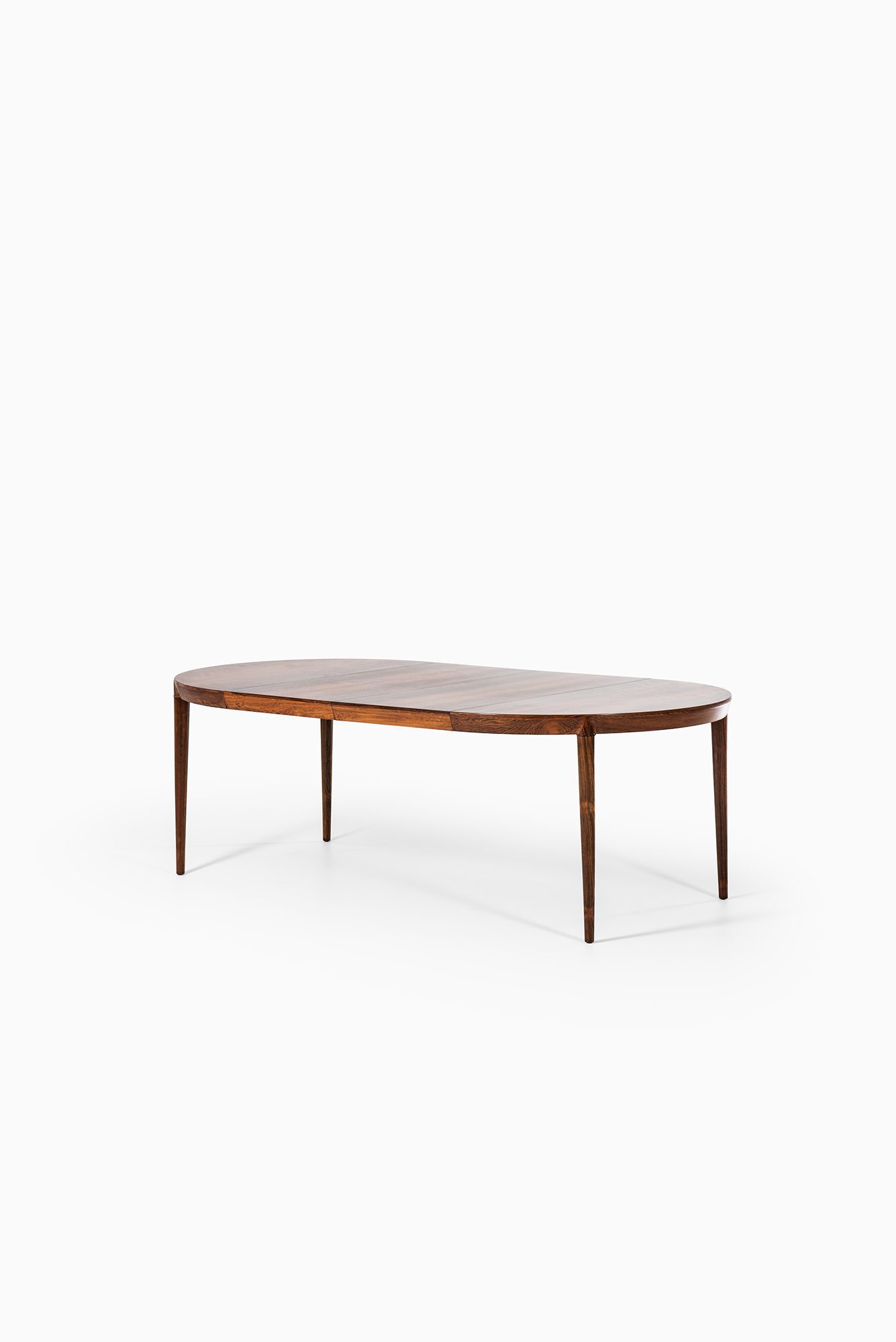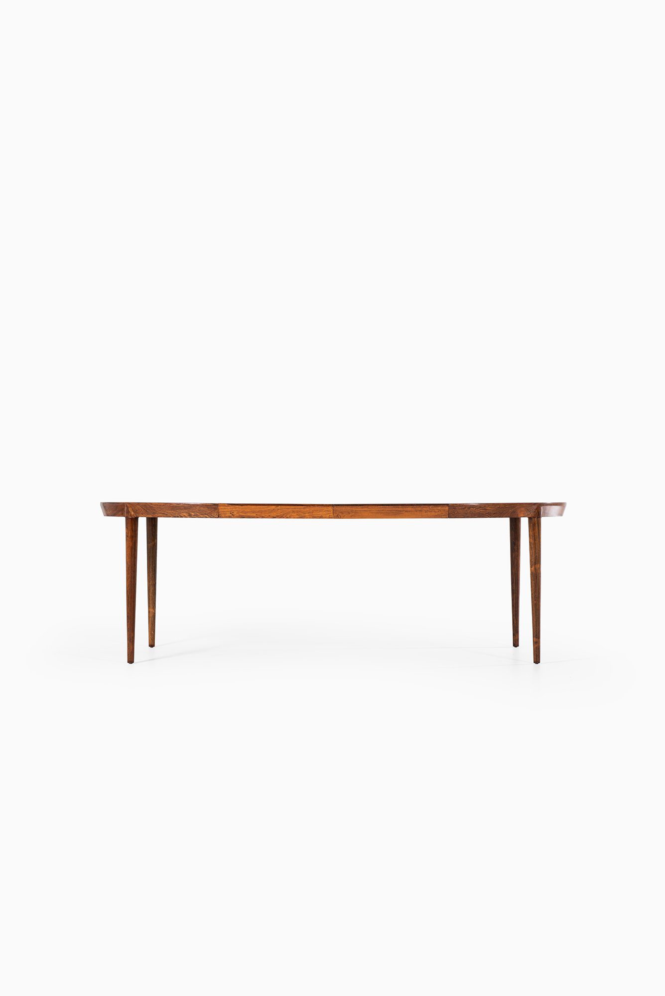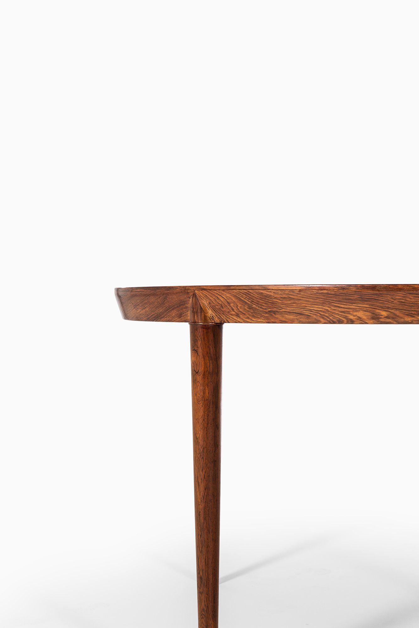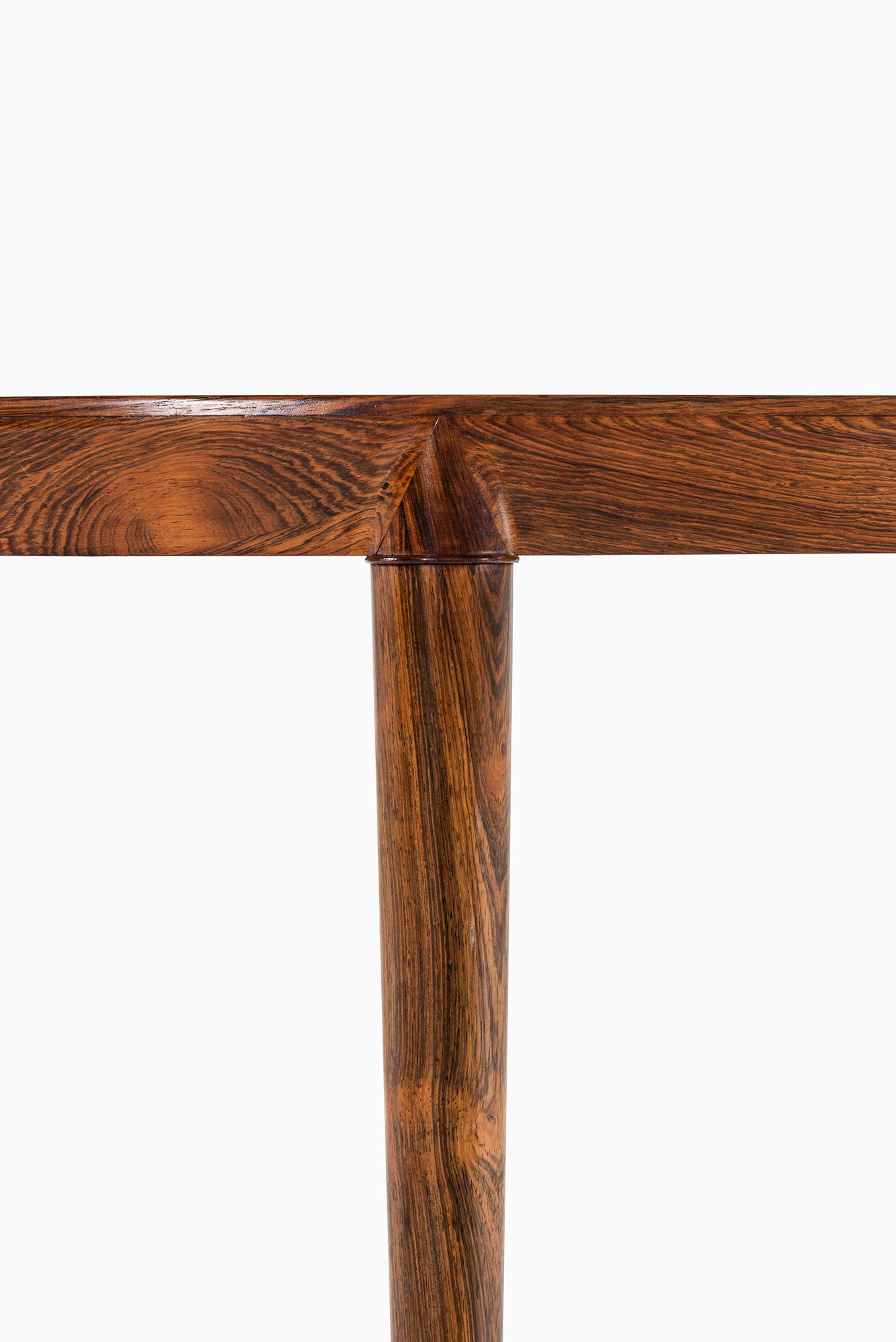 This dining table, model 71, was designed by Severin Hansen and produced by Haslev Møbelsnedkeri in Denmark during the 1960s. The table is crafted in rosewood, showcasing the refined craftsmanship and design precision characteristic of Danish mid-century furniture. The surface displays a rich wood grain with deep tonal variations, emphasizing the natural texture and warmth of the material. The table’s proportions are carefully balanced, with softly rounded edges and tapered legs that merge seamlessly into the frame.