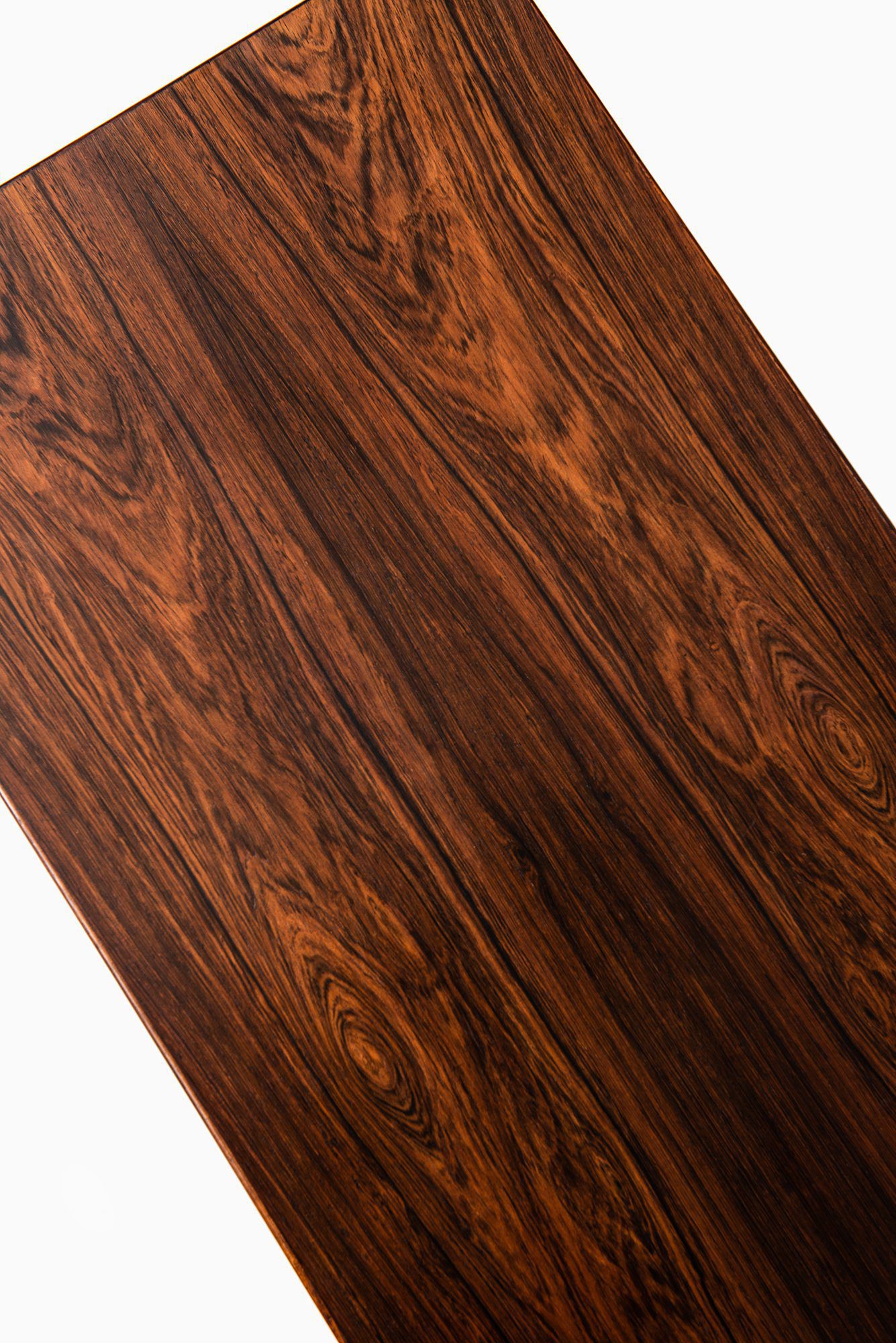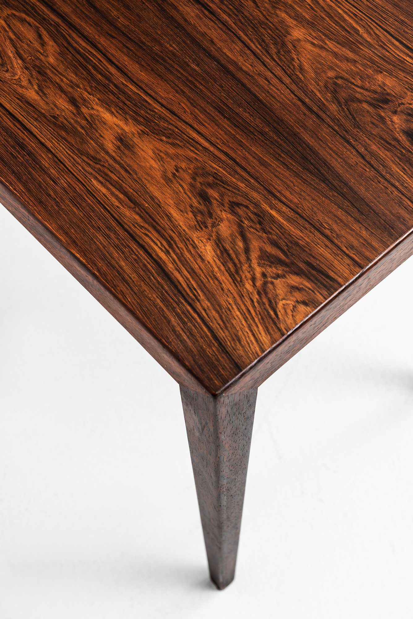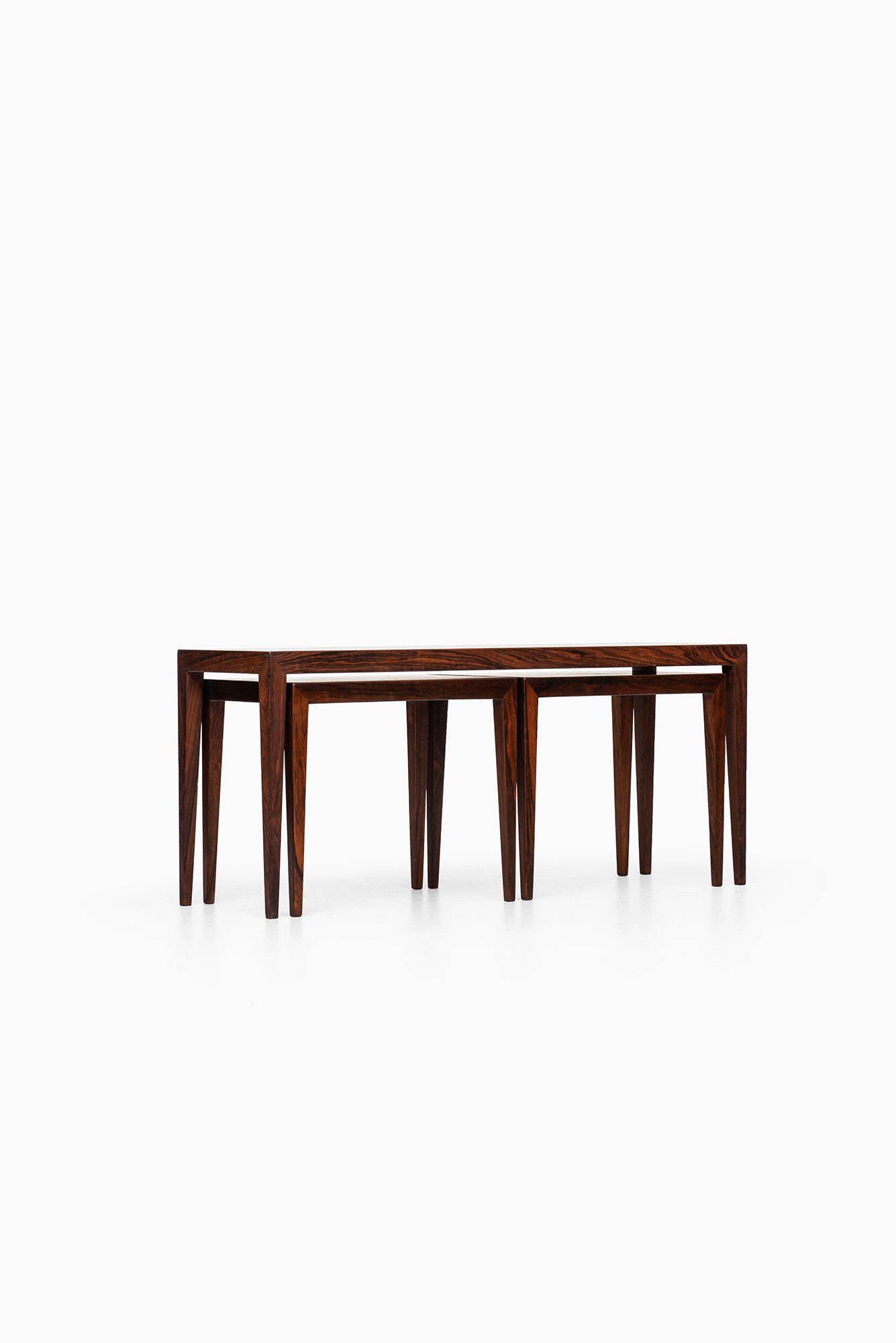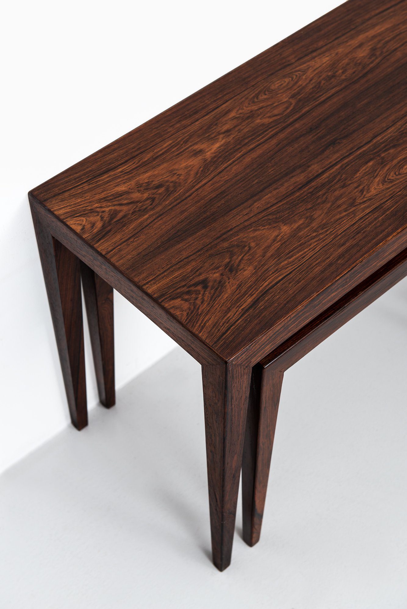 This set of three nesting tables was designed by Severin Hansen and produced by Haslev Møbelsnedkeri in Denmark during the 1950s. Executed in rosewood, the tables exemplify Hansen’s architectural approach to furniture design, characterized by sharp geometry and precise craftsmanship. The triangular joinery of the legs into the frame is a signature element, reflecting the precision and refinement typical of Danish modern cabinetmaking from this period.