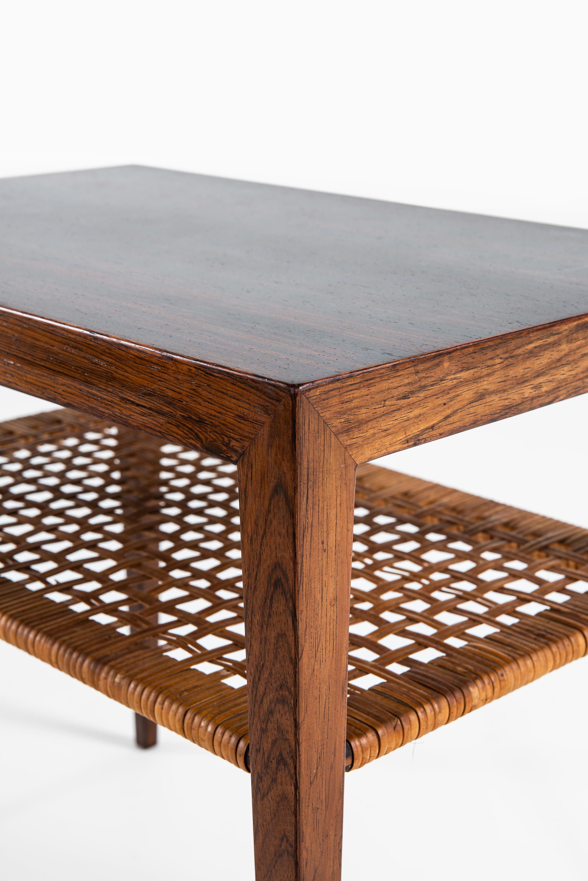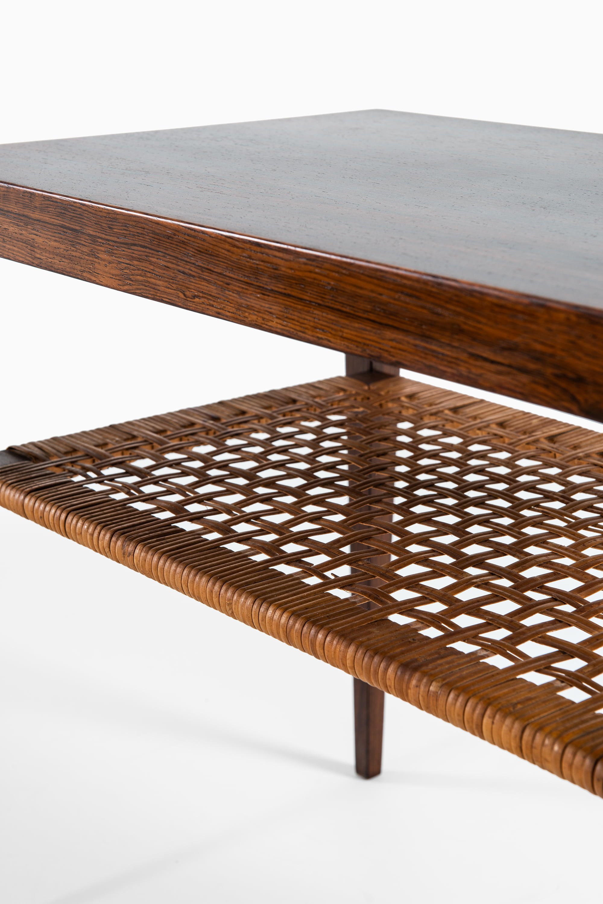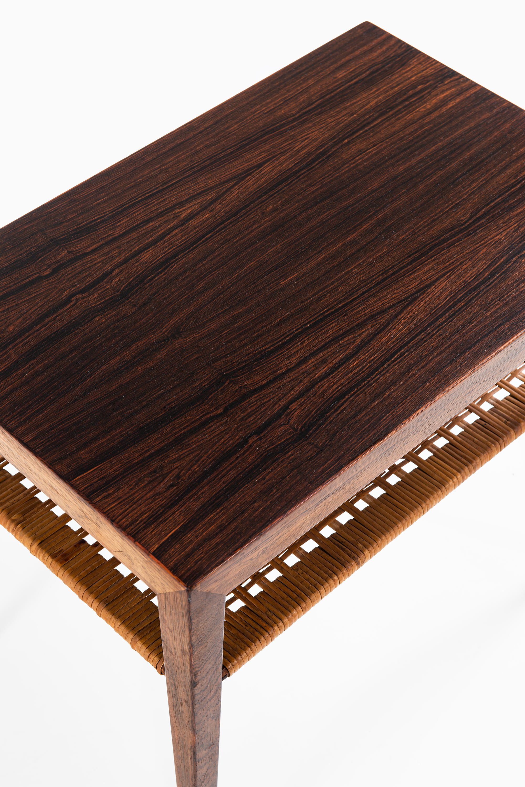 The table is crafted in richly grained rosewood, known for its deep brown tones and striking natural pattern, which give the piece a warm and sophisticated character. Its construction is defined by Hansen’s signature joinery technique, with sharp, mitred edges and precise transitions that highlight the quality of the cabinetmaking. Beneath the tabletop, a woven cane shelf adds both a functional storage element and a visual lightness, contrasting beautifully with the dense wood while maintaining a cohesive, organic look.