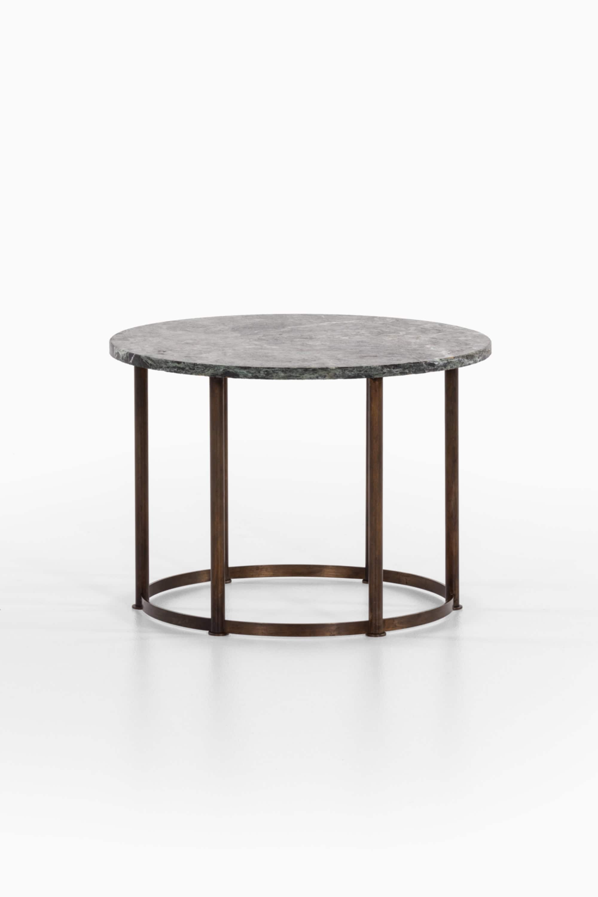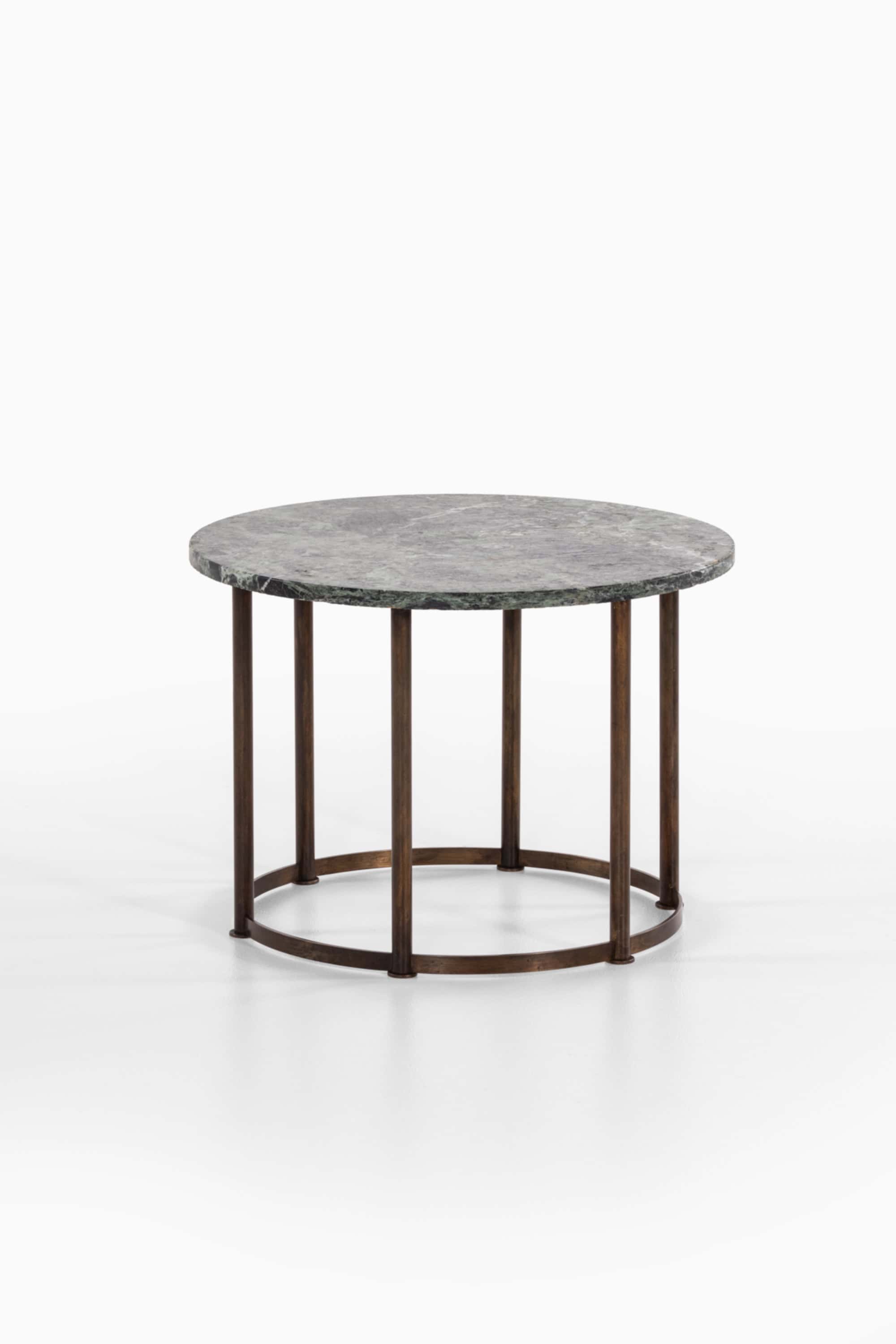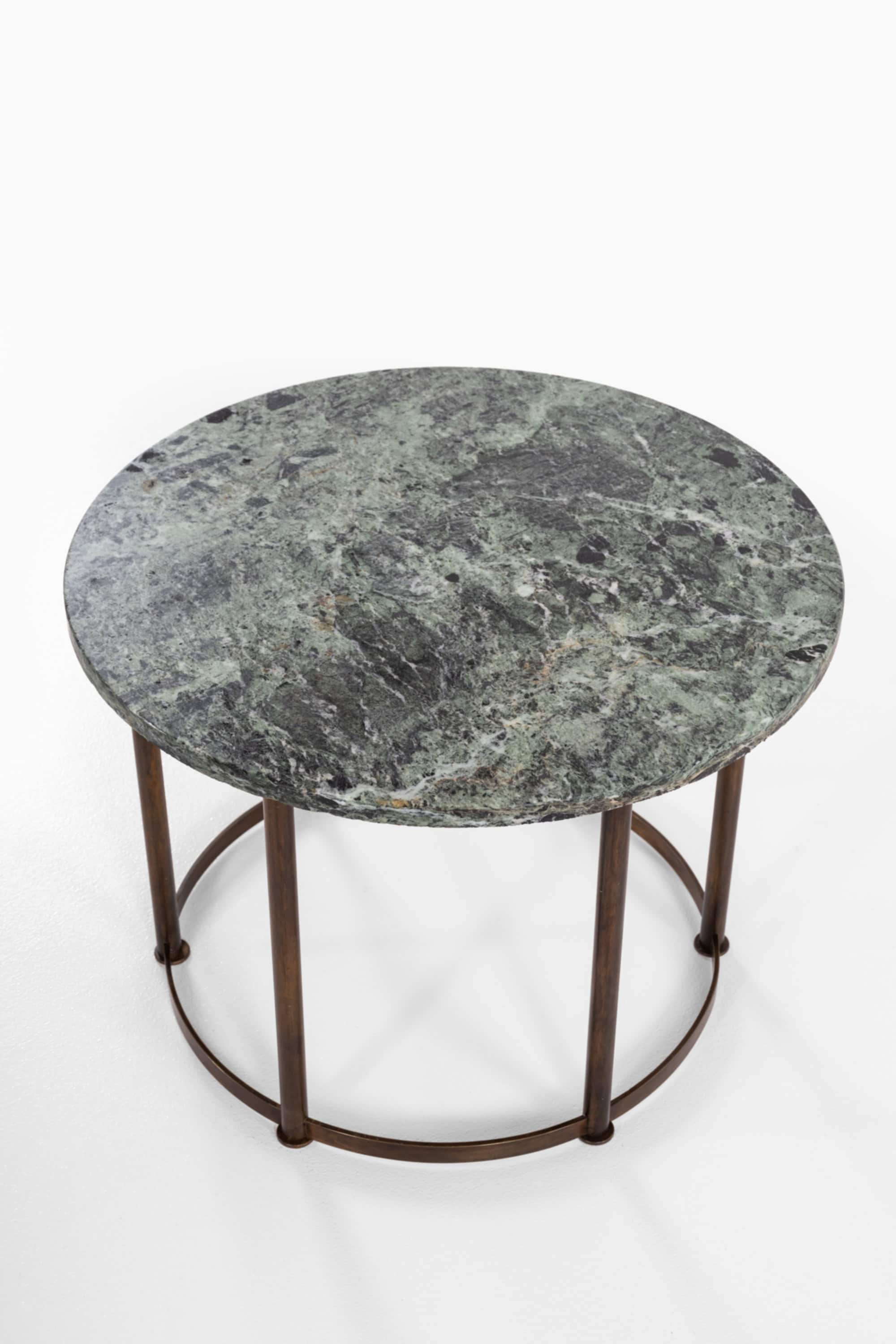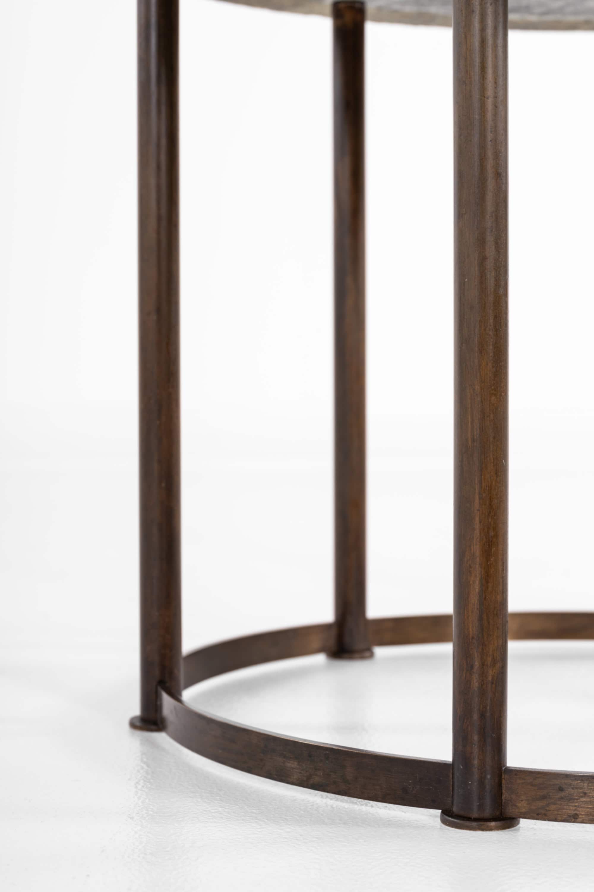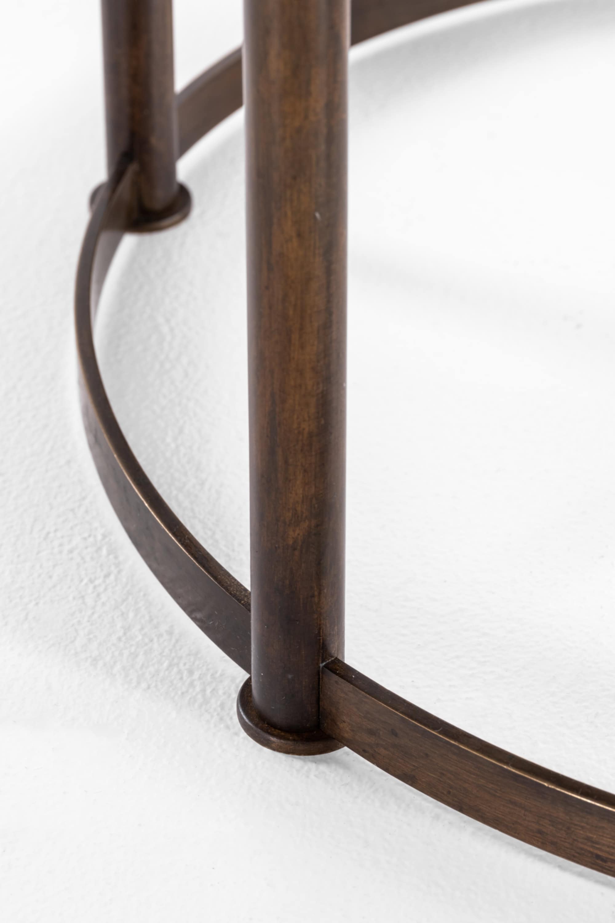 The base consists of solid brass legs with a warm, naturally aged patina. The vertical cylindrical legs are evenly spaced and connected by a circular brass stretcher near the floor, creating a rhythmic colonnade effect. This lower ring both stabilizes the construction and reinforces the strict geometric language typical of Danish Art Deco. The contrast between the cool, expressive marble and the warm brass structure results in a balanced interplay of materials, texture, and tone.