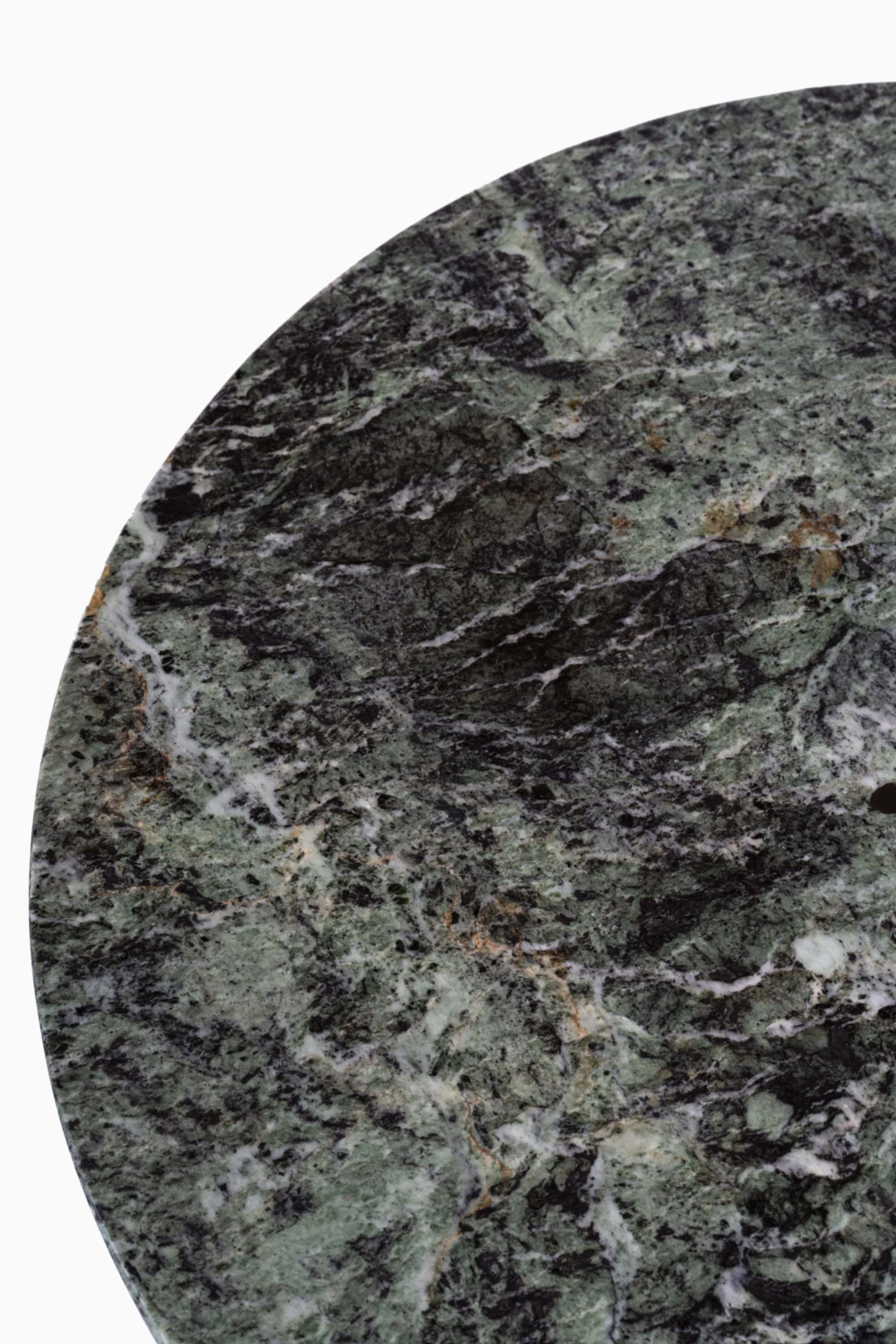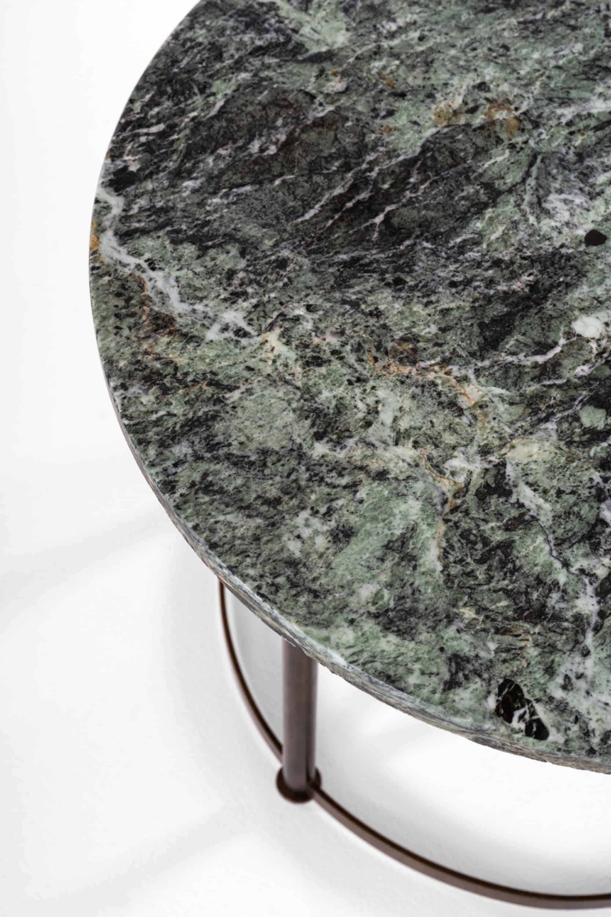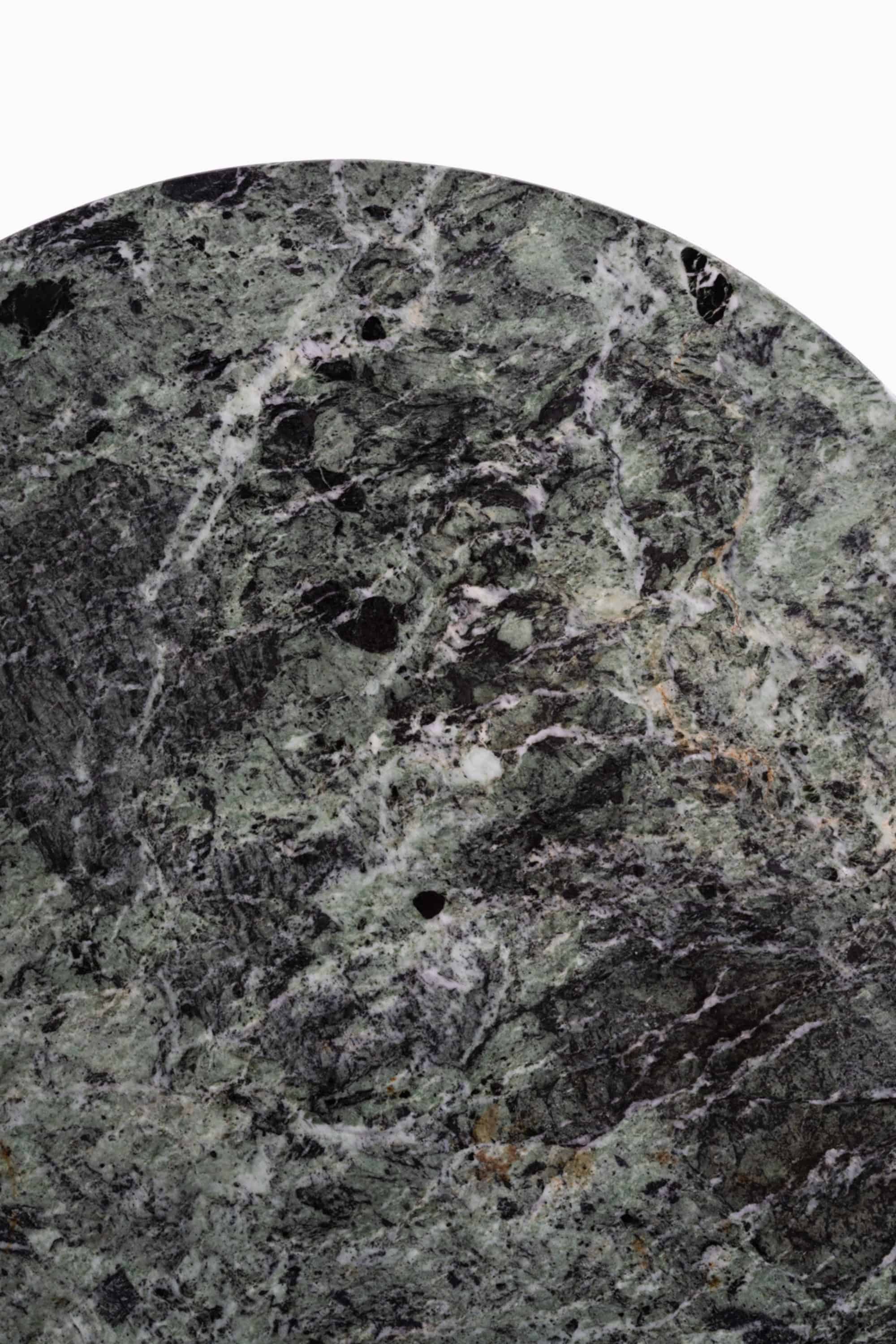 The circular top is executed in green marble, richly patterned with deep forest tones, lighter sage hues, and contrasting veins in white and dark mineral inclusions. The stone has a vivid, organic surface movement, characteristic of high-quality European marble used during the interwar period. The edge is gently rounded, giving the substantial slab a softened profile while maintaining its visual weight.