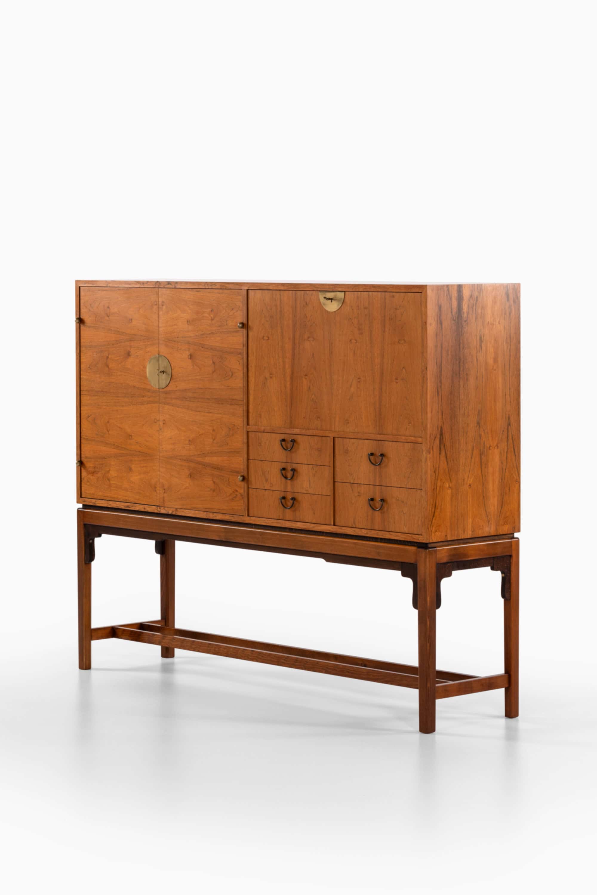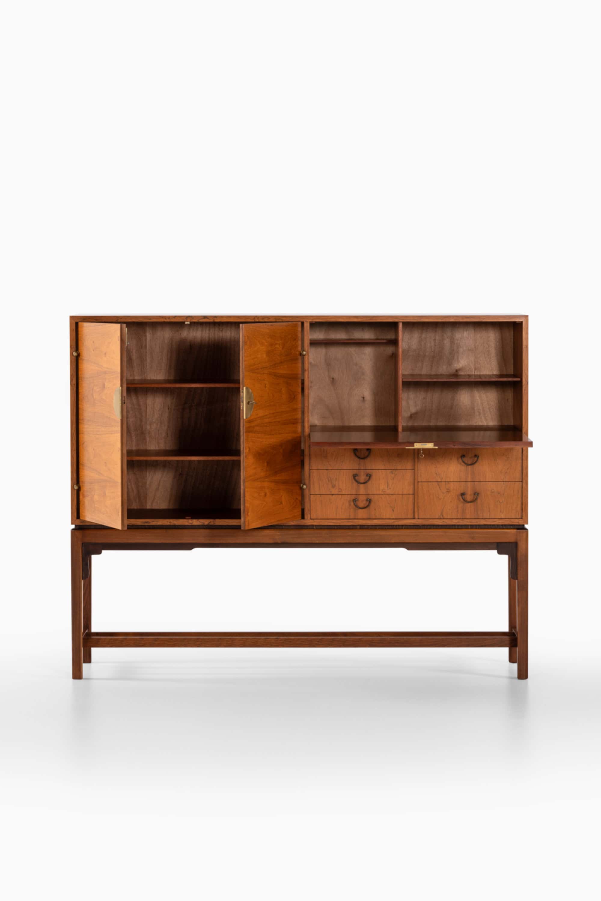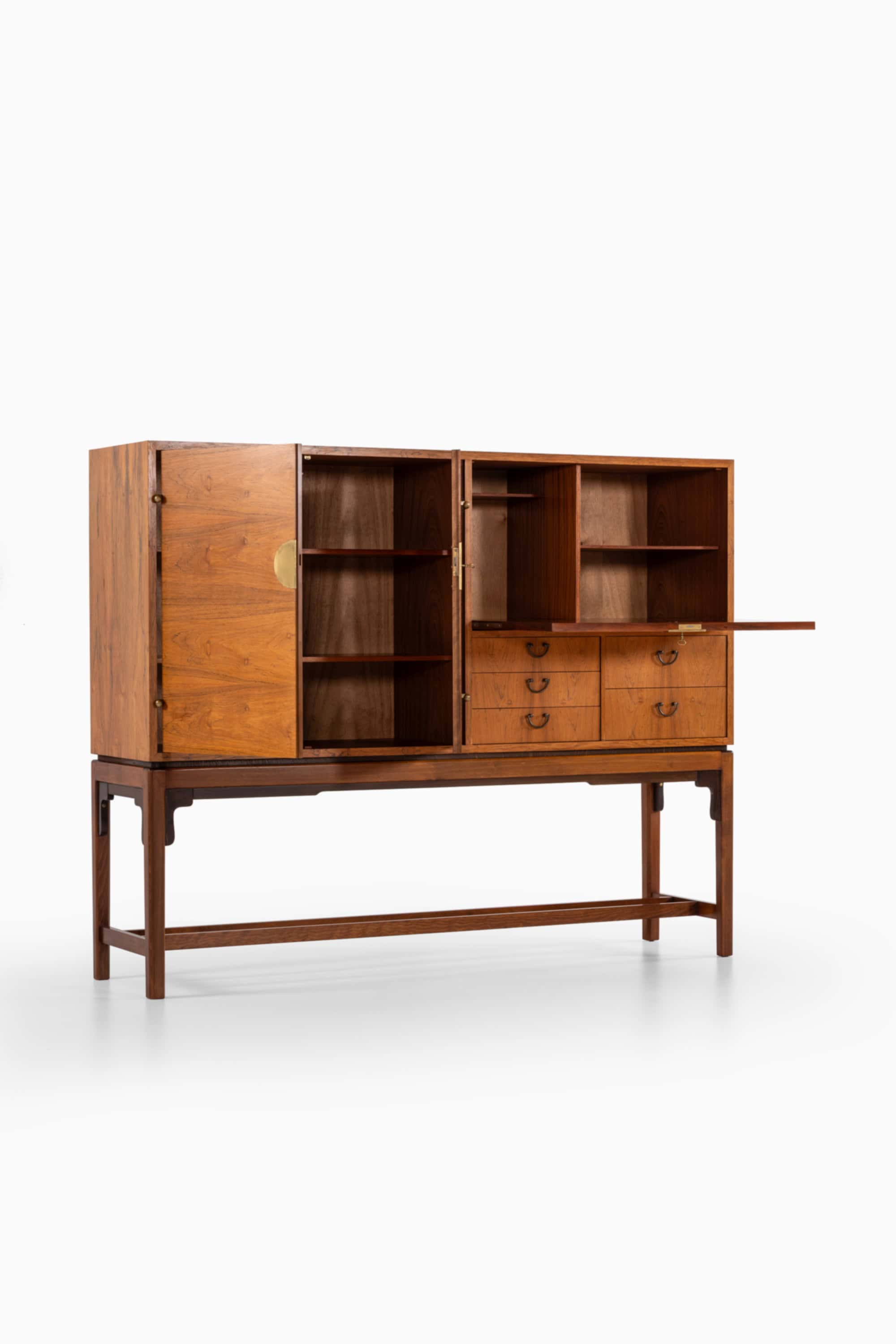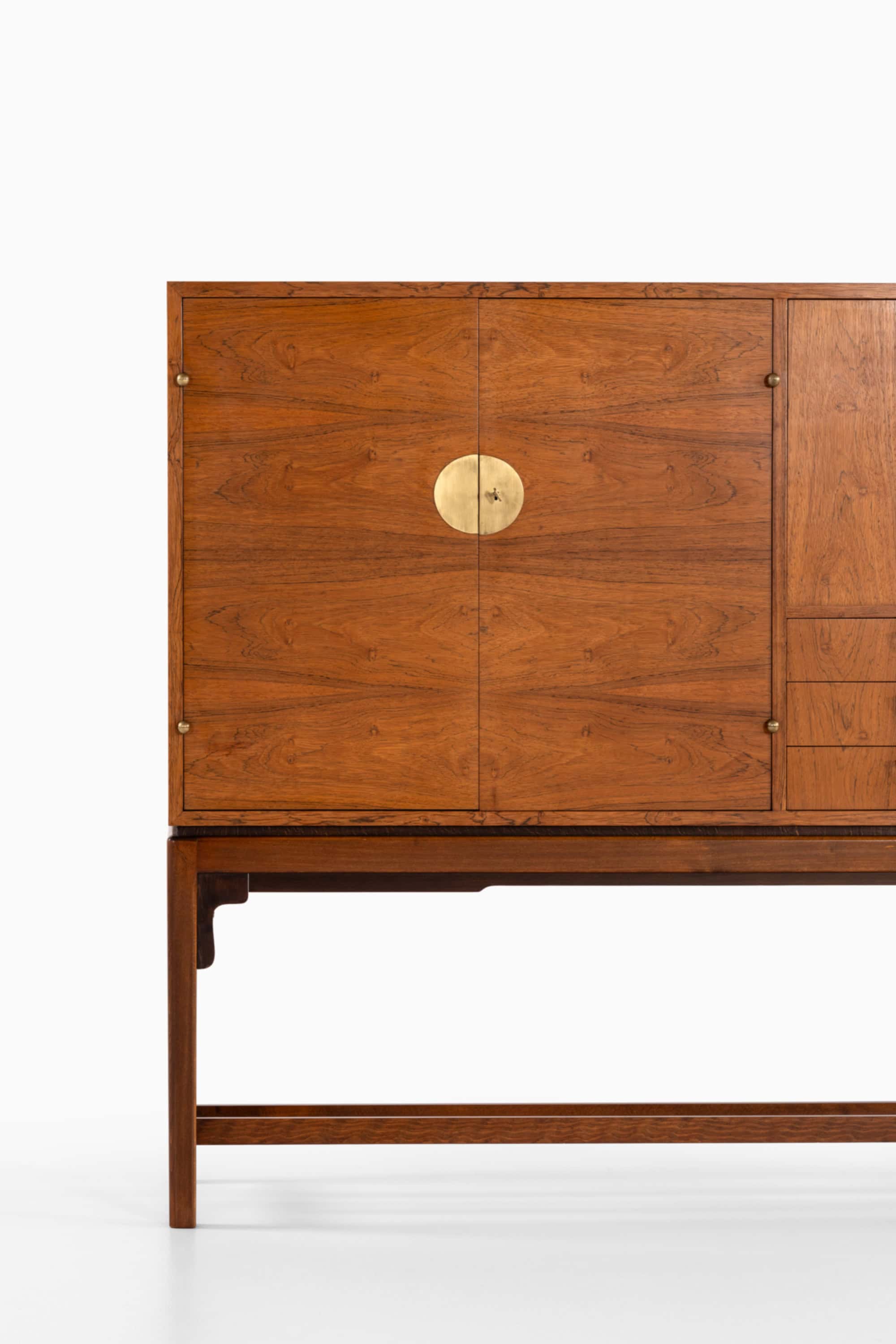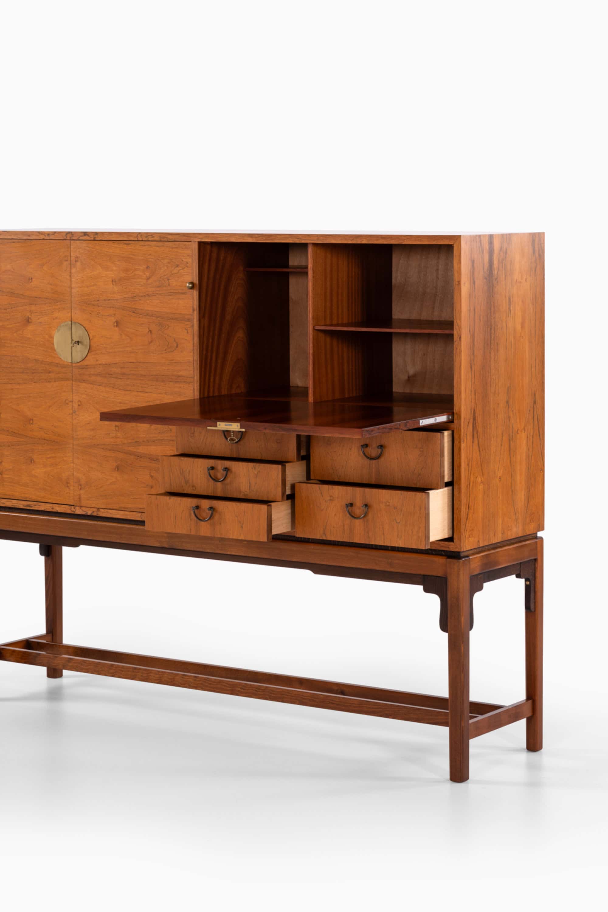 Although the designer remains unidentified, the sideboard demonstrates characteristics associated with high-quality Swedish production in the 1960s, including precise joinery, well-balanced proportions, and restrained decorative detailing. The integration of rosewood veneer and brass fittings aligns with the era’s interest in luxurious yet controlled material expression, typical of Scandinavian modernism during the late mid-century period.