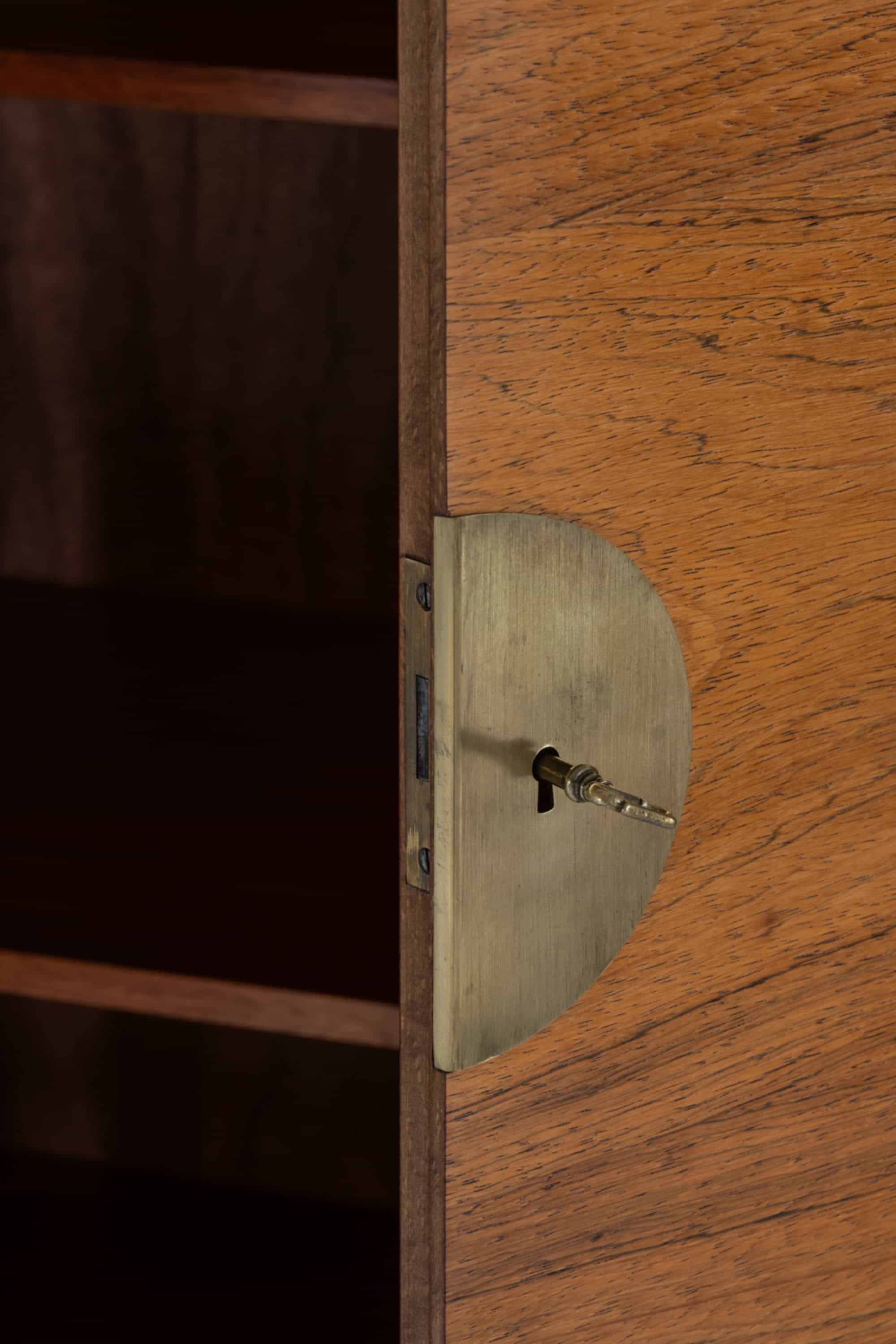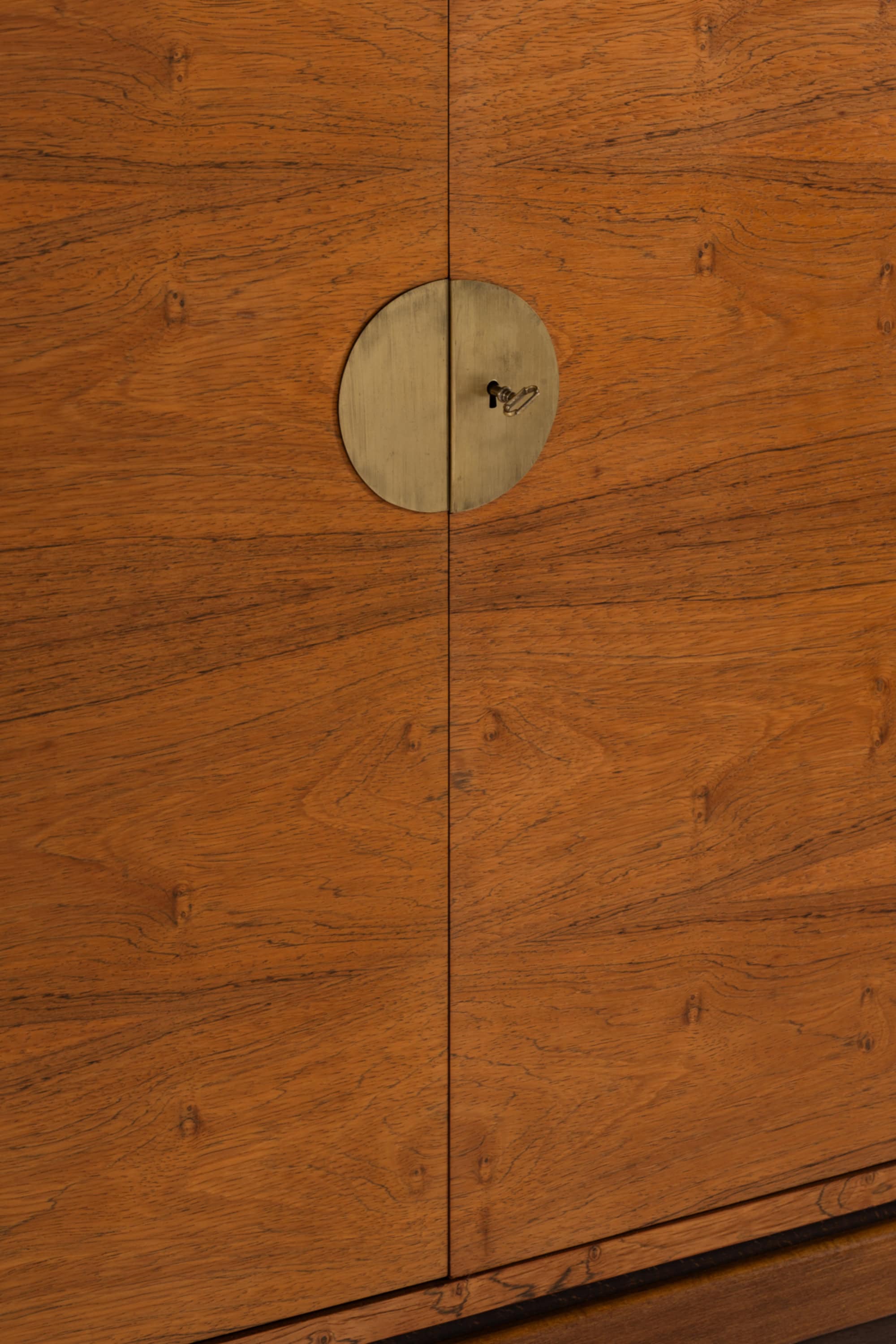 The cabinet is executed in rosewood, displaying a rich reddish-brown tone with pronounced black veining and symmetrical grain patterns across the doors. The veneer layout on the double doors is carefully mirrored, creating a balanced and decorative front while maintaining a strict geometric composition. The brass hardware forms a central circular escutcheon on the larger cabinet doors, functioning both as a visual focal point and as a locking mechanism. Smaller brass fittings and pulls complement the overall composition, introducing a subtle contrast between the warm wood and the muted golden metal surfaces.
