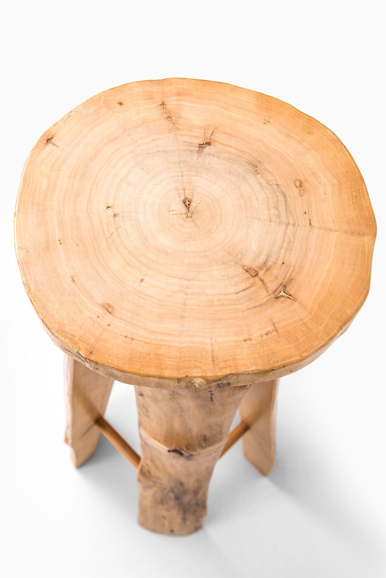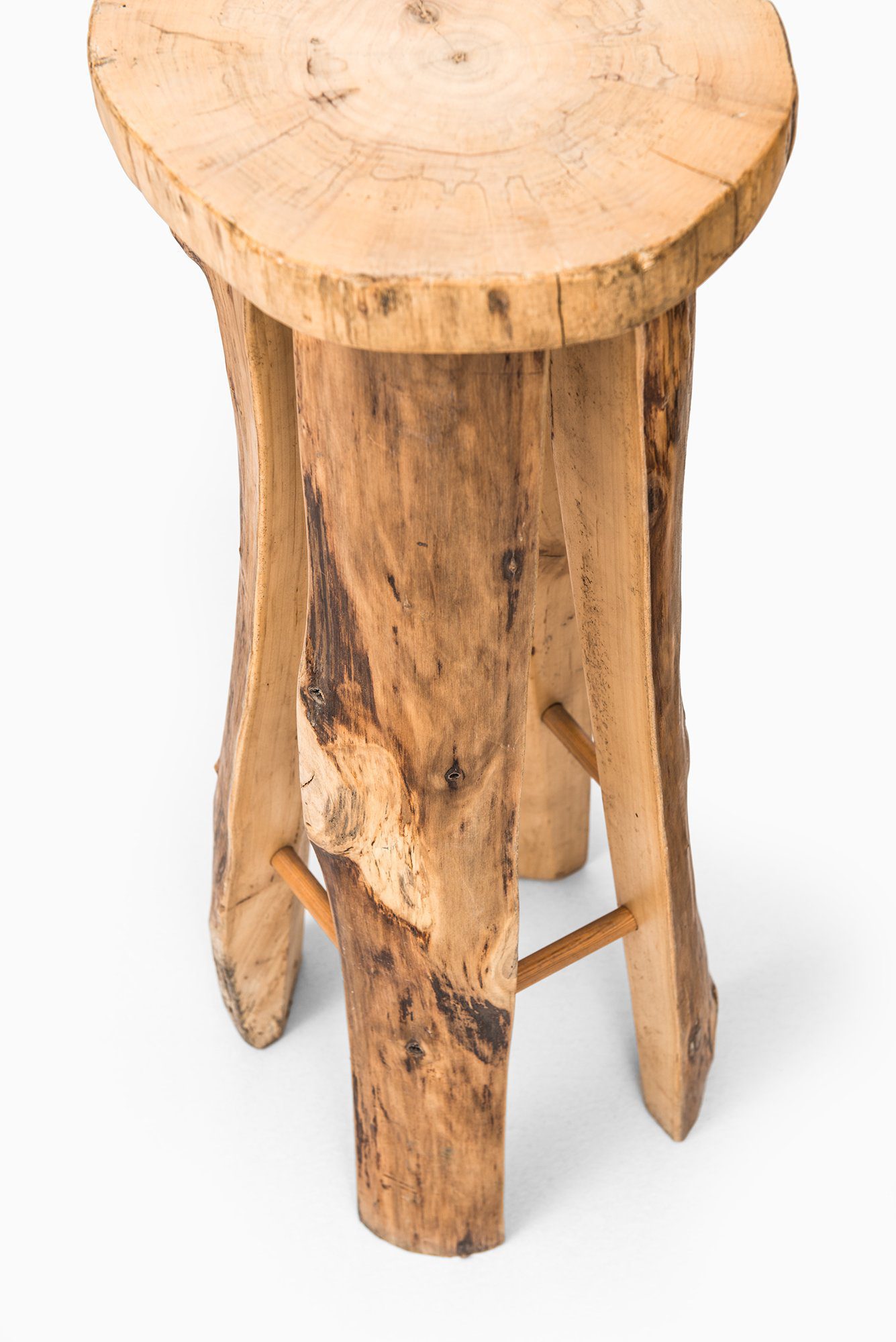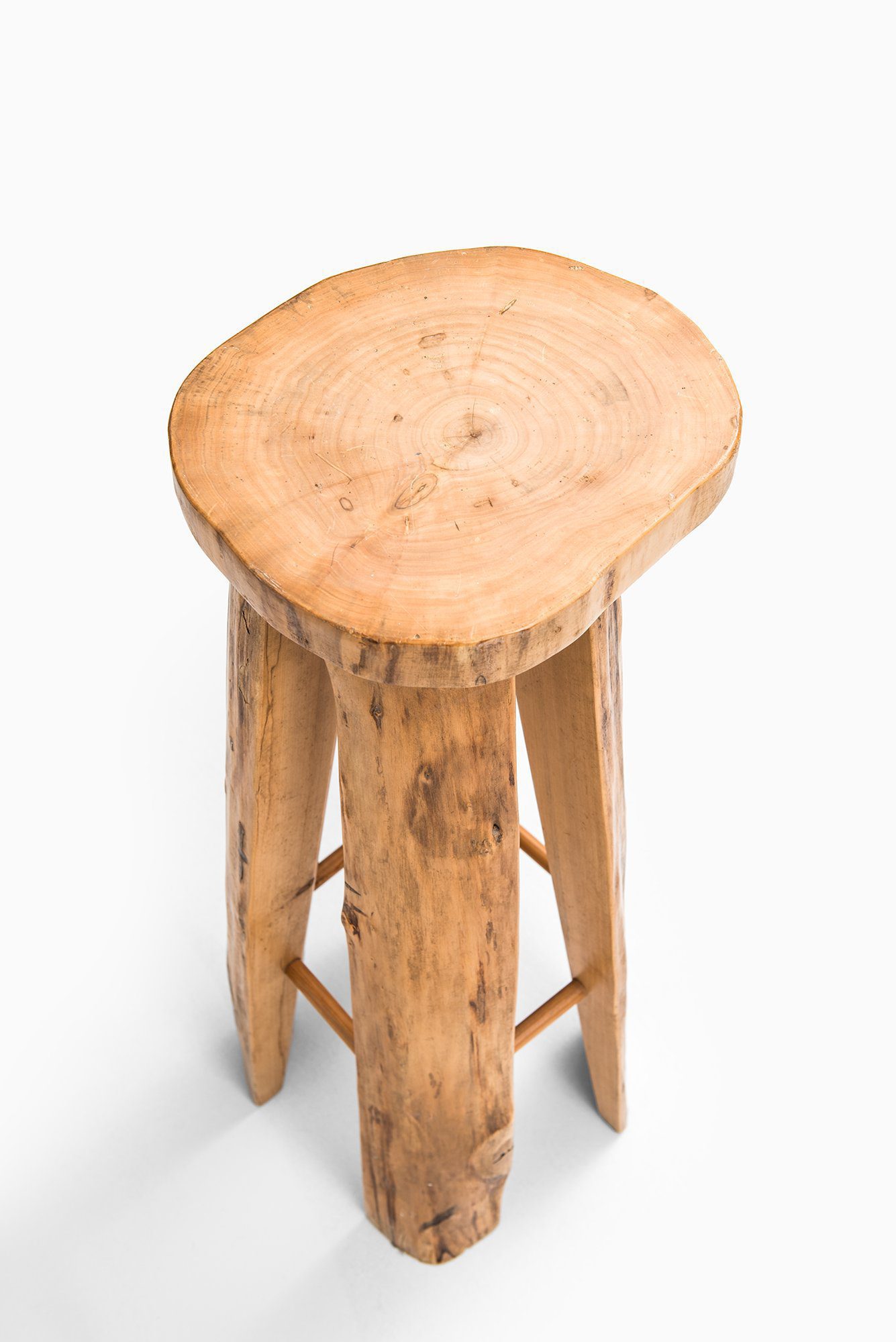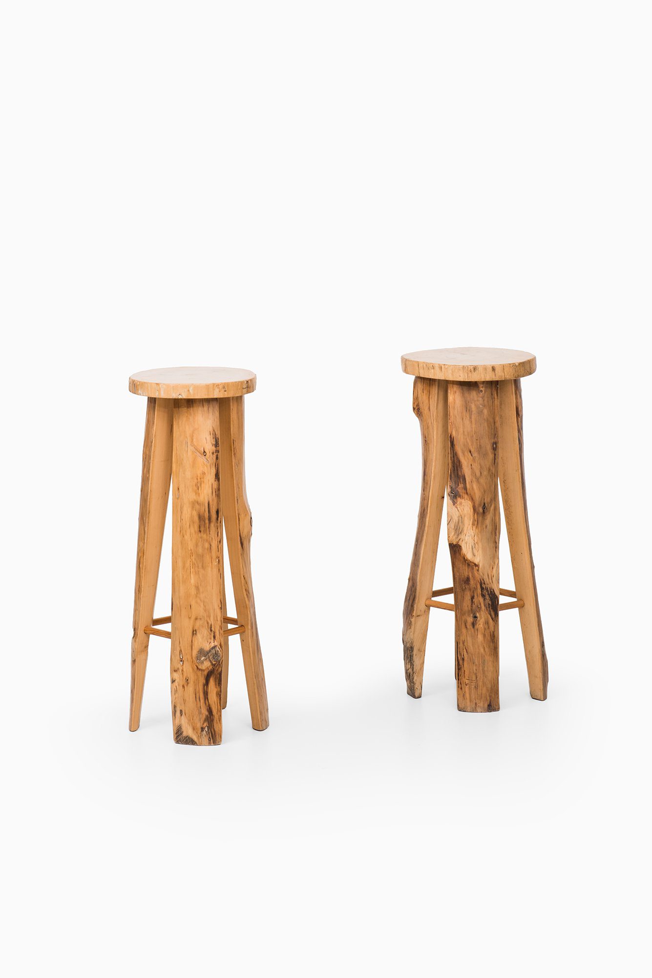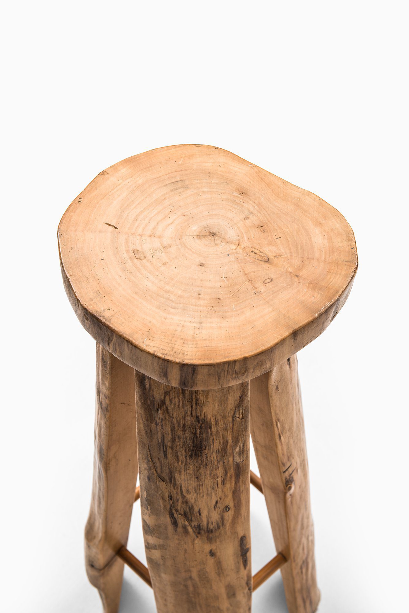 This large set of six bar stools was designed by Sigvard Nilsson and produced by Söwe Konst in Sweden during the 1960s. They are crafted entirely in solid poplar wood, a material chosen for its warm tone, visible grain, and natural durability. Each stool is unique in its surface expression, as the design intentionally retains the organic irregularities, knots, and growth patterns of the wood. The round seats are cut directly from thick tree sections, revealing the natural rings of the timber, while the legs preserve the raw contours of the trunk. This results in a sculptural quality that blurs the line between functional furniture and decorative object.