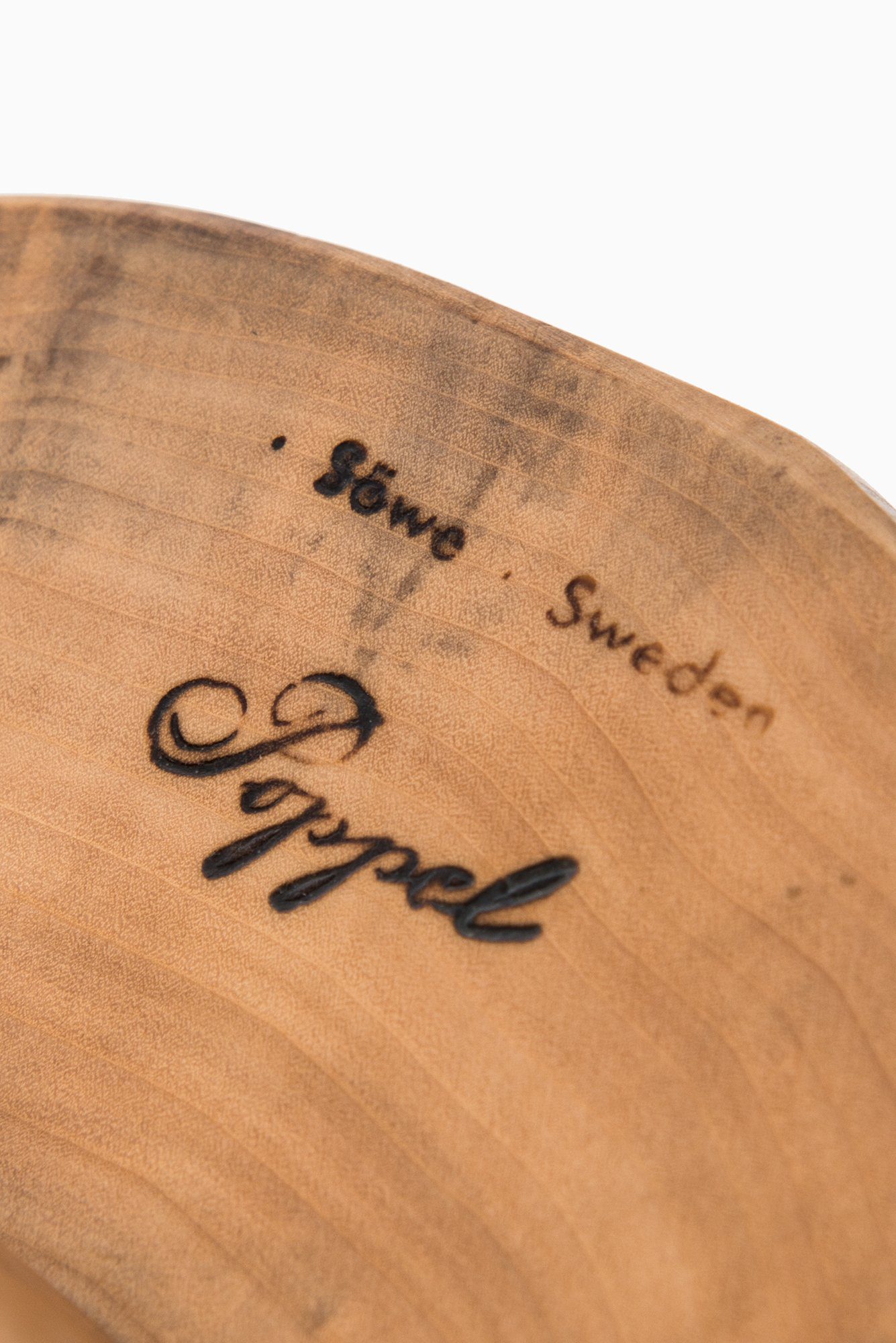 The design is minimalist in construction, with three solid legs connected by round stretchers for added stability. Despite the rustic expression, the proportions and careful detailing reflect the Scandinavian modernist tradition, where simplicity, natural materials, and craftsmanship were emphasized. The stools carry the branding “Söwe Sweden” and “Poppel” on the underside, marking both their authenticity and origin.