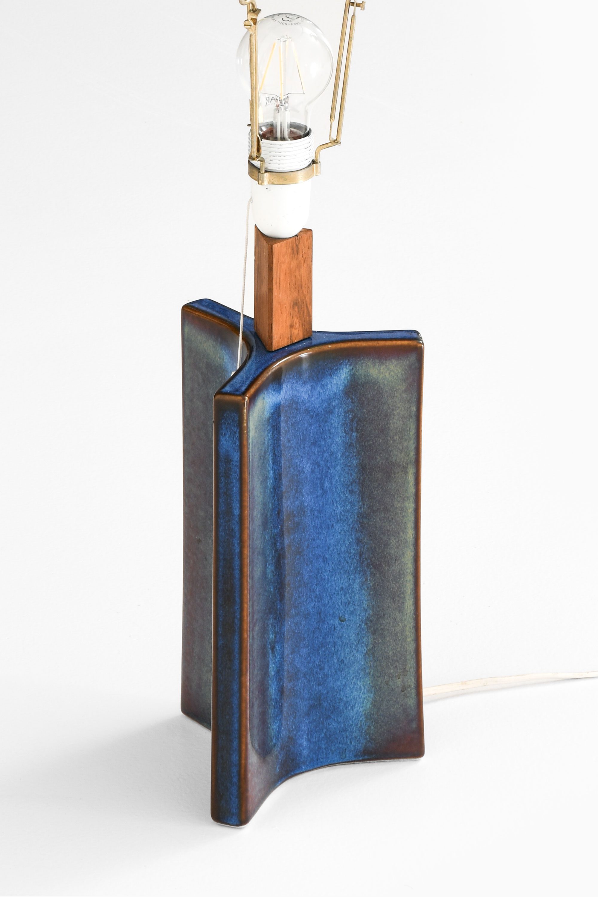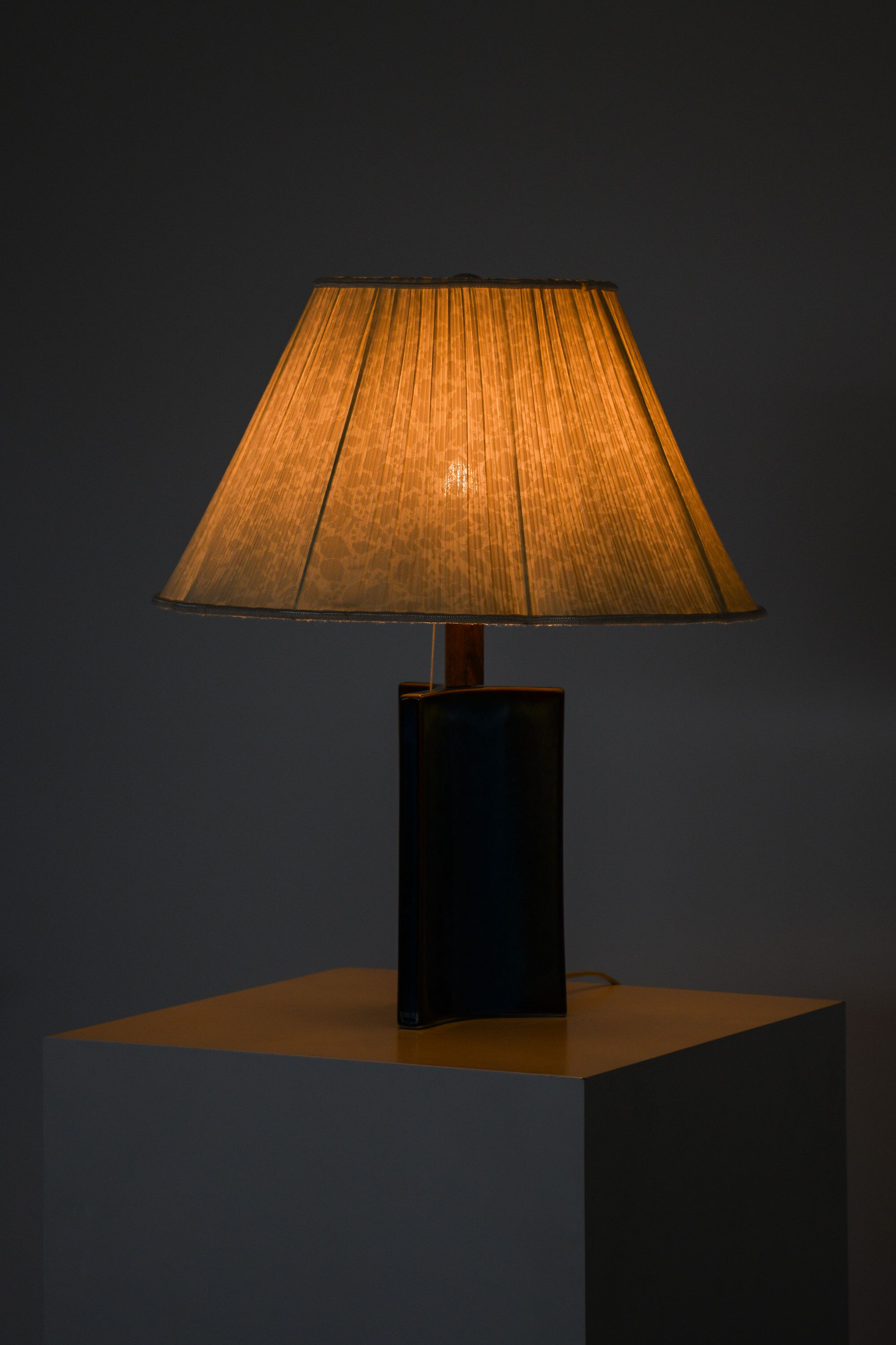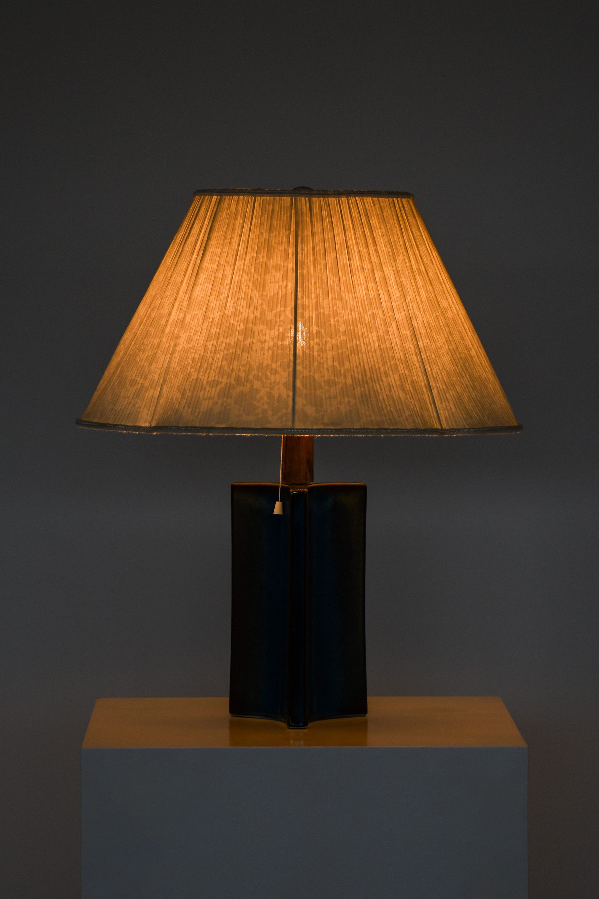 This mid-century table lamp, produced by Søholm Stentøj in Denmark during the 1960s, exemplifies the studio’s distinctive approach to ceramic design, blending sculptural form with expressive glazing techniques. The lamp’s base is crafted from stoneware and displays a bold, angular silhouette that combines tapering planes and softened contours. The surface is finished in a rich, high-gloss glaze that transitions between deep cobalt blue and earthy brown tones, creating a layered, almost volcanic texture that is both visually dynamic and tactile.