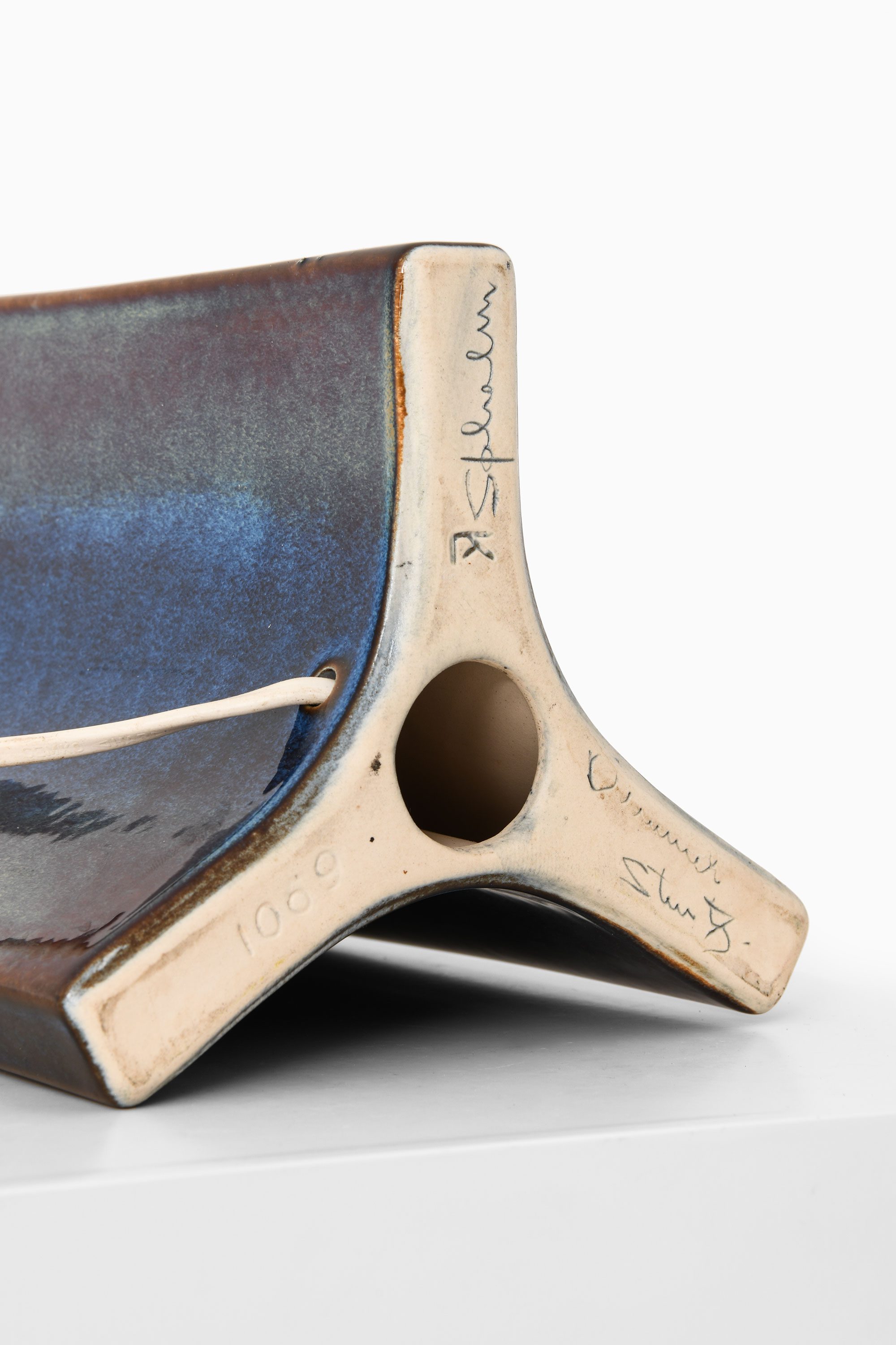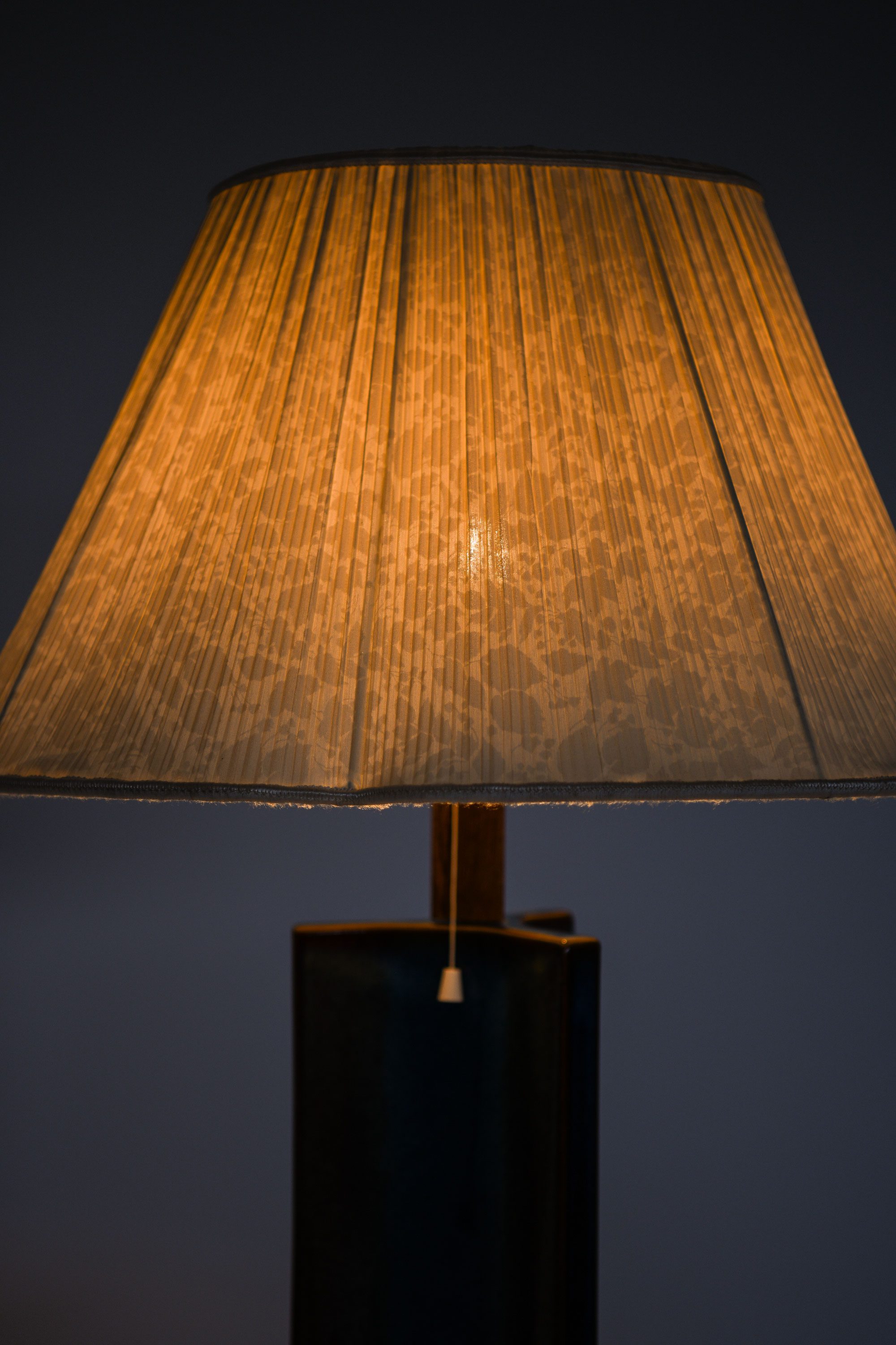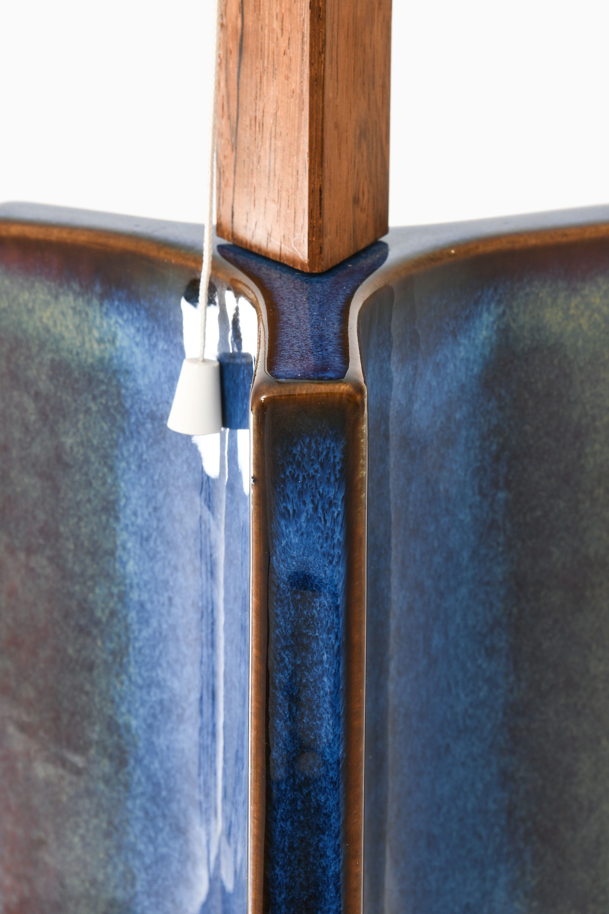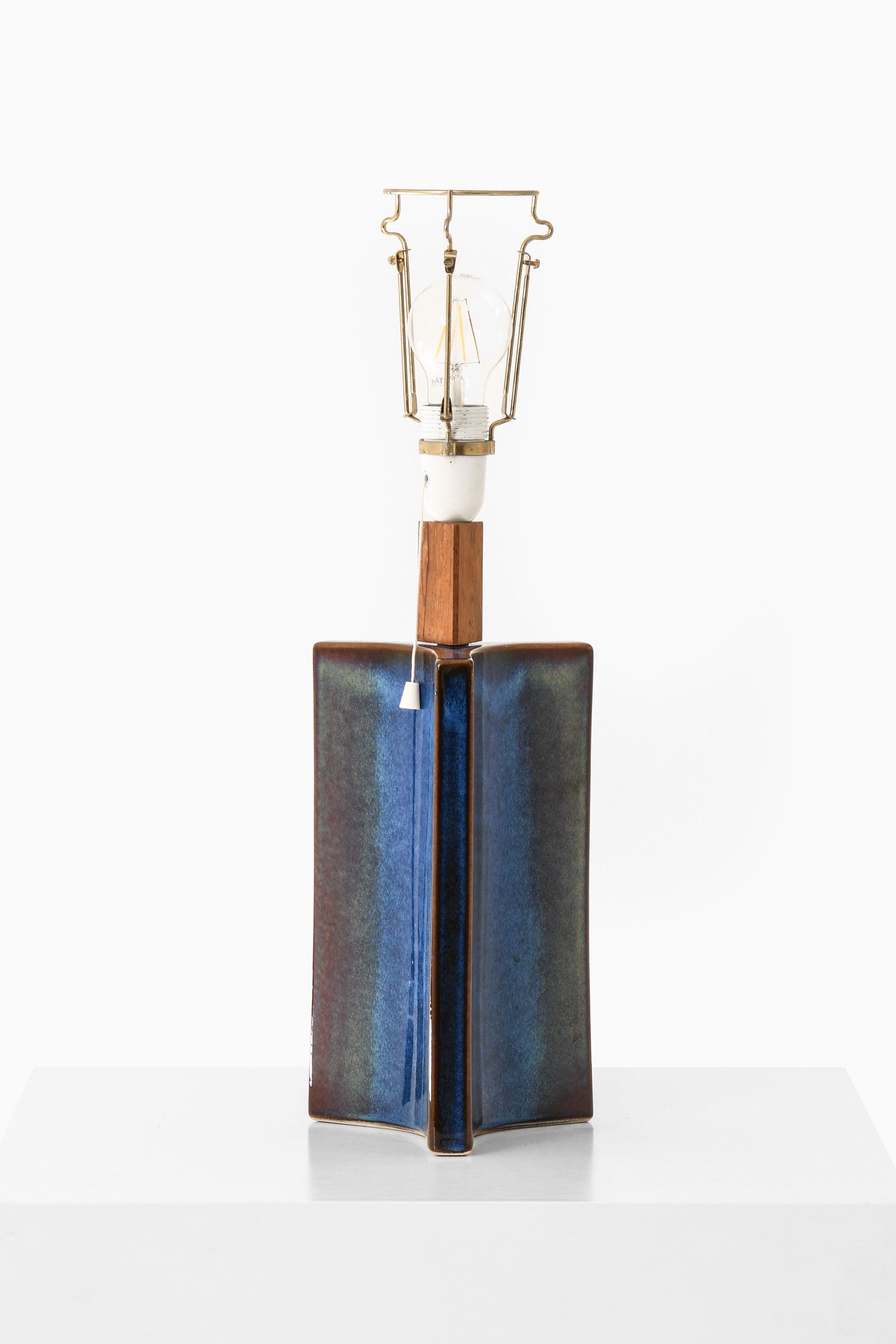 This mid-century table lamp, produced by Søholm Stentøj in Denmark during the 1960s, exemplifies the studio’s distinctive approach to ceramic design, blending sculptural form with expressive glazing techniques. The lamp’s base is crafted from stoneware and displays a bold, angular silhouette that combines tapering planes and softened contours. The surface is finished in a rich, high-gloss glaze that transitions between deep cobalt blue and earthy brown tones, creating a layered, almost volcanic texture that is both visually dynamic and tactile.