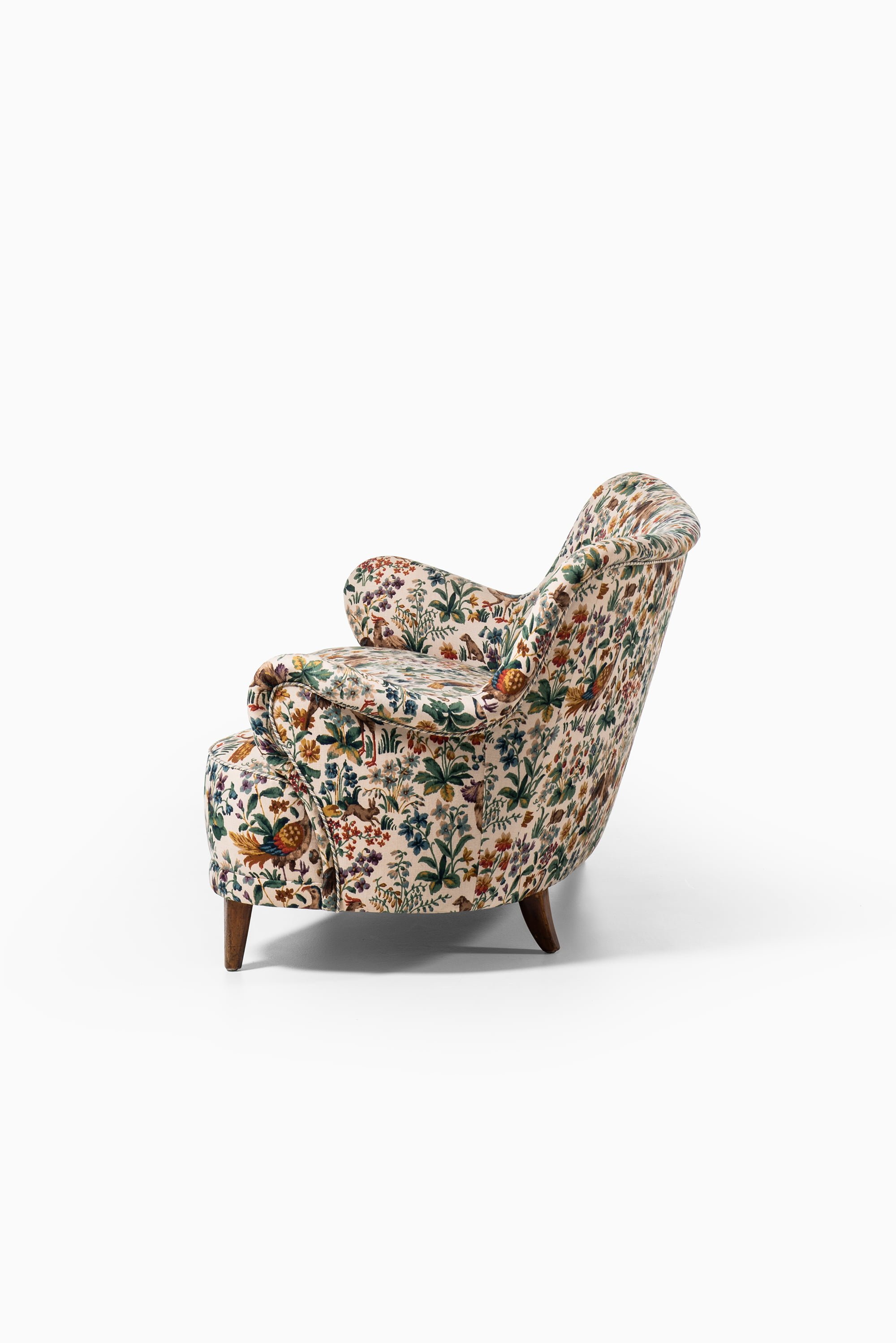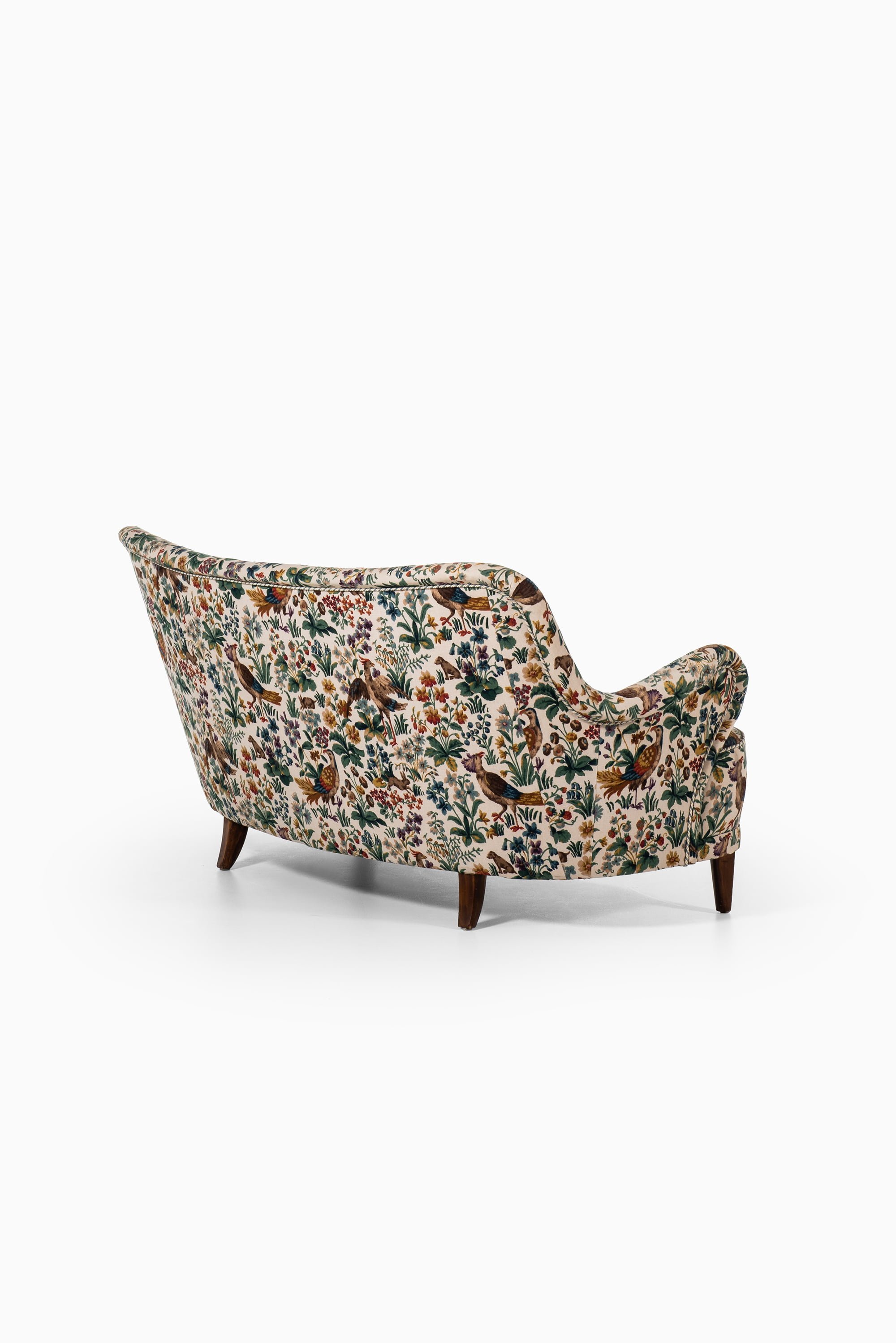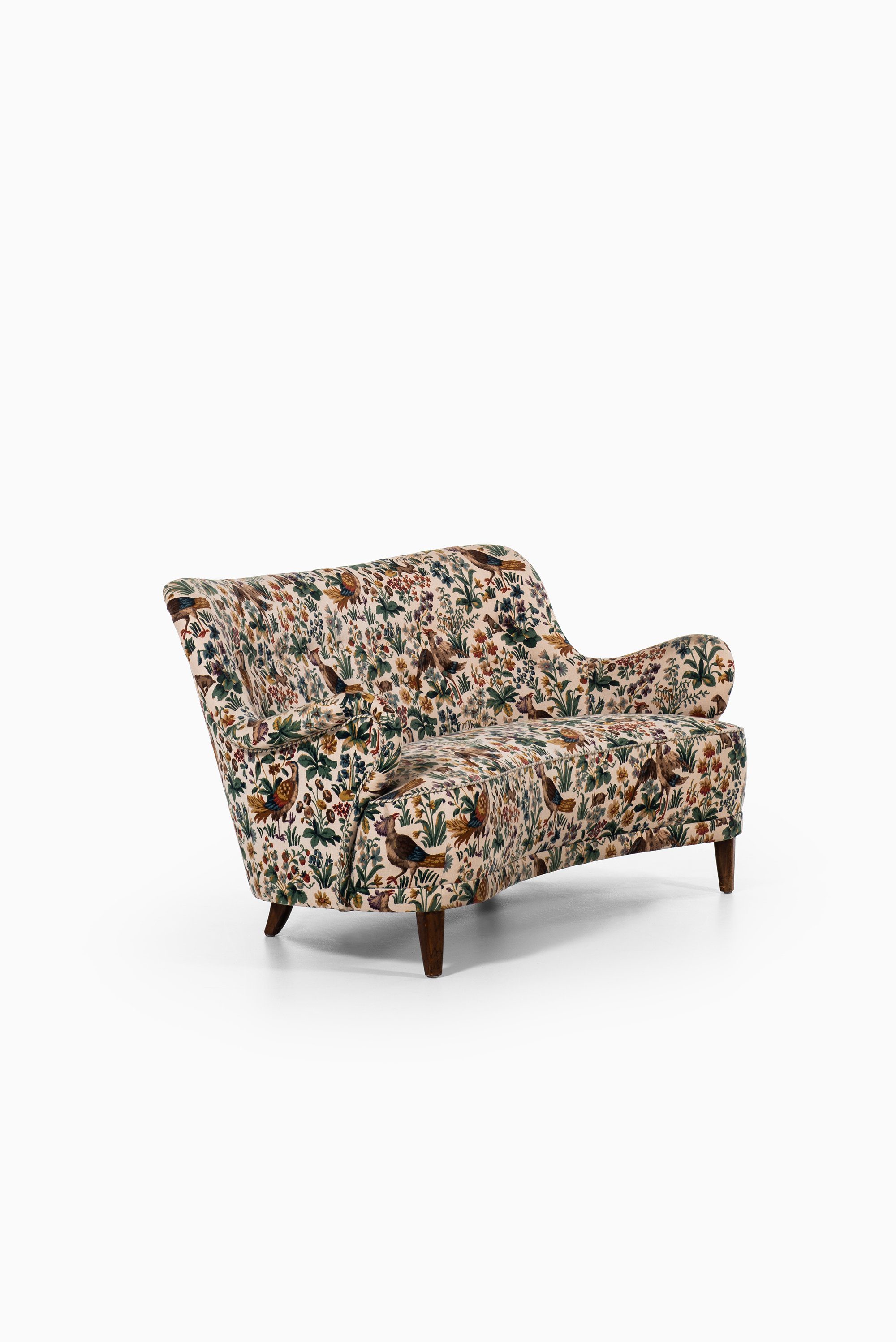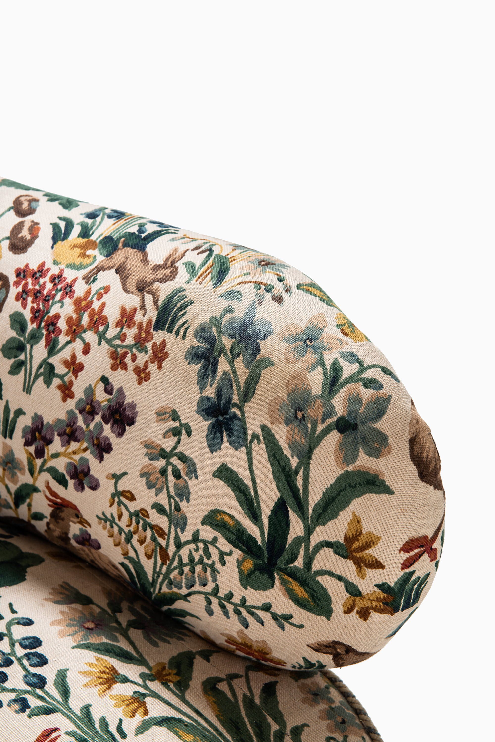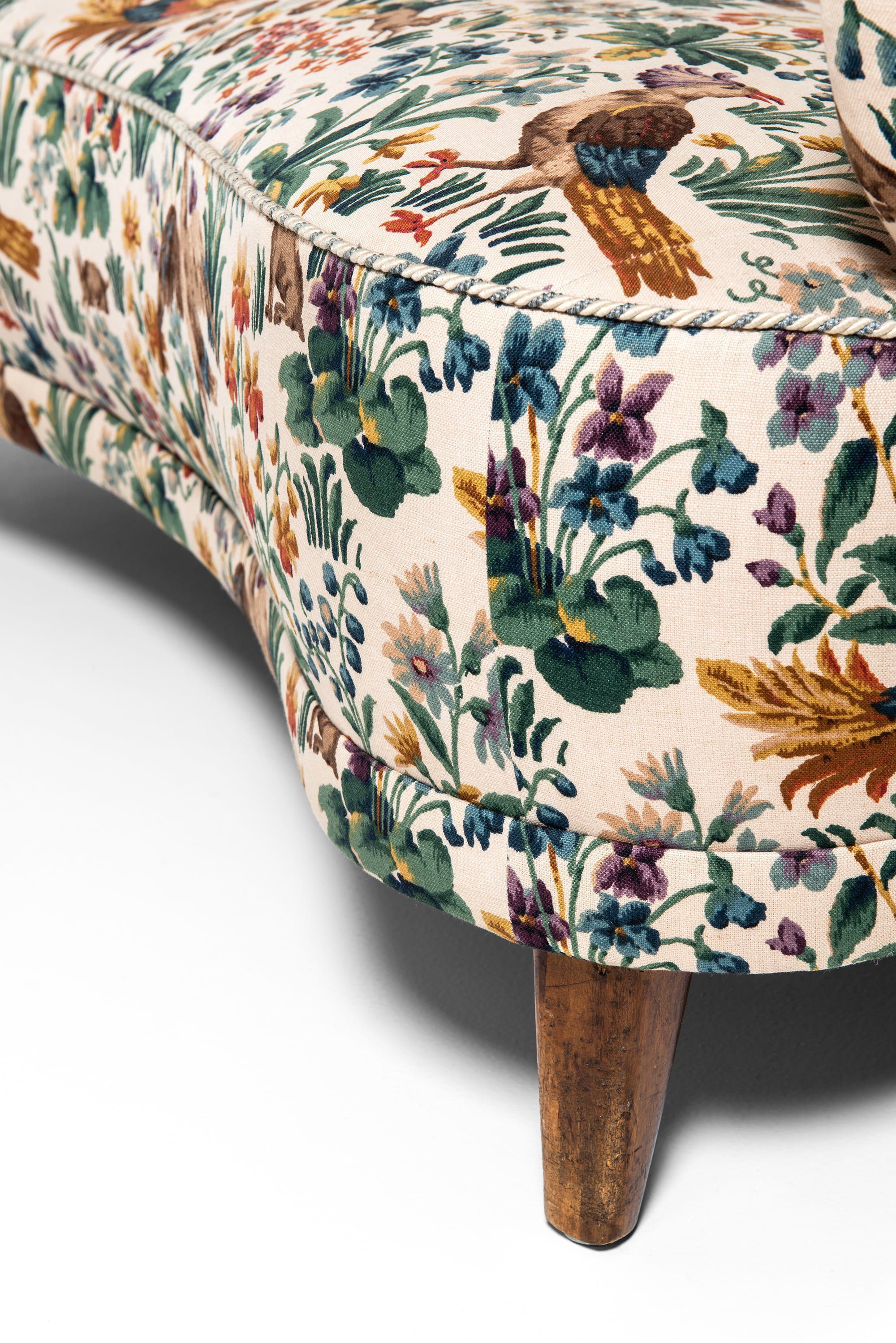 This rare curved sofa was designed by Sten Blomberg and produced by Knut Lindquist in Stockholm, Sweden, around 1945. The frame is made of mahogany, a material chosen for its strength and warm tone, and it has been recently reupholstered in the classic ‘Cluny’ fabric by Sanderson. The textile, originally designed in 1953, is a richly patterned cotton velvet featuring birds and floral motifs in earthy and vibrant hues, giving the sofa a distinctive and decorative character.