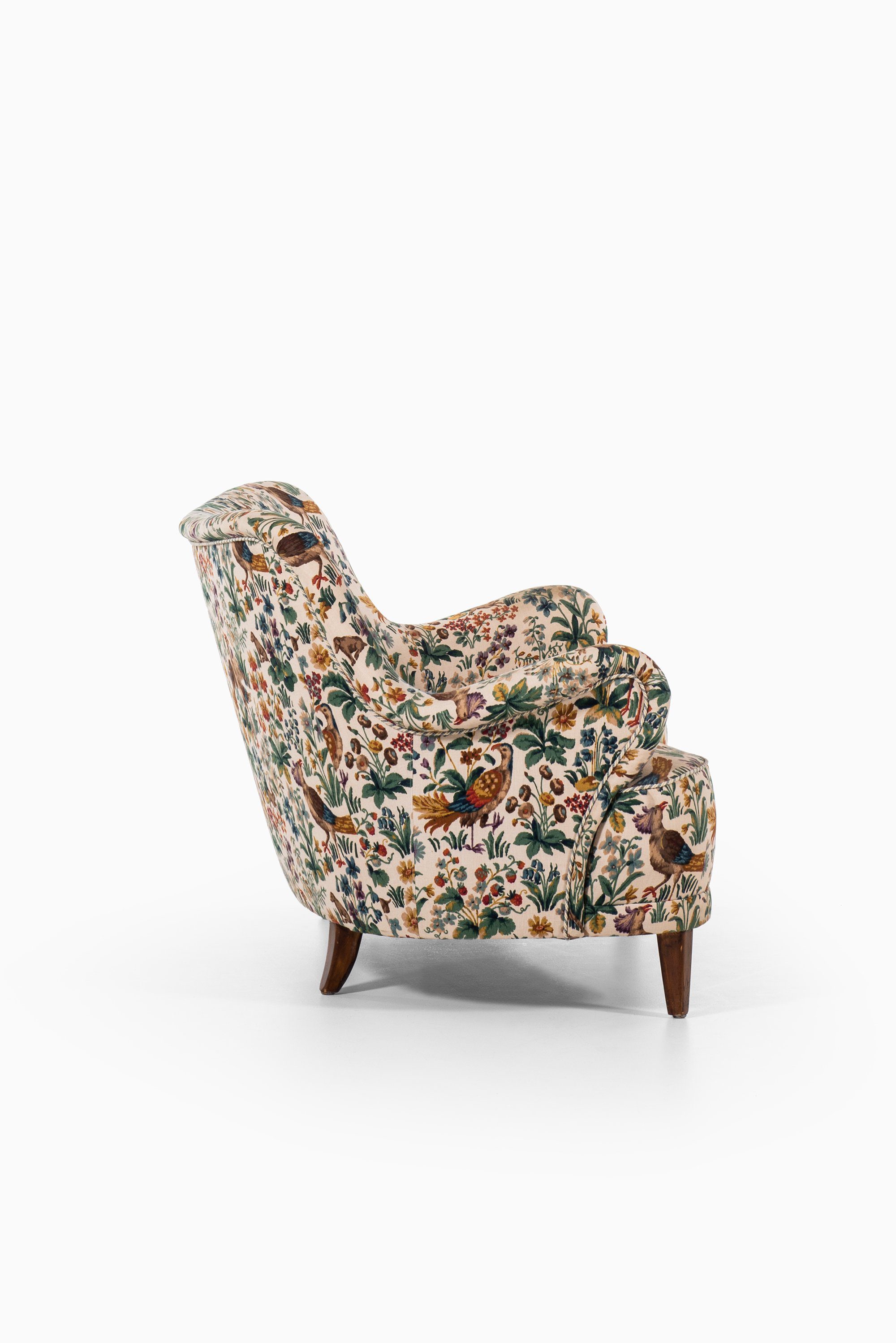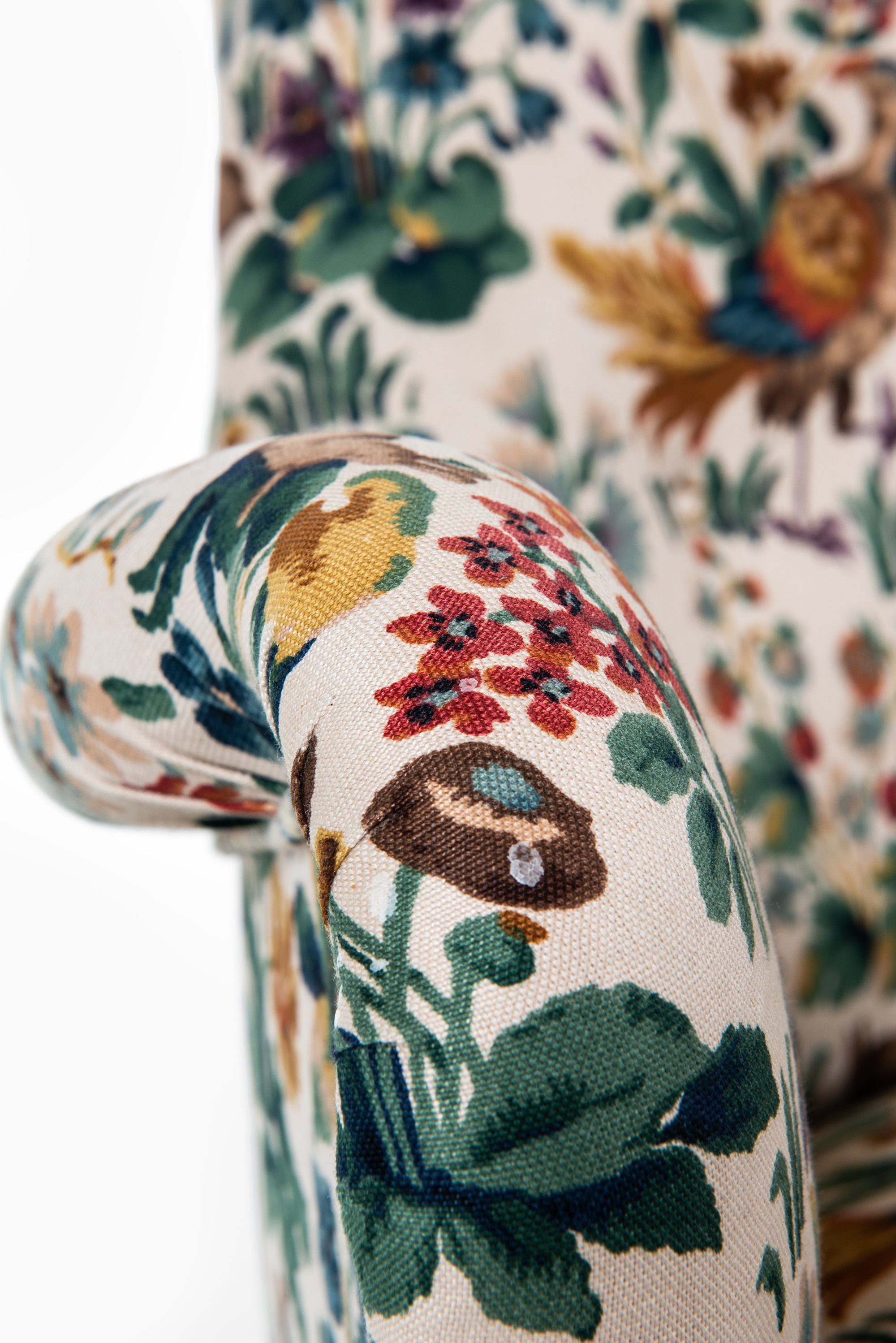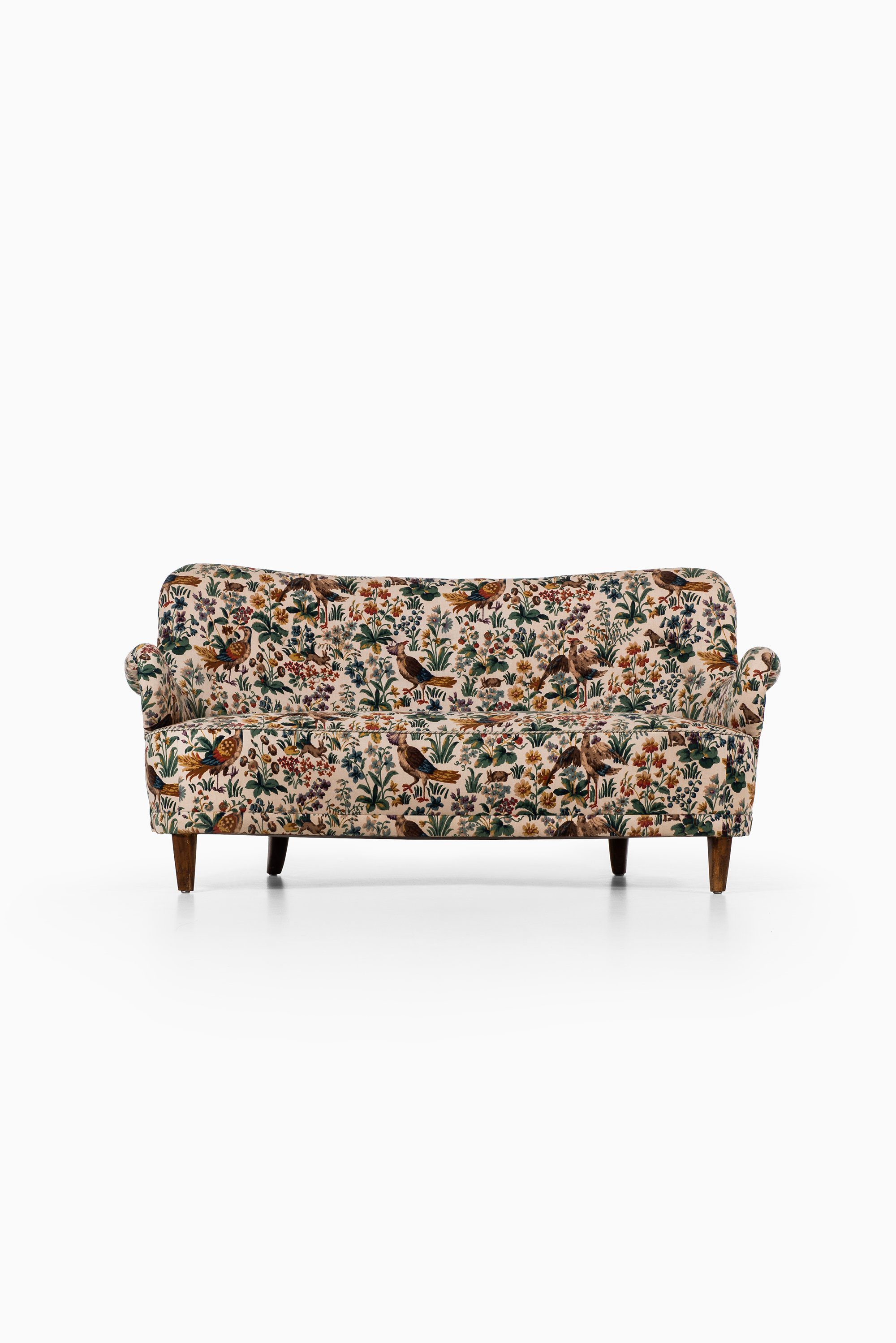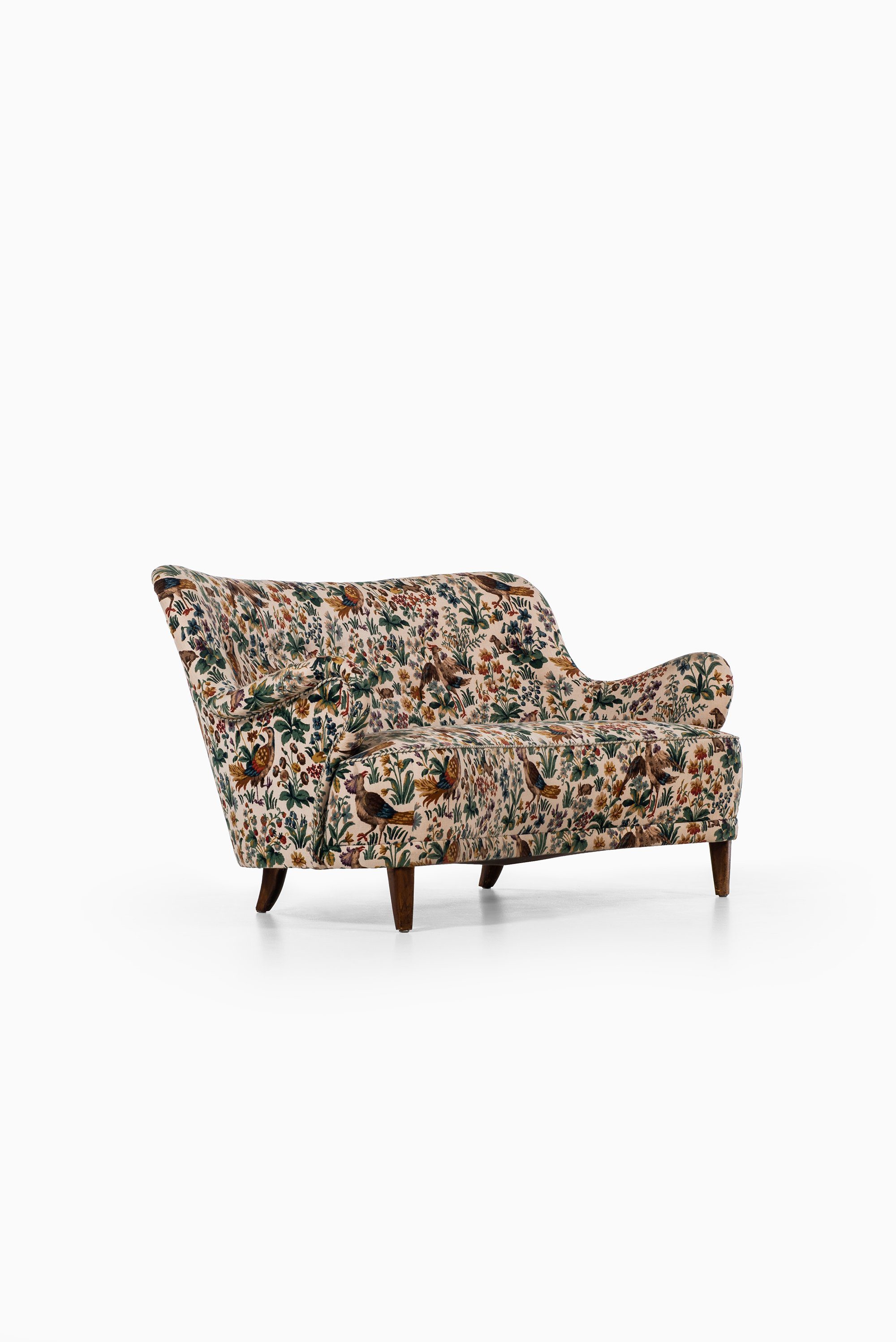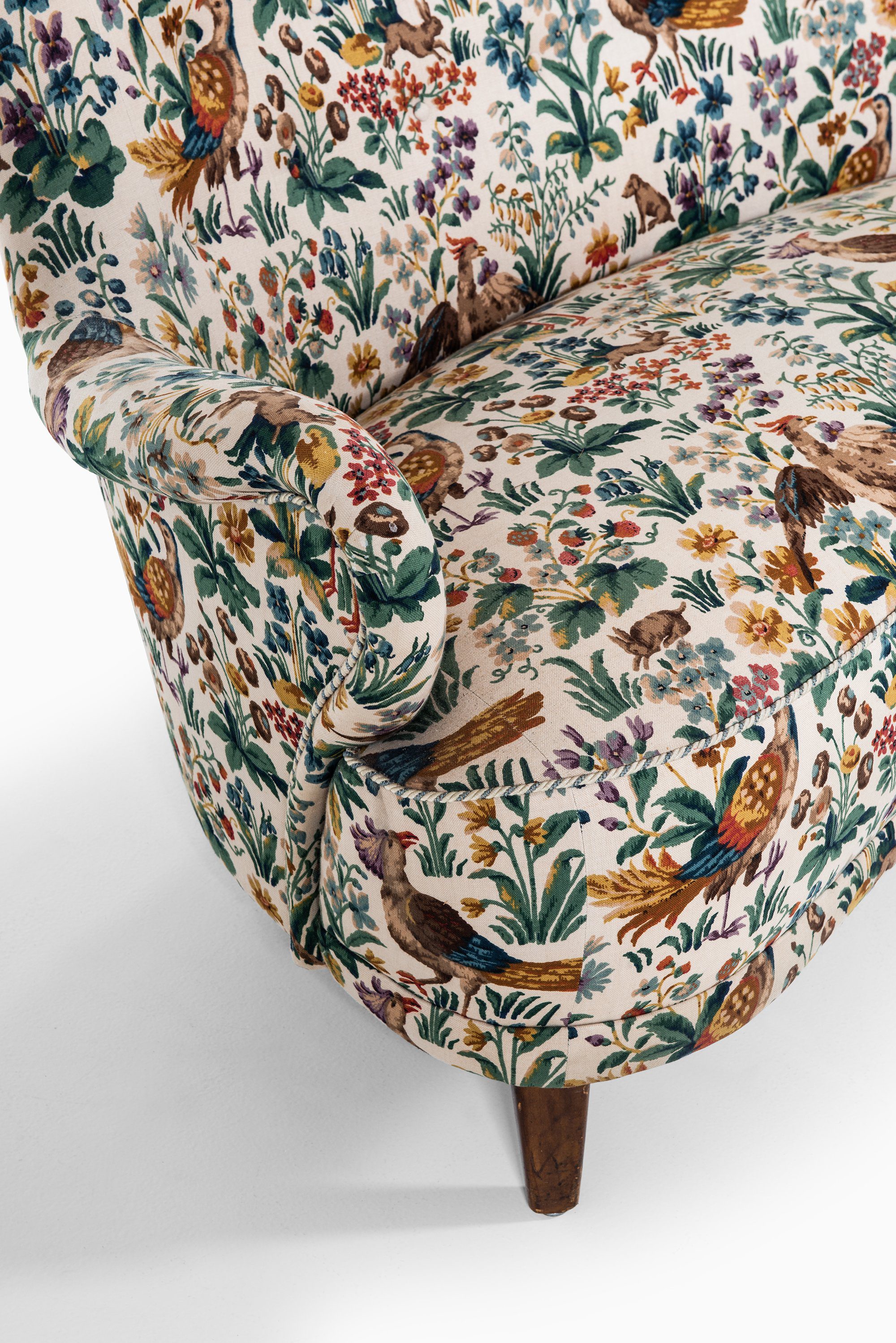 This rare curved sofa was designed by Sten Blomberg and produced by Knut Lindquist in Stockholm, Sweden, around 1945. The frame is made of mahogany, a material chosen for its strength and warm tone, and it has been recently reupholstered in the classic ‘Cluny’ fabric by Sanderson. The textile, originally designed in 1953, is a richly patterned cotton velvet featuring birds and floral motifs in earthy and vibrant hues, giving the sofa a distinctive and decorative character.