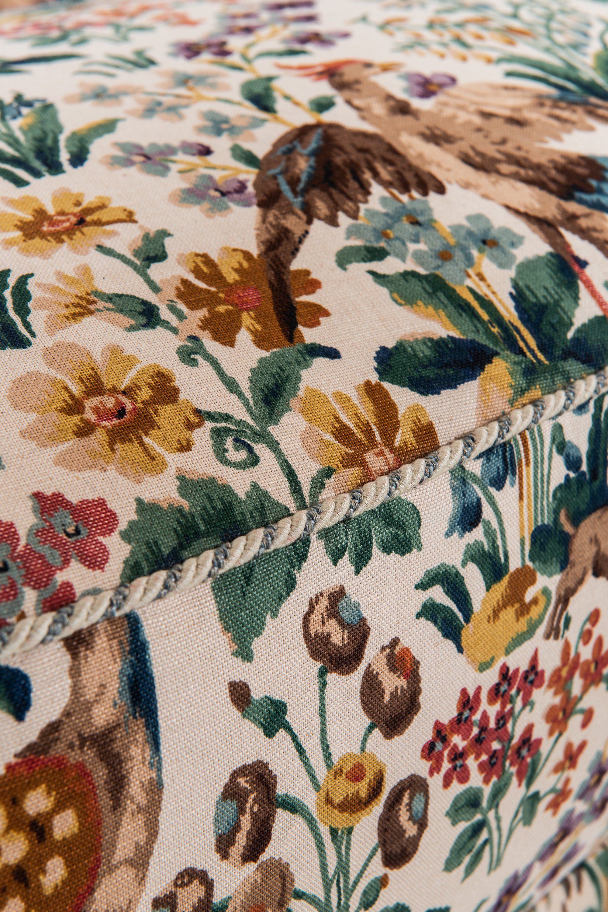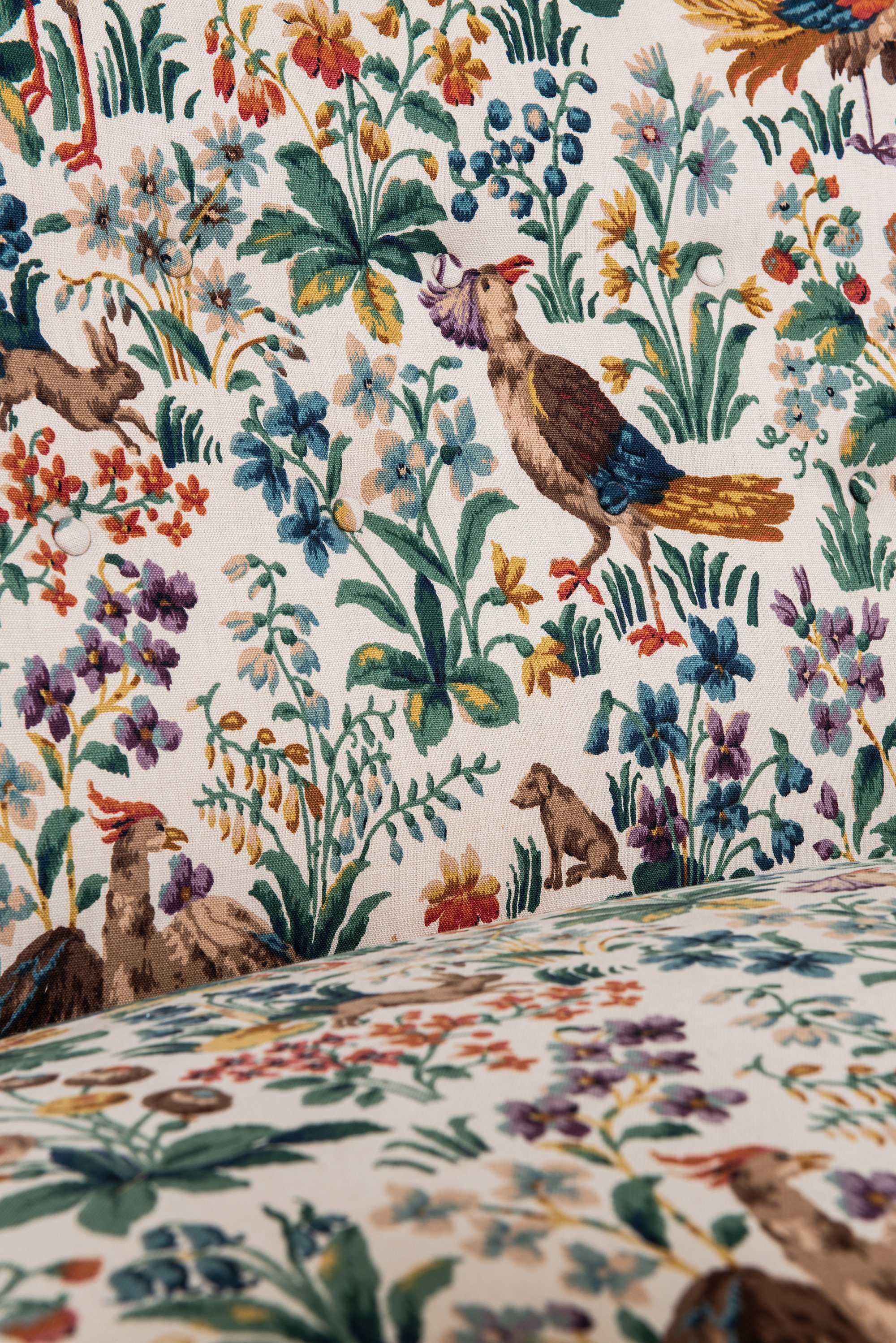 The sofa remains in excellent vintage condition, showing only minimal signs of age and a beautiful patina to the wood. The newly applied Sanderson upholstery adds a vivid yet historically sympathetic finish that complements the form.