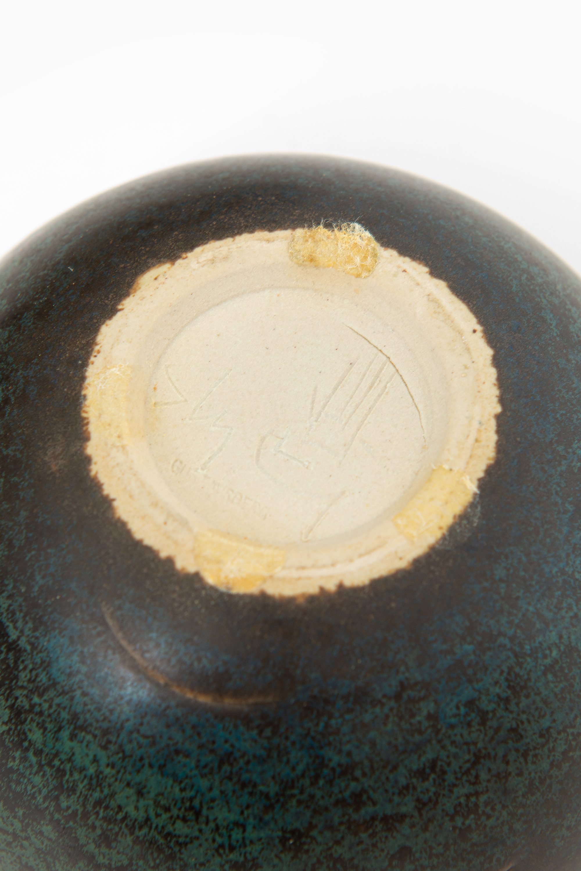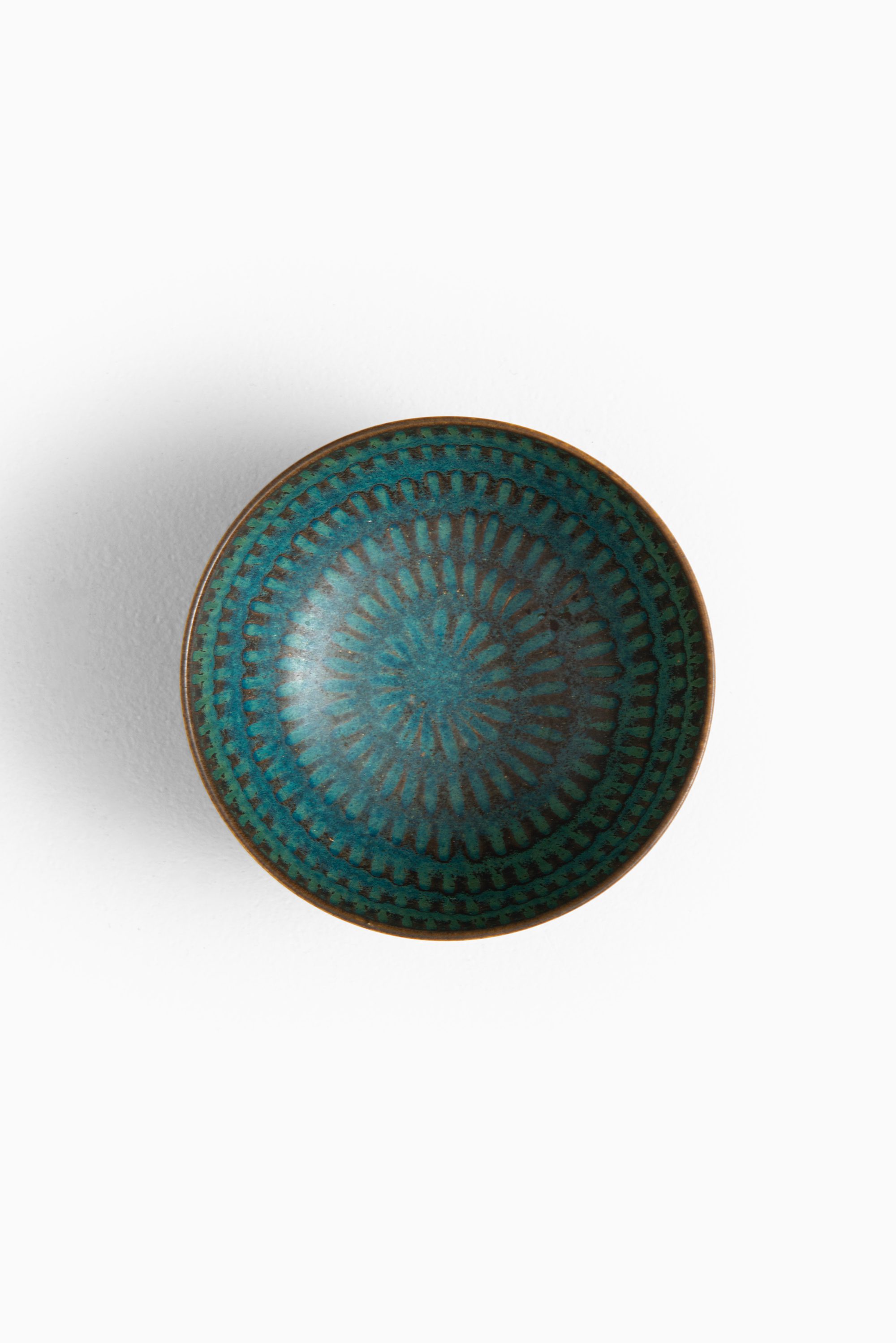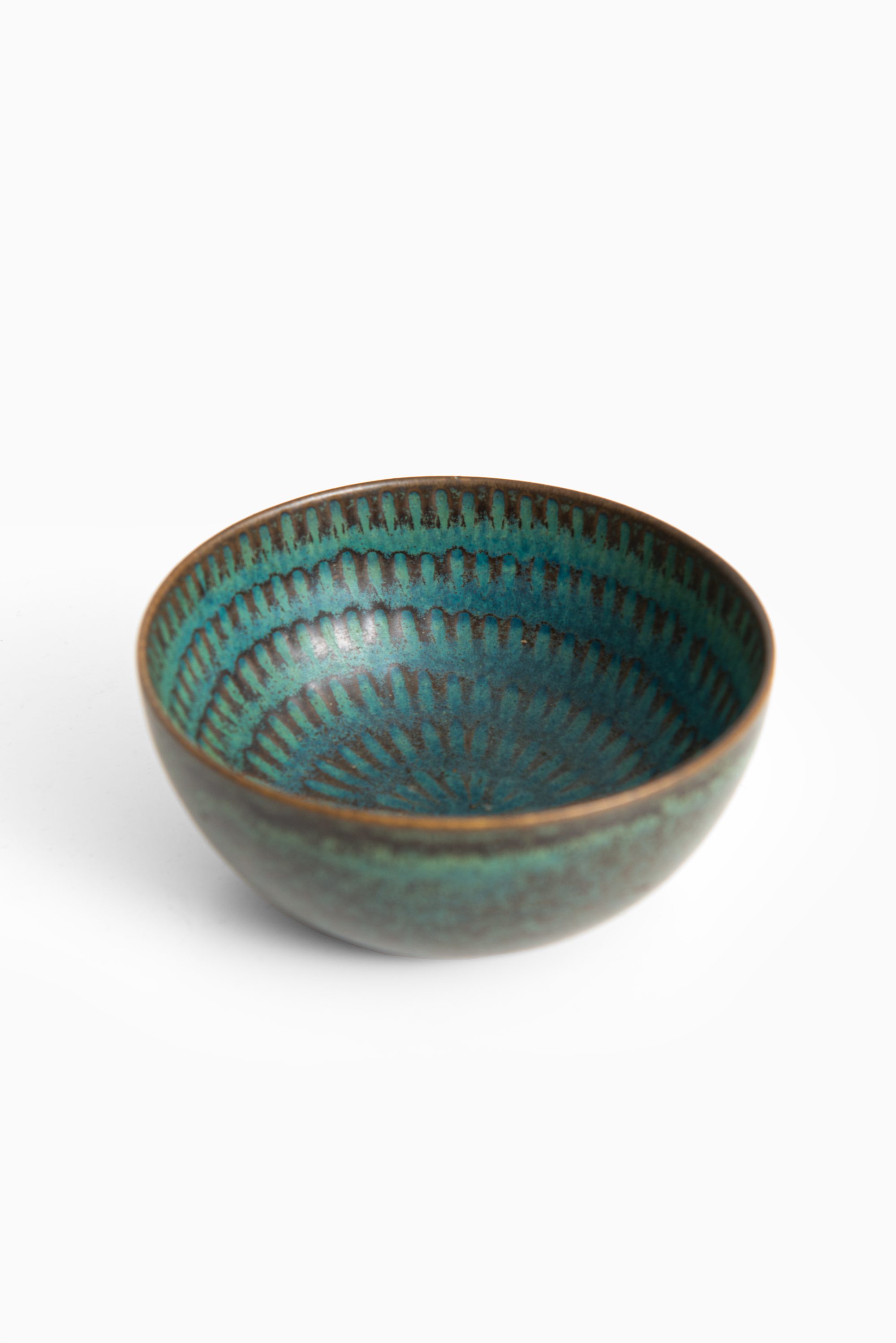 This small ceramic bowl was designed by Stig Lindberg and produced by Gustavsberg in Sweden during the 1960s. It is made from stoneware and finished with a distinctive glaze in deep green and turquoise blue tones, creating a rich, mottled surface that emphasizes both texture and color depth. The interior features a radiating pattern of vertical lines that repeat rhythmically from the center outward, forming a geometric motif that is both decorative and structural.