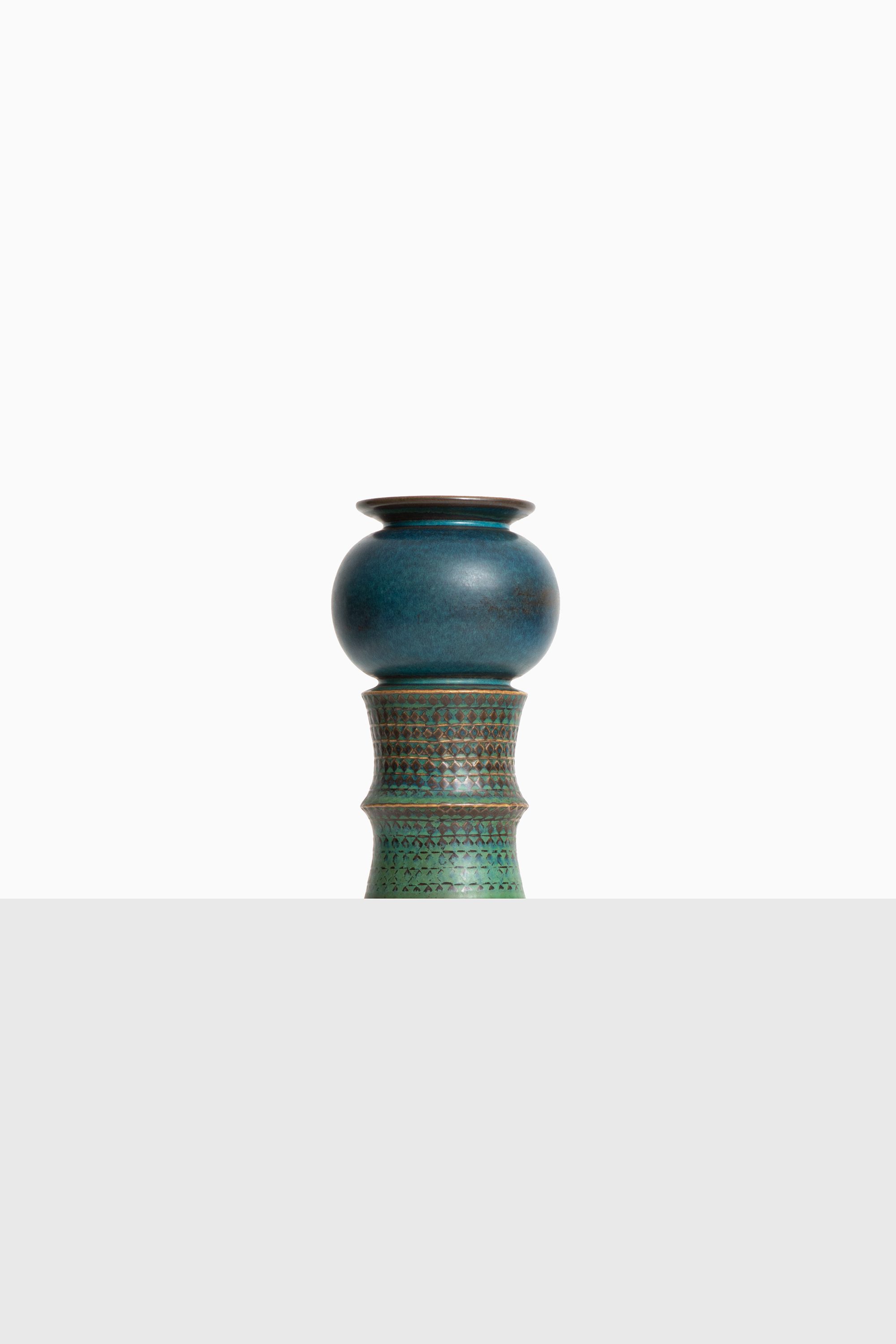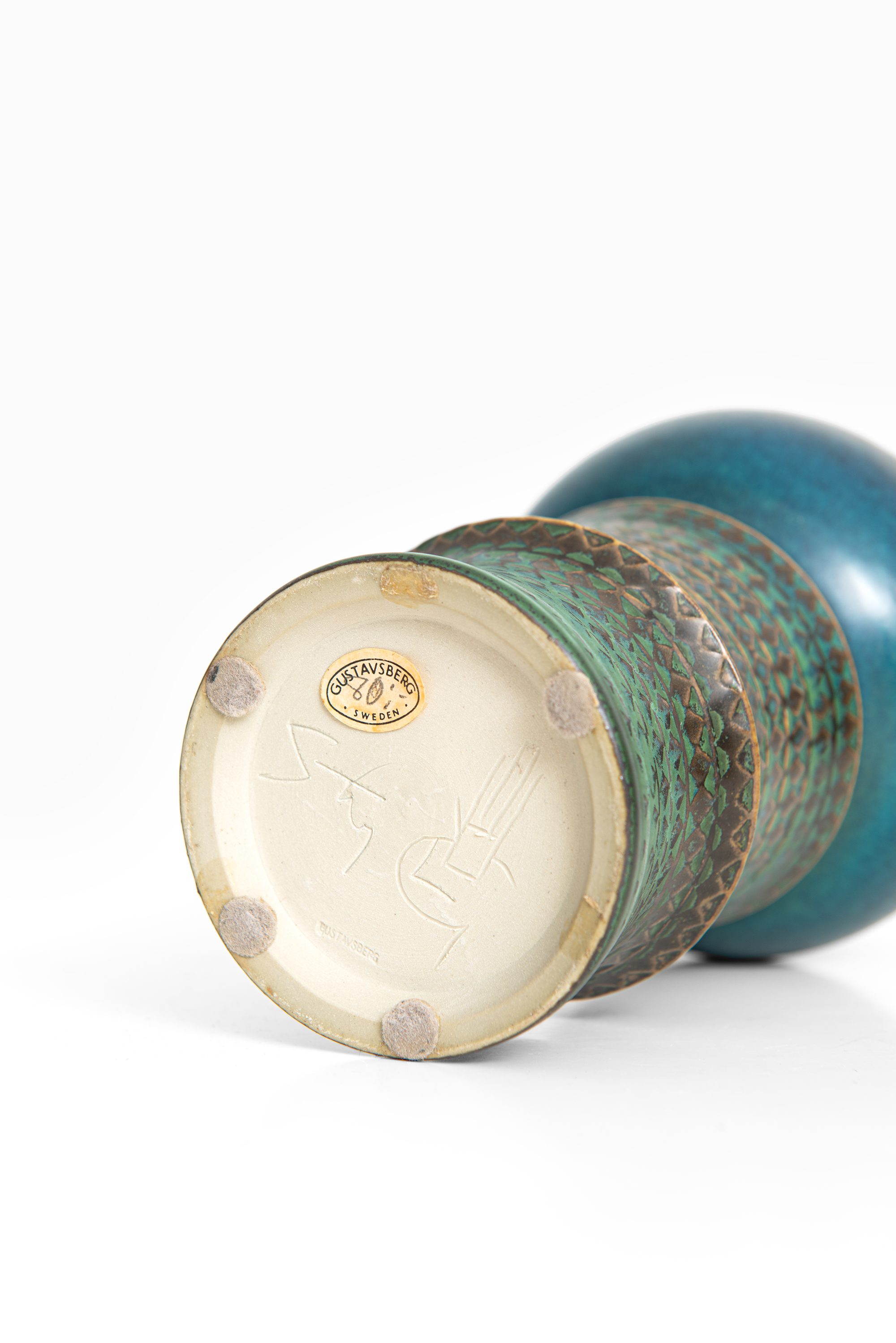 The vase is in good vintage condition, with minor signs of use and age-related patina. The glaze remains vibrant and well-preserved, and the base retains the Gustavsberg label and signature incised markings.