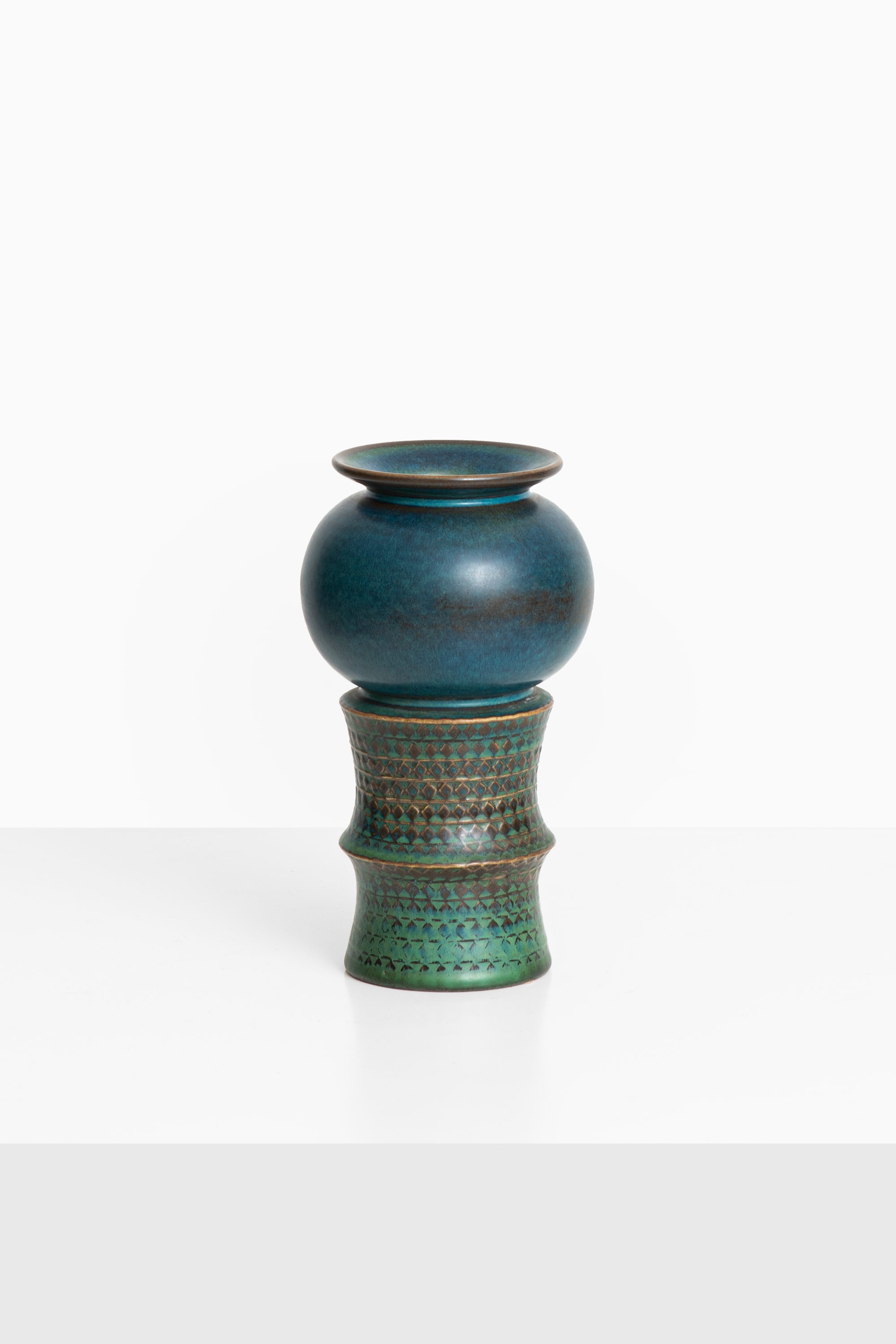 This ceramic vase was designed by Stig Lindberg and produced by Gustavsberg in Sweden in 1960. It is made in stoneware with a dual-section construction that juxtaposes two distinct formal elements: a spherical upper body with a wide collar-like lip and a tall, concave base featuring intricate surface patterning. The glaze is executed in varying shades of green and blue, combining matte and semi-gloss finishes that accentuate the interplay of volume and texture.