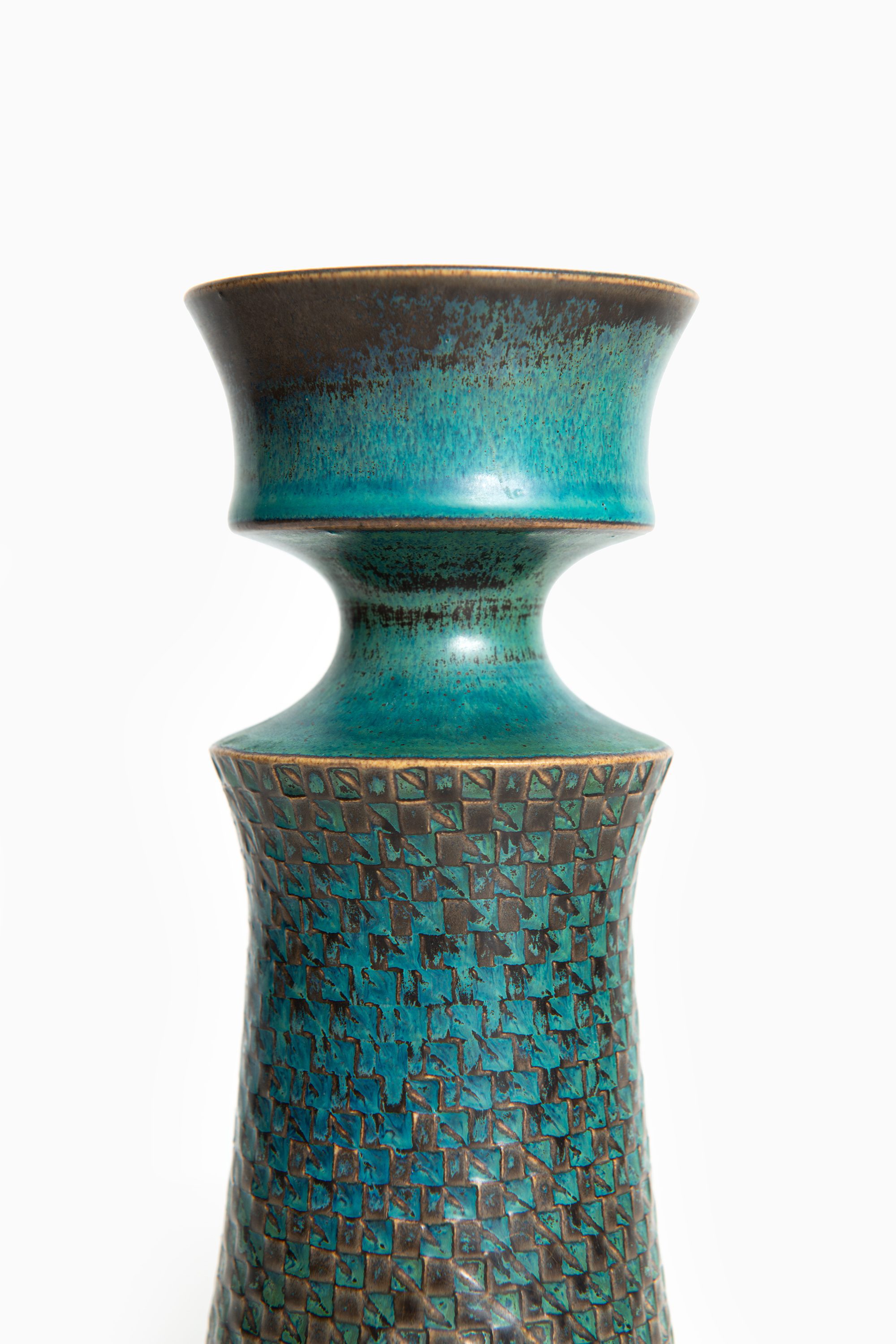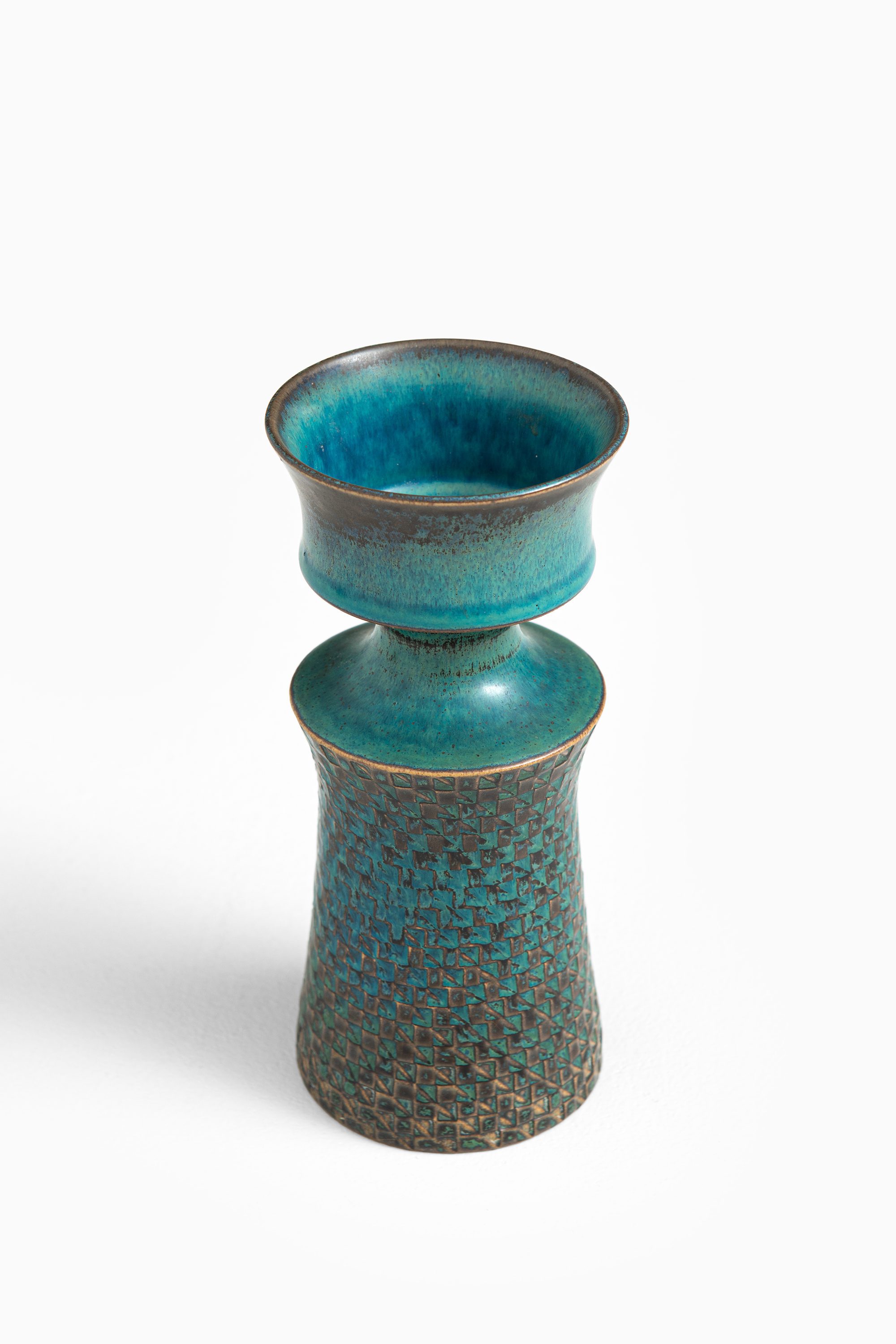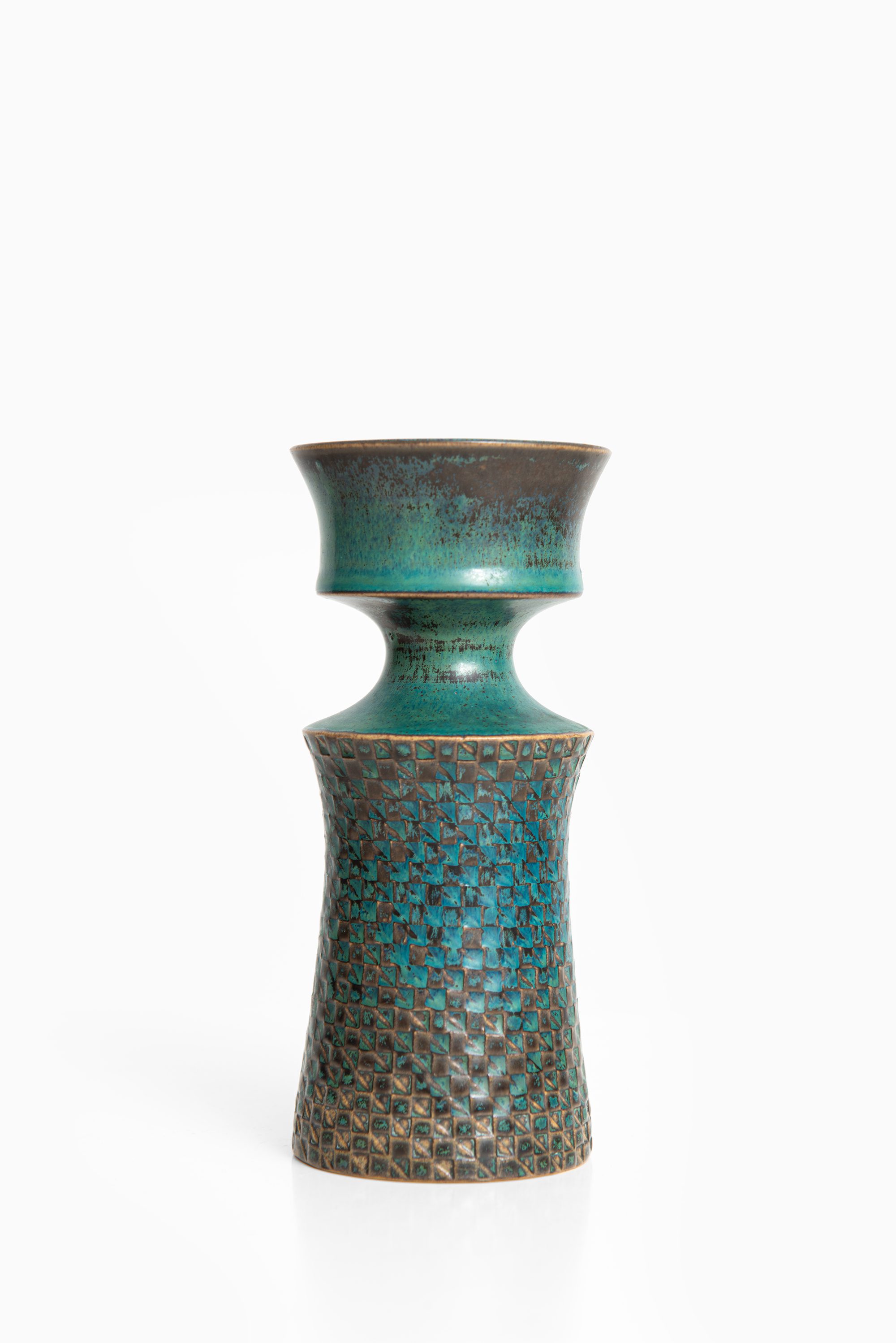 The dimensions of the vase are 17.5 cm in height and 8 cm in diameter (approximately 6.9 inches high and 3.1 inches in diameter). This object represents a quintessential example of Scandinavian mid-century studio ceramics, valued both for its formal qualities and its connection to one of the period’s most celebrated ceramicists.