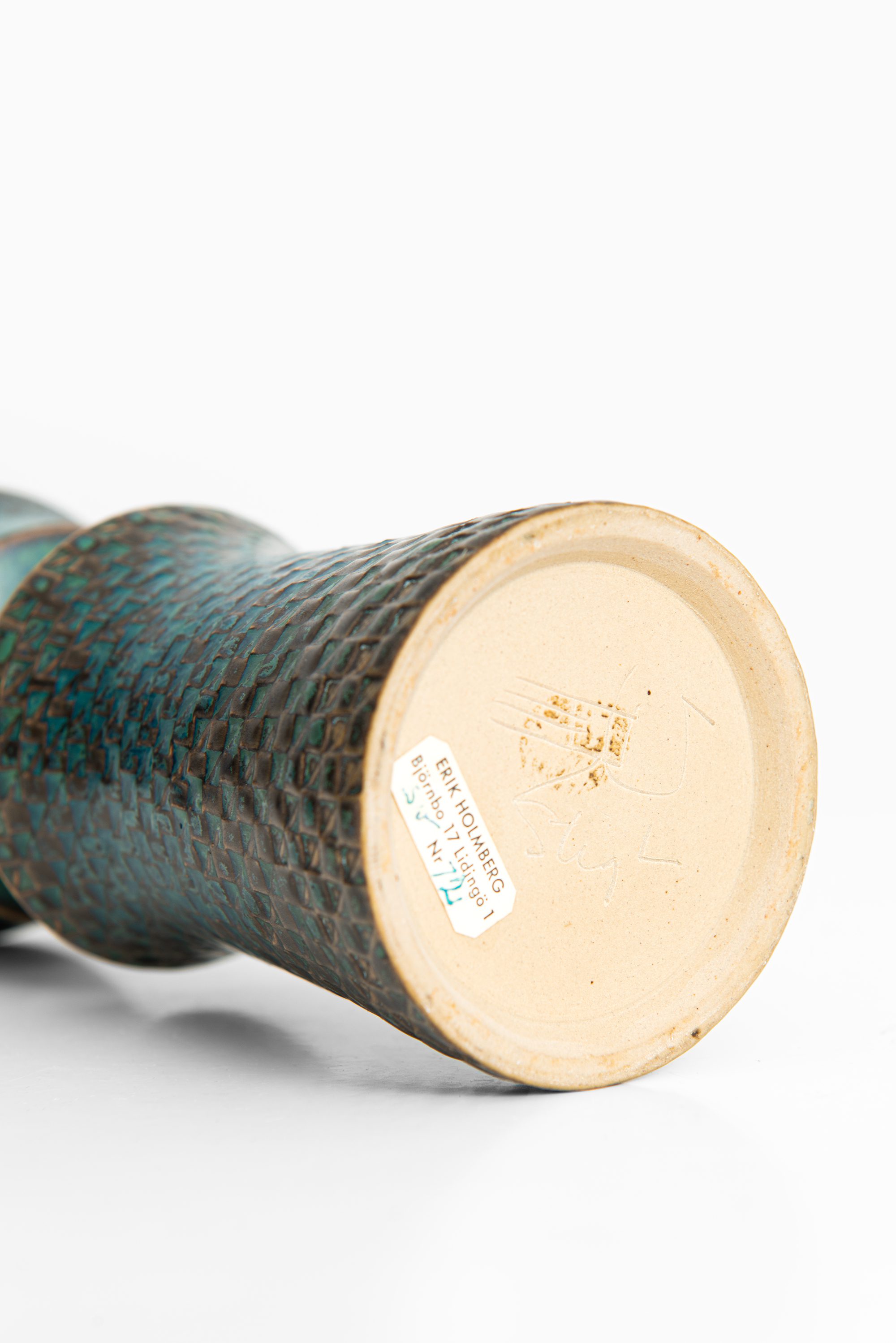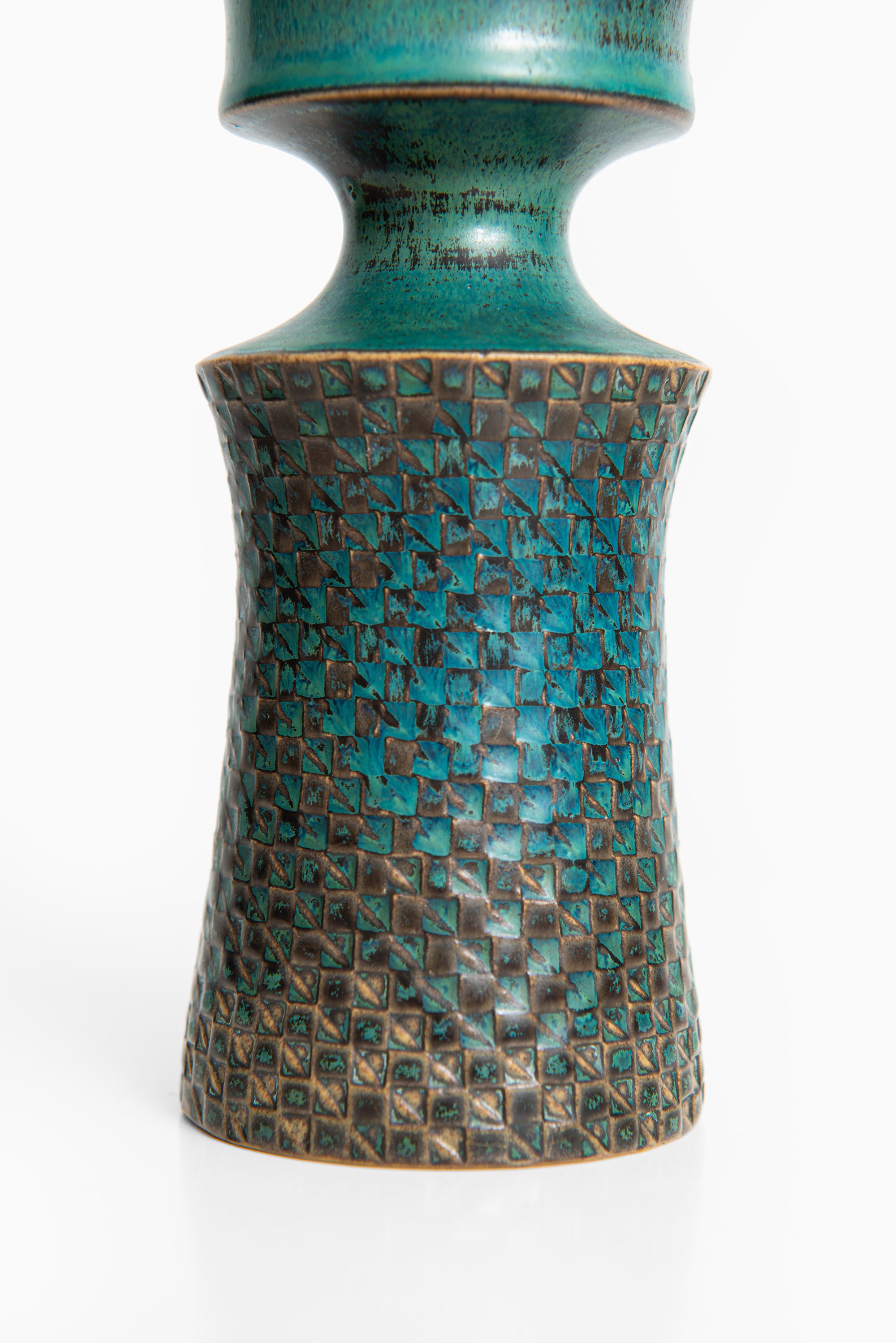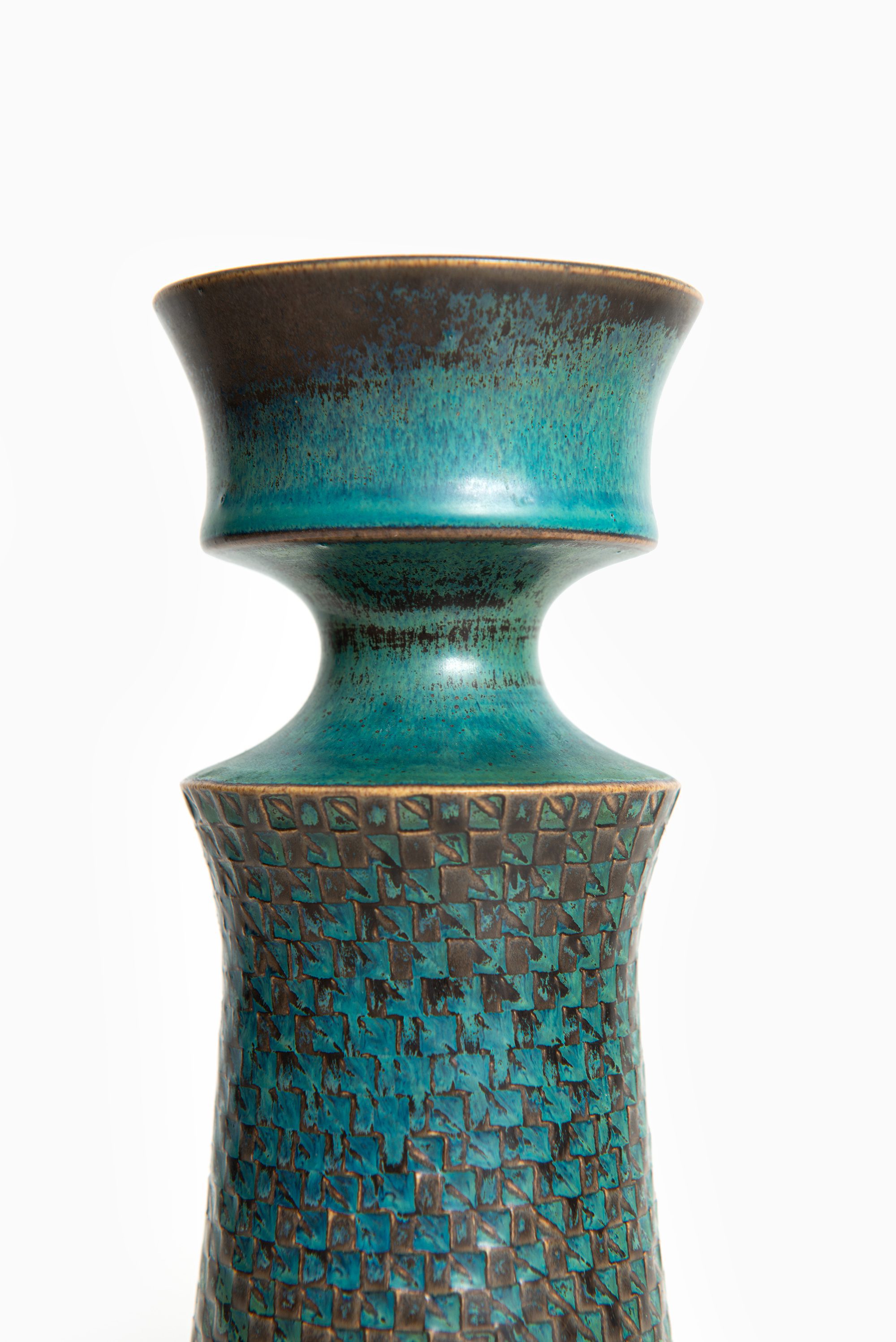 The dimensions of the vase are 17.5 cm in height and 8 cm in diameter (approximately 6.9 inches high and 3.1 inches in diameter). This object represents a quintessential example of Scandinavian mid-century studio ceramics, valued both for its formal qualities and its connection to one of the period’s most celebrated ceramicists.