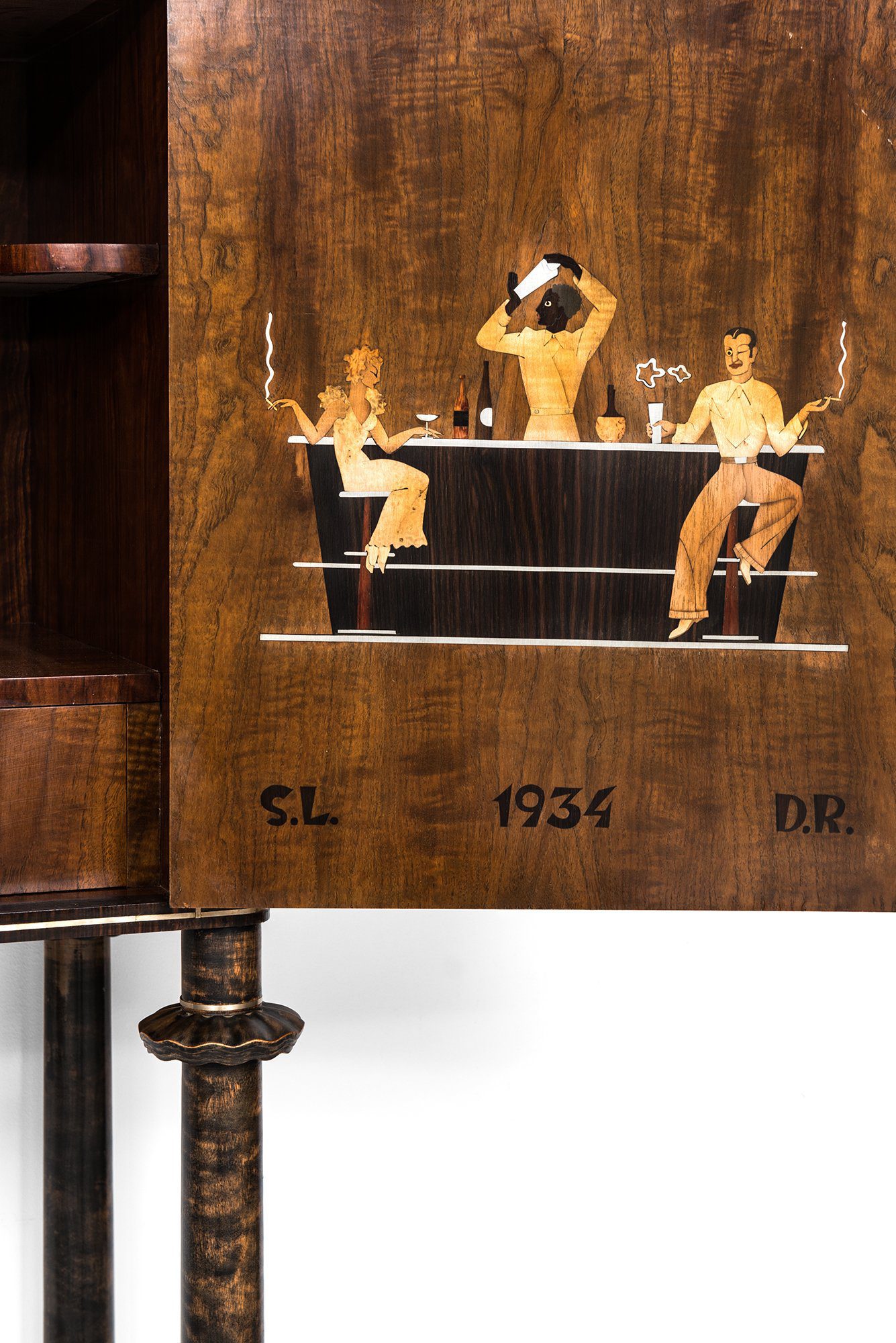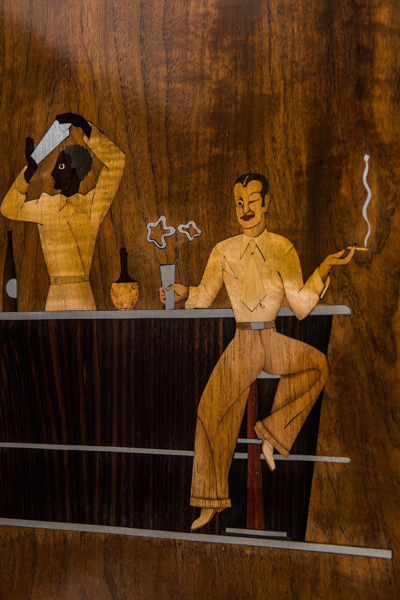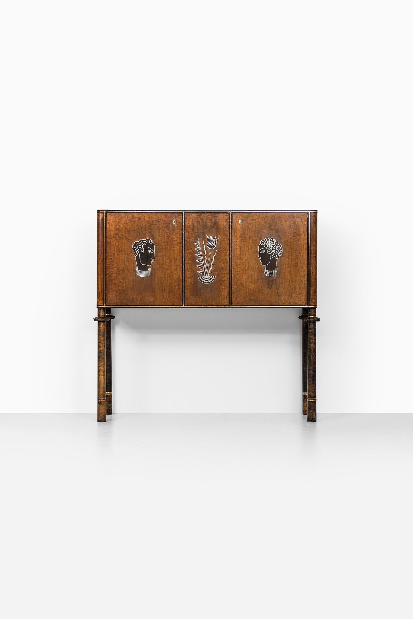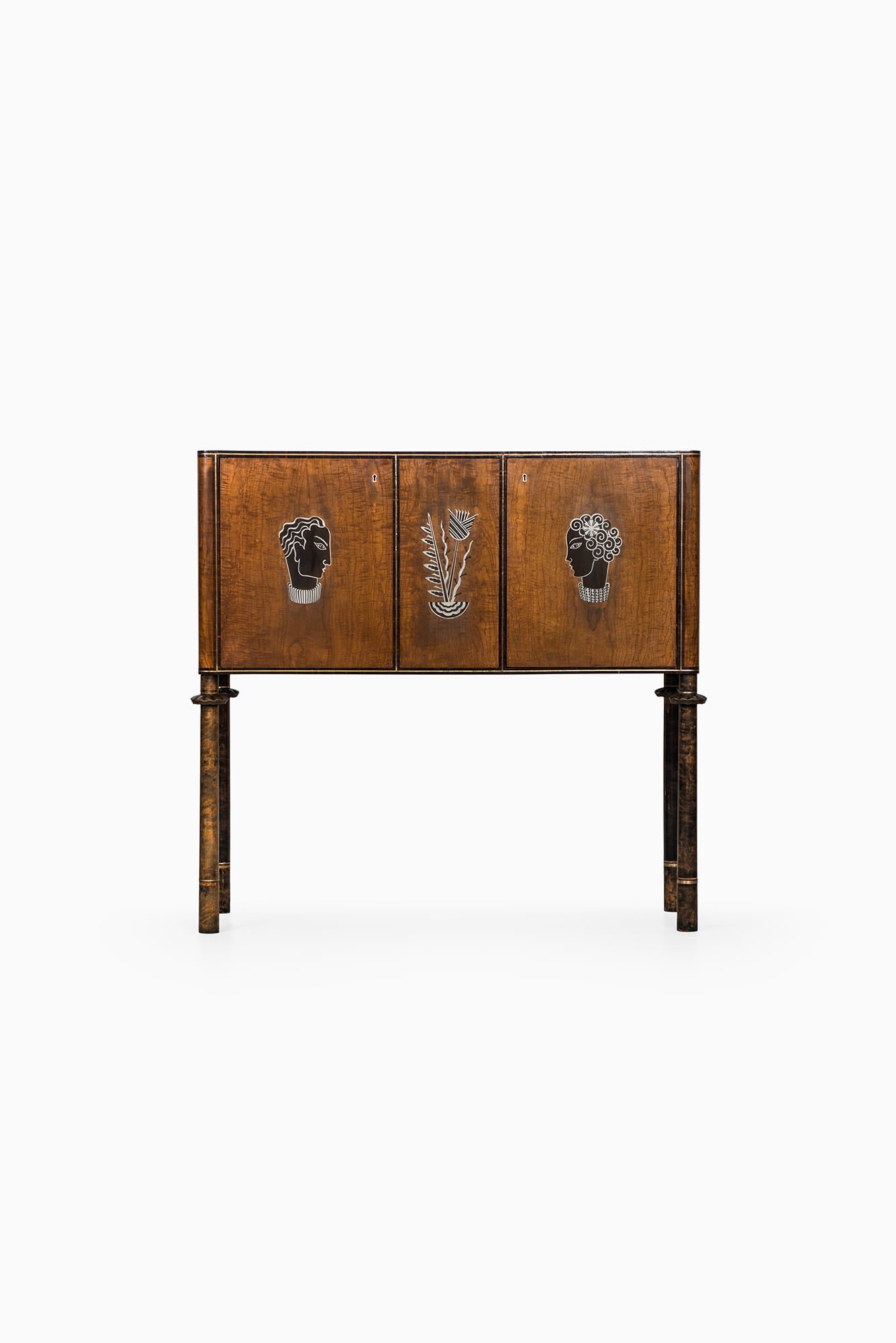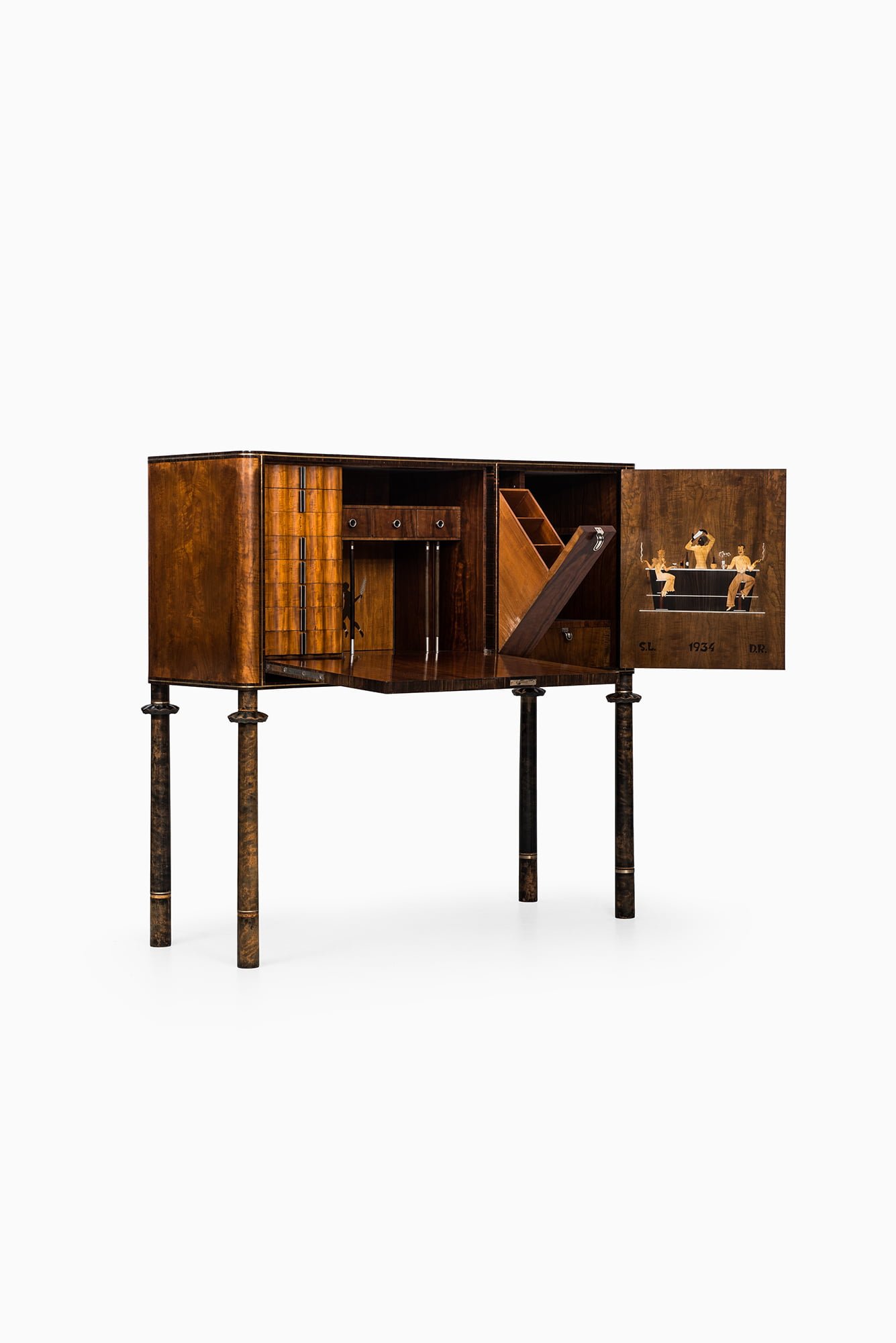 The façade is articulated with two doors featuring striking inlaid imagery, including stylized faces and botanical elements rendered in contrasting woods and metals. The cabinet stands elevated on four turned legs with carved collars and dark-stained finish, giving it a light and elegant stance despite its substantial proportions. The interior is highly detailed, containing drawers, shelving, and bottle compartments, as well as a fold-down section for preparing drinks. The right interior door is decorated with a lively inlaid bar scene showing three figures in a moment of revelry, an artistic and playful touch typical of the period’s decorative arts.