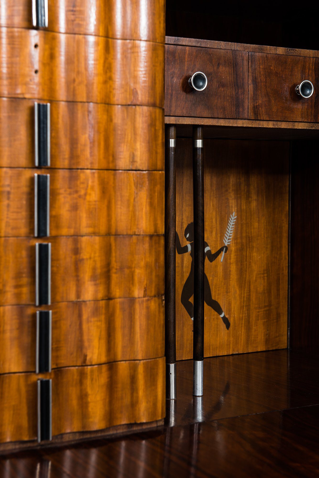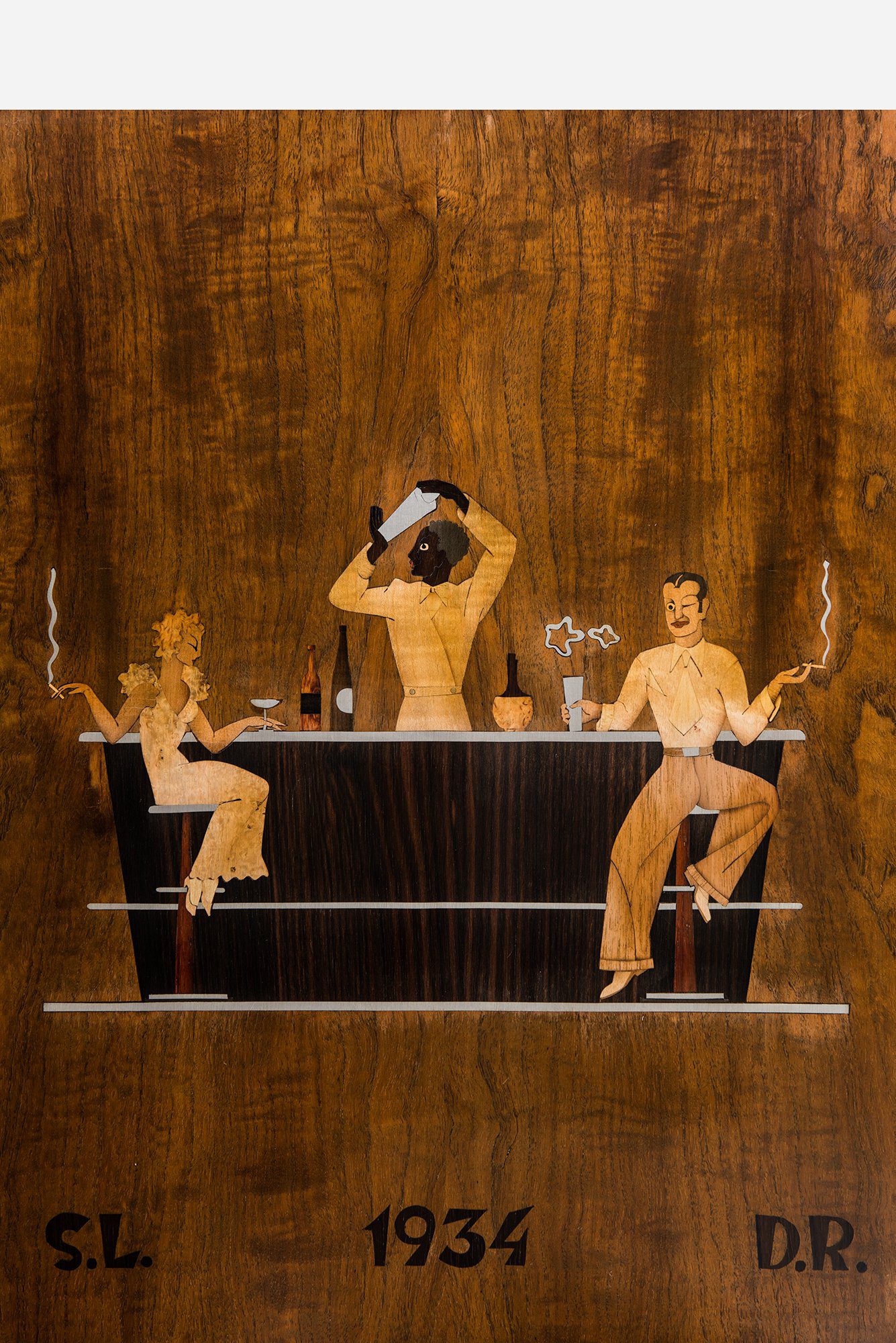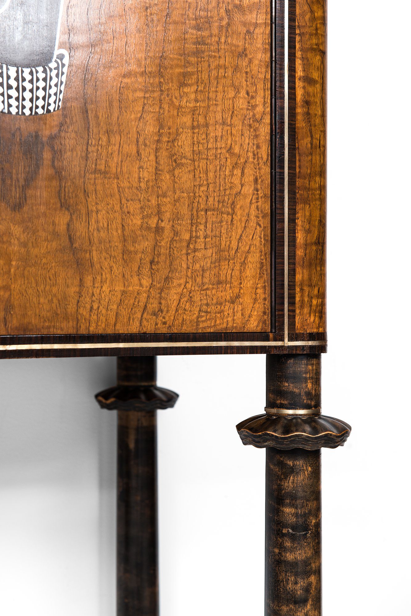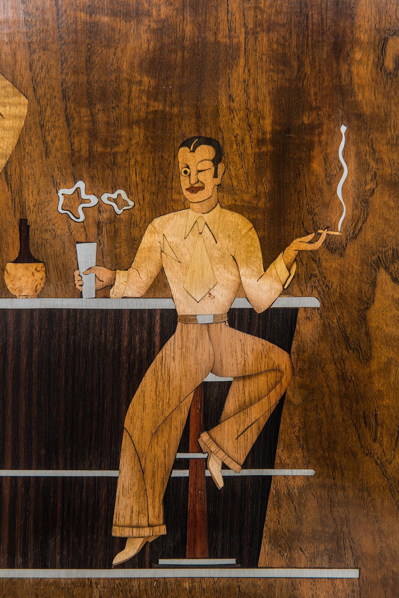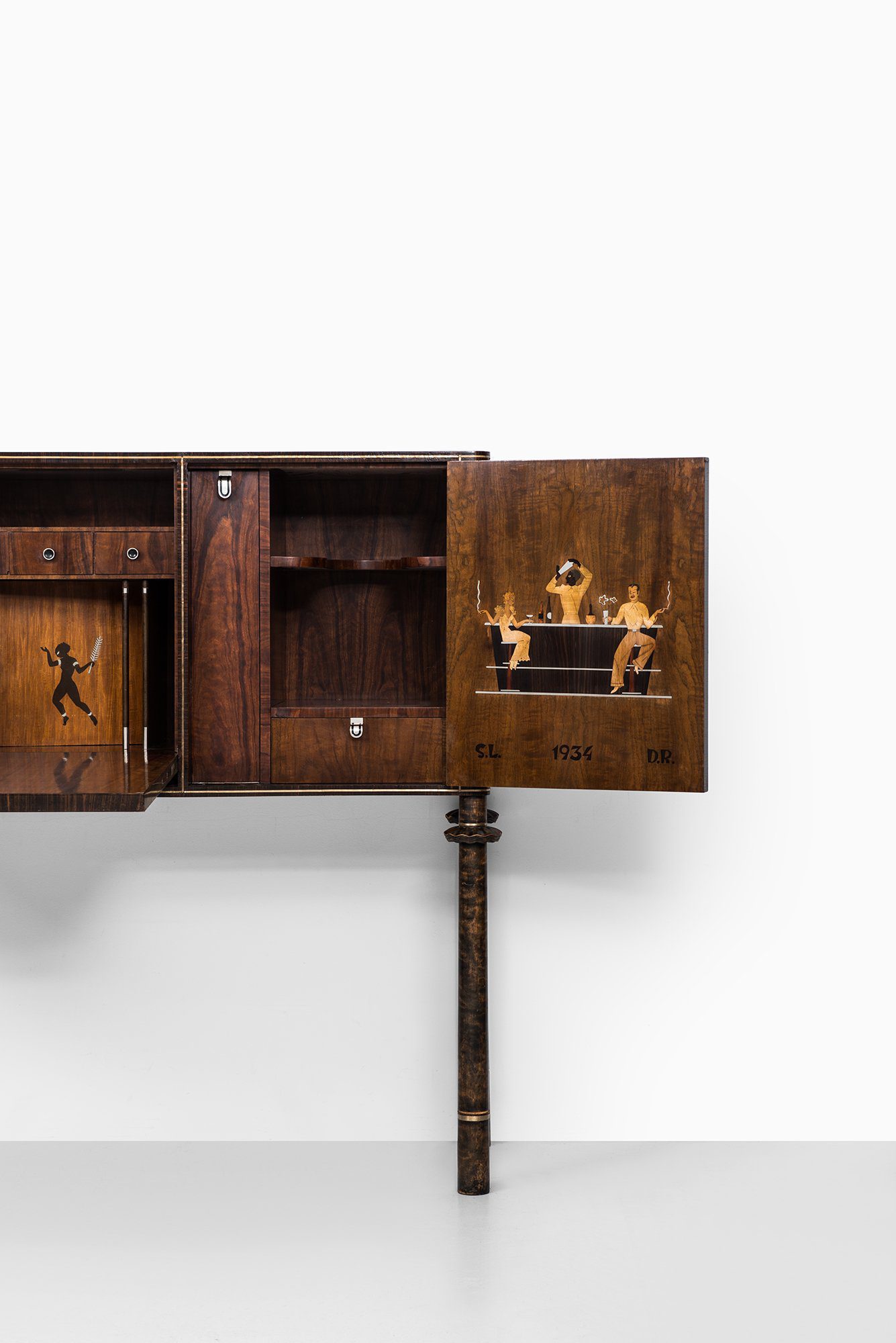 The piece is firmly rooted in the Art Deco style, visible in its geometric proportions, choice of exotic veneers, and luxurious decorative program. The combination of materials—teak, macassar, lemonwood, pewter, and silver—creates a rich visual contrast, while the inlays provide narrative and character, elevating the cabinet beyond a purely functional object into a statement of design skill.