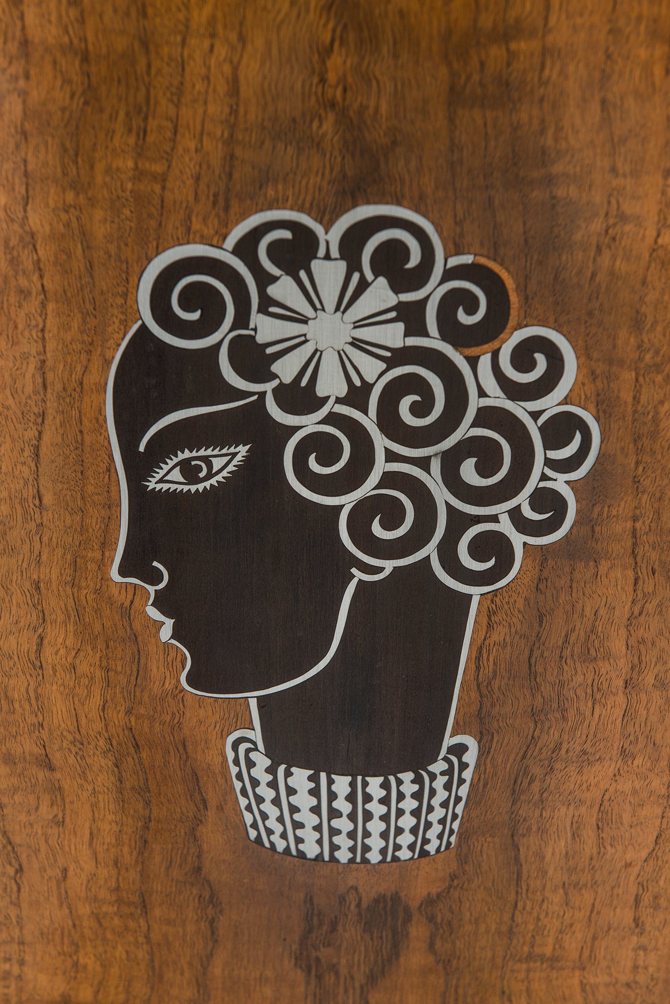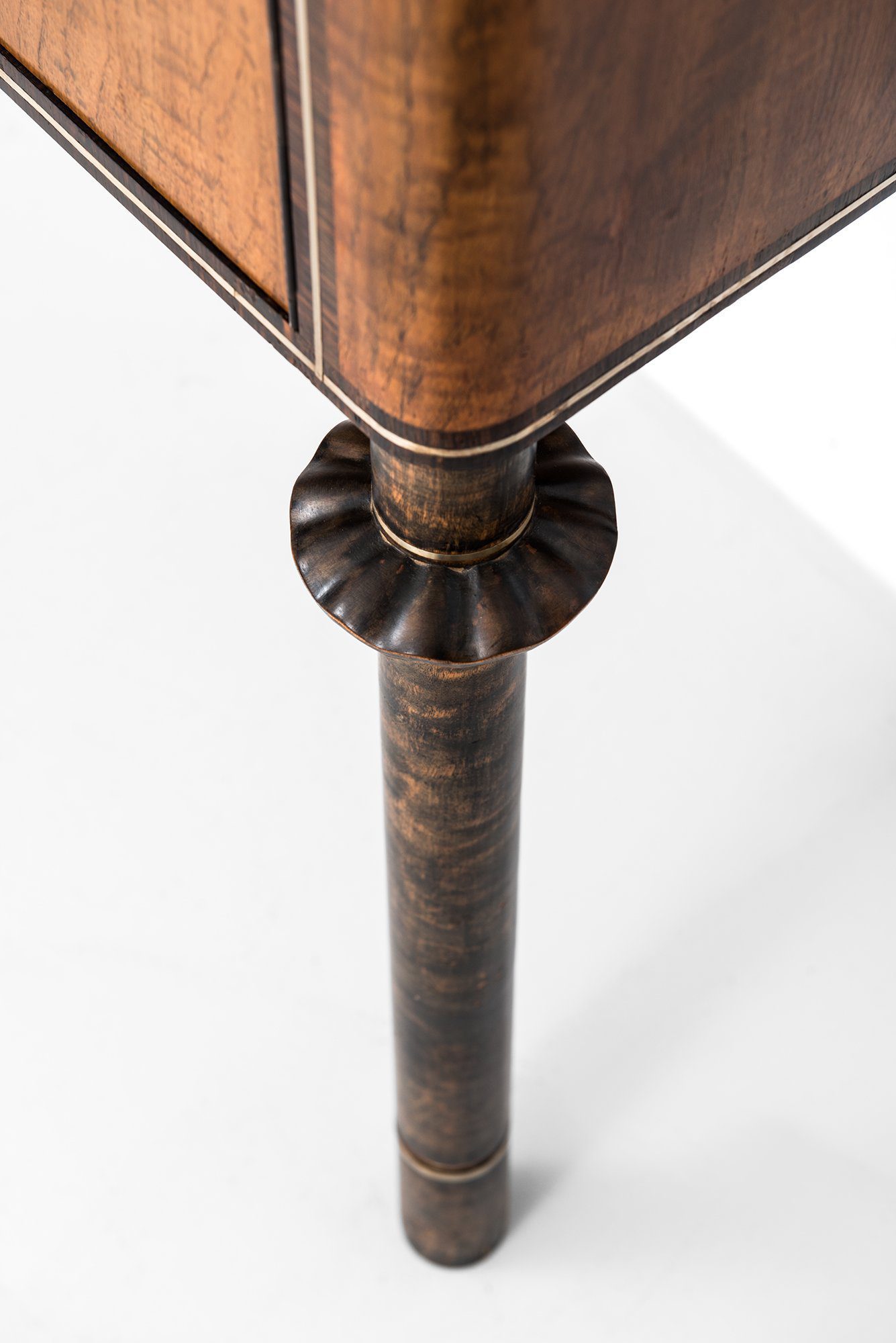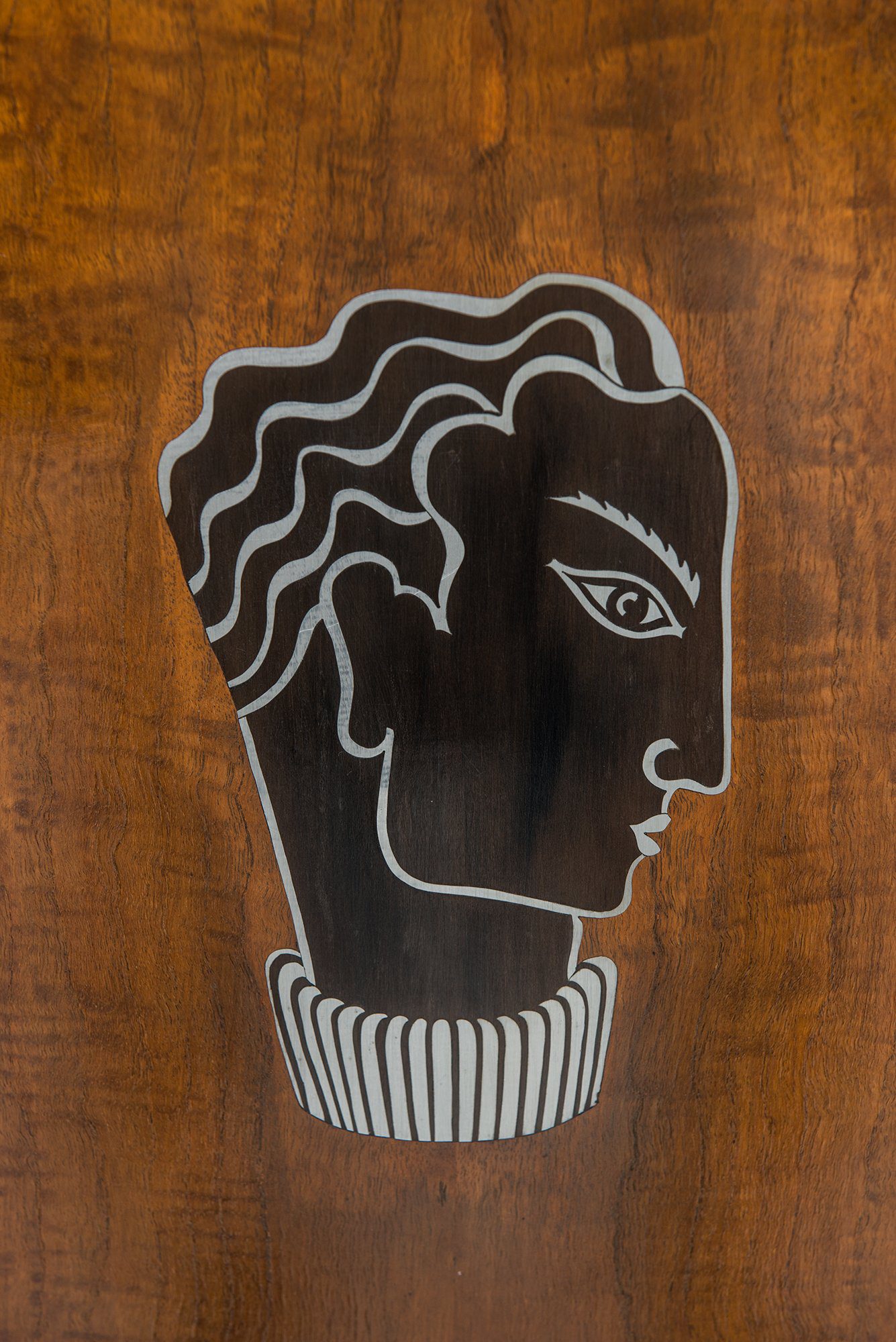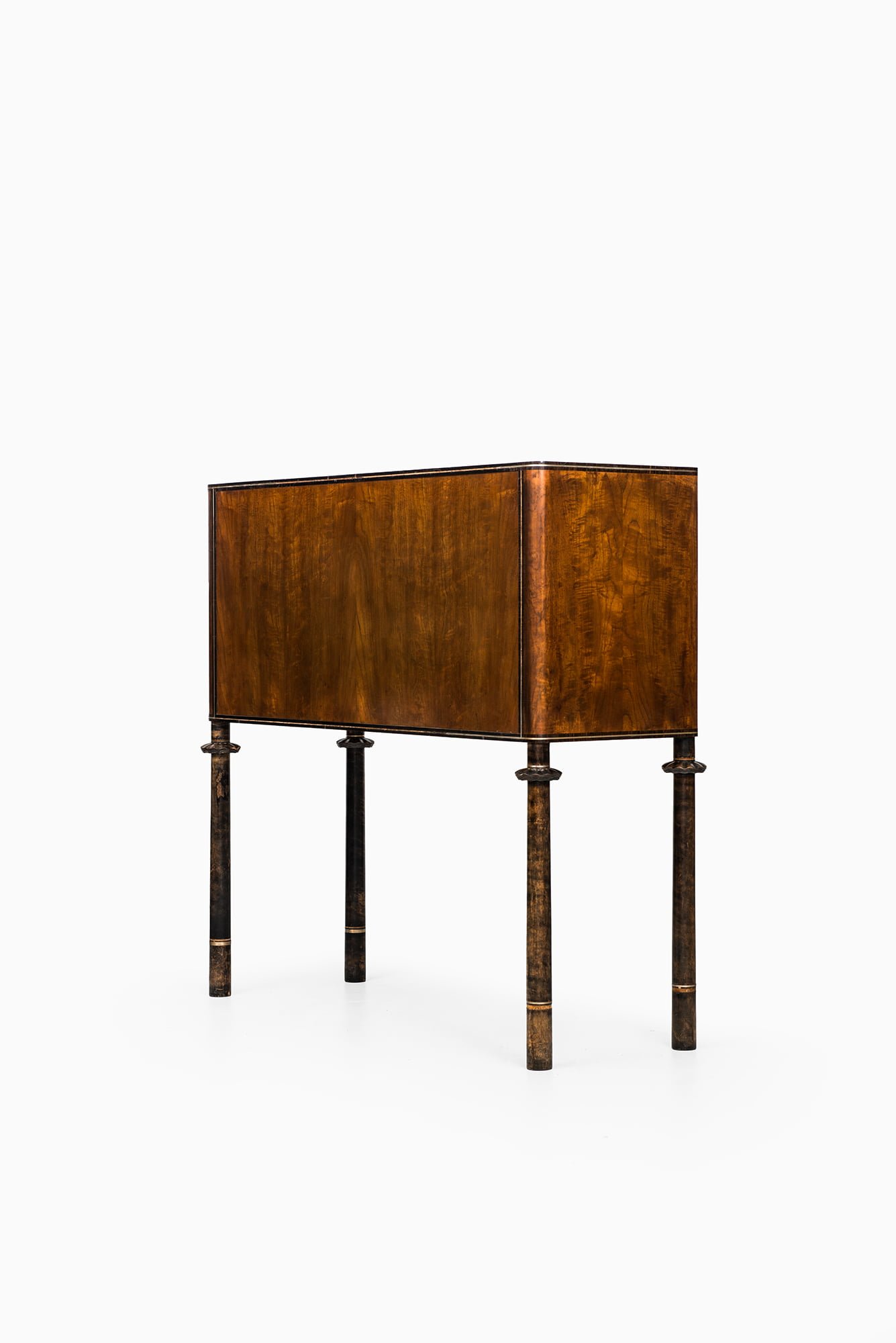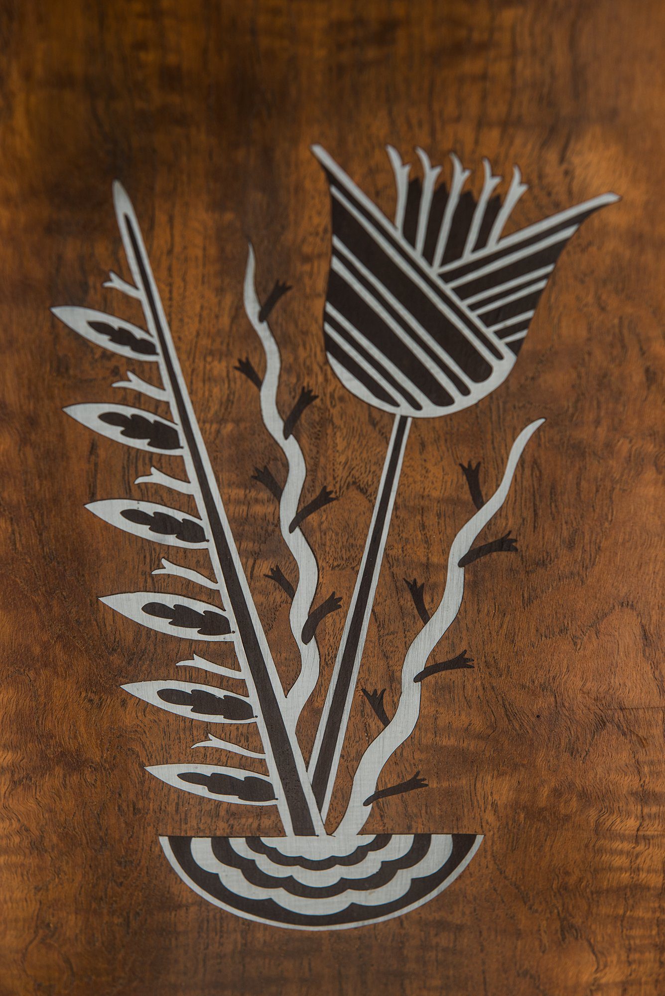 The piece is firmly rooted in the Art Deco style, visible in its geometric proportions, choice of exotic veneers, and luxurious decorative program. The combination of materials—teak, macassar, lemonwood, pewter, and silver—creates a rich visual contrast, while the inlays provide narrative and character, elevating the cabinet beyond a purely functional object into a statement of design skill.