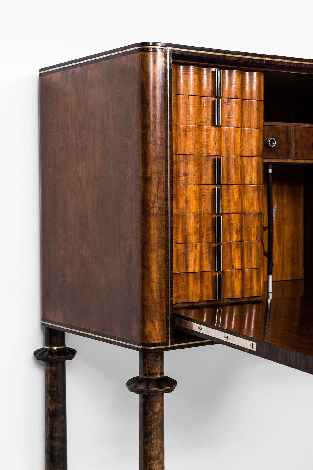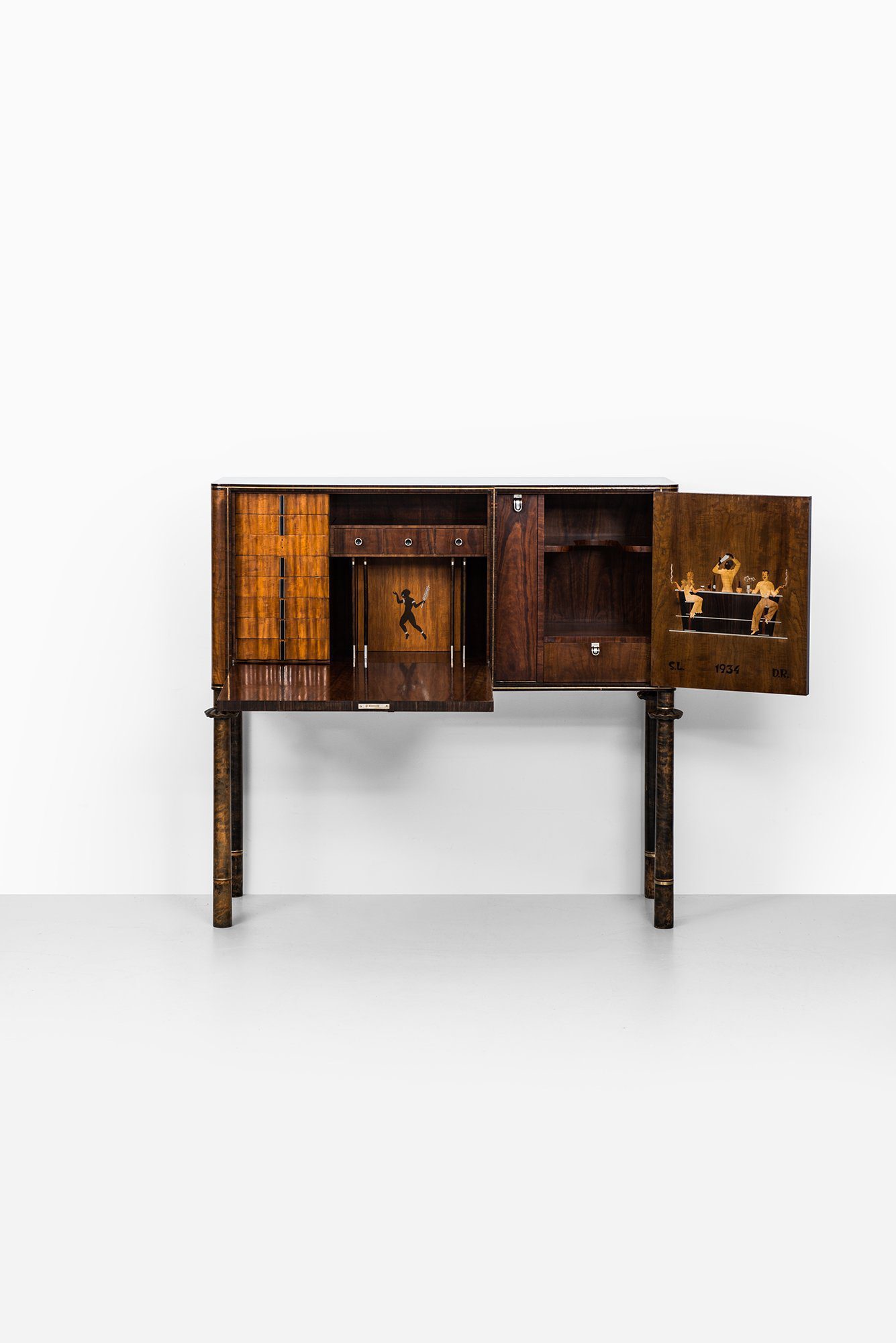 This bar cabinet is a unique and historically significant piece, designed in collaboration by Sture Lindholm and David Rosén and produced by Per Jönsson’s Verkstäder in Stockholm, Sweden, in 1934. It was executed as an apprentice work (gesällprov), demonstrating the highest level of craftsmanship and creativity. The cabinet is constructed from teak, macassar ebony, lemonwood, and other fine woods, with intricate inlays of pewter, silver, and additional woods that create decorative motifs on the exterior and interior panels.