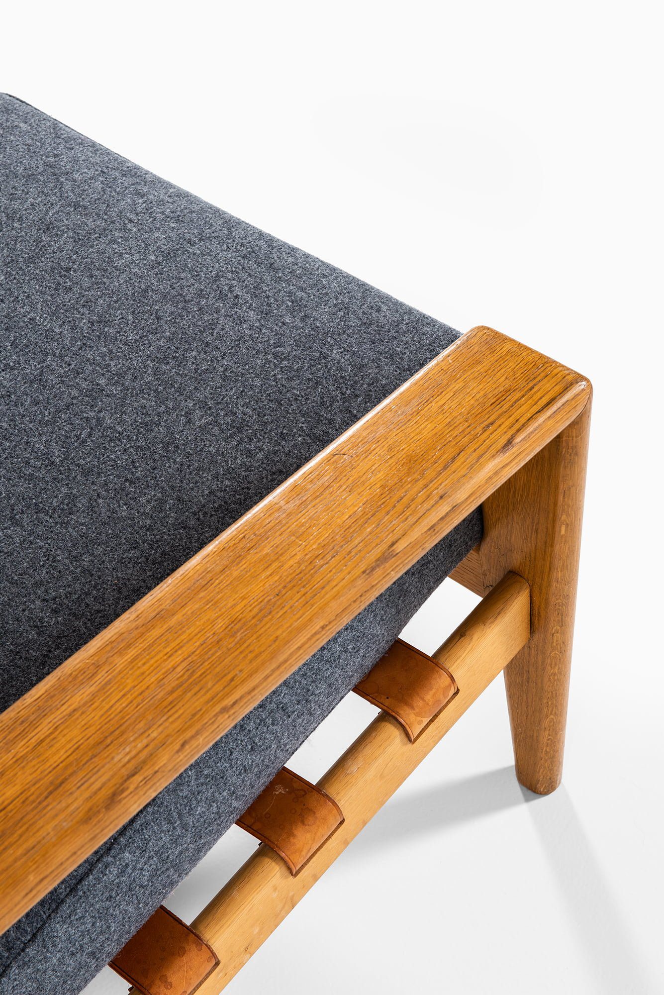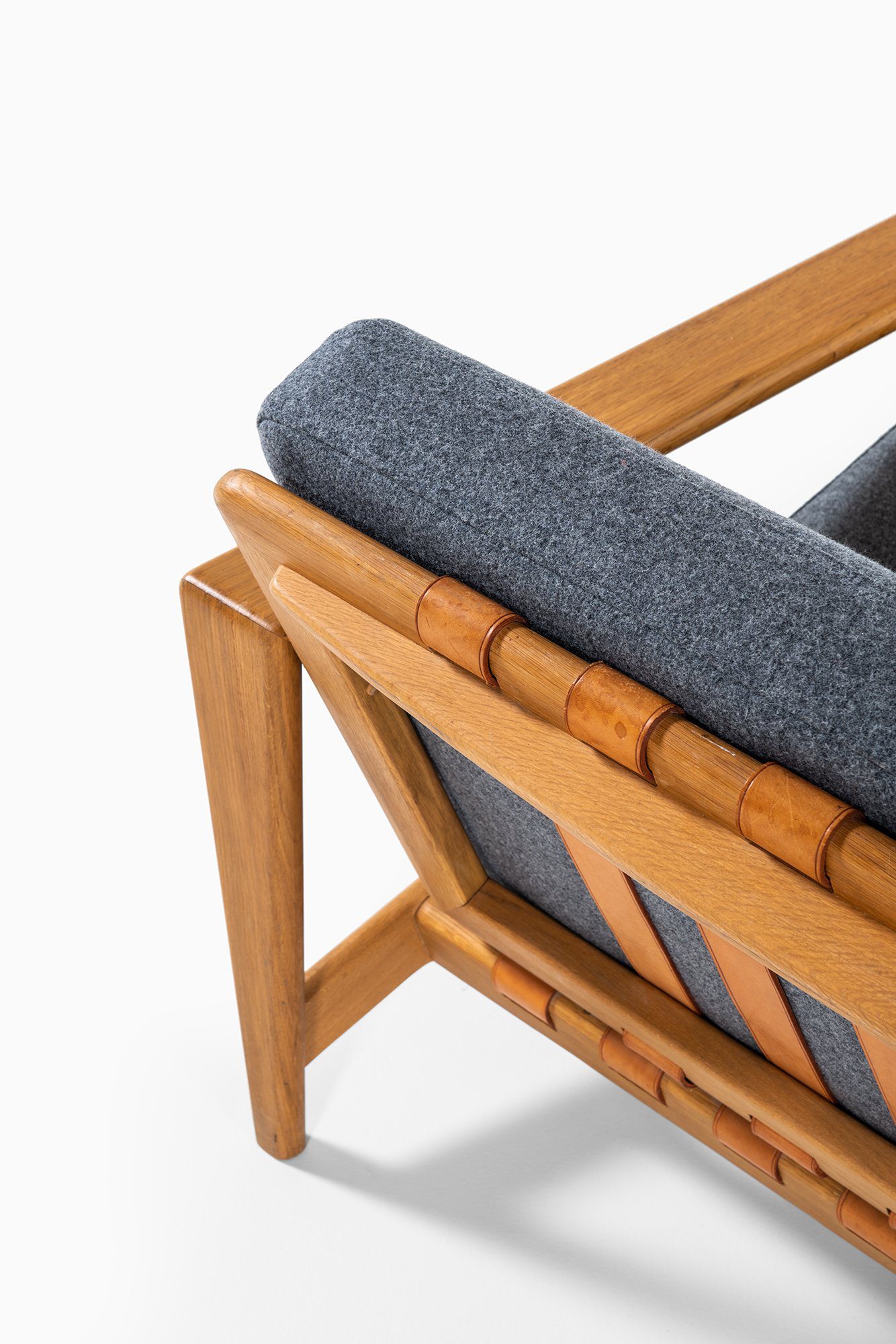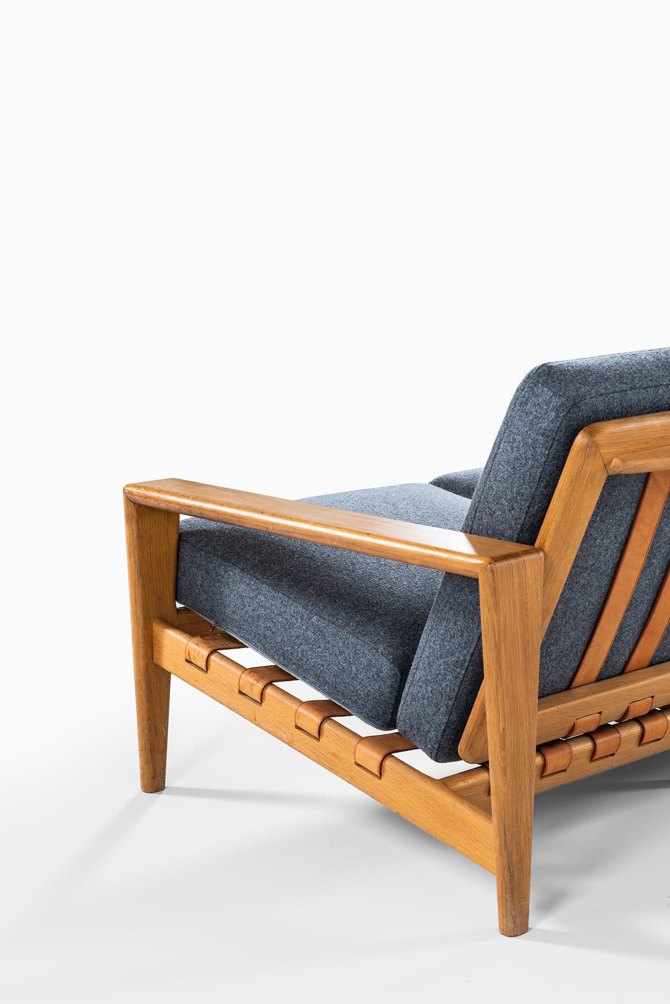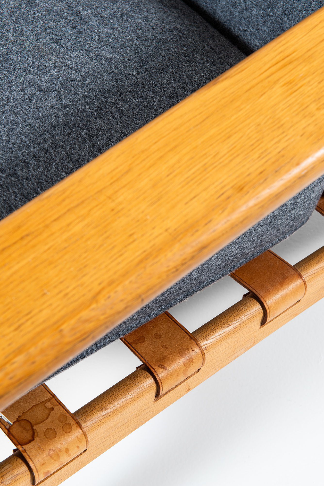 Constructed in solid oak, the frame features clean, geometric lines and a distinctive open structure with exposed joinery. The back and seat are supported by interwoven brown leather straps that not only provide functional elasticity but also contribute to the visual rhythm of the piece. These elements reflect Skogh’s ability to integrate functional innovation with a refined sculptural sensibility.