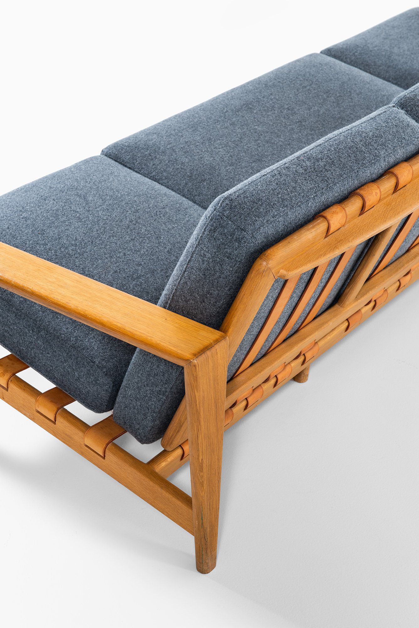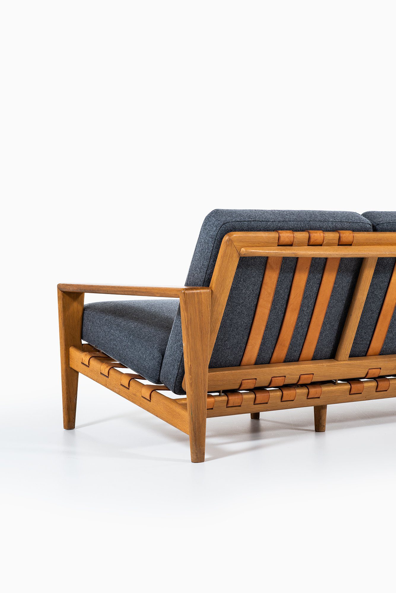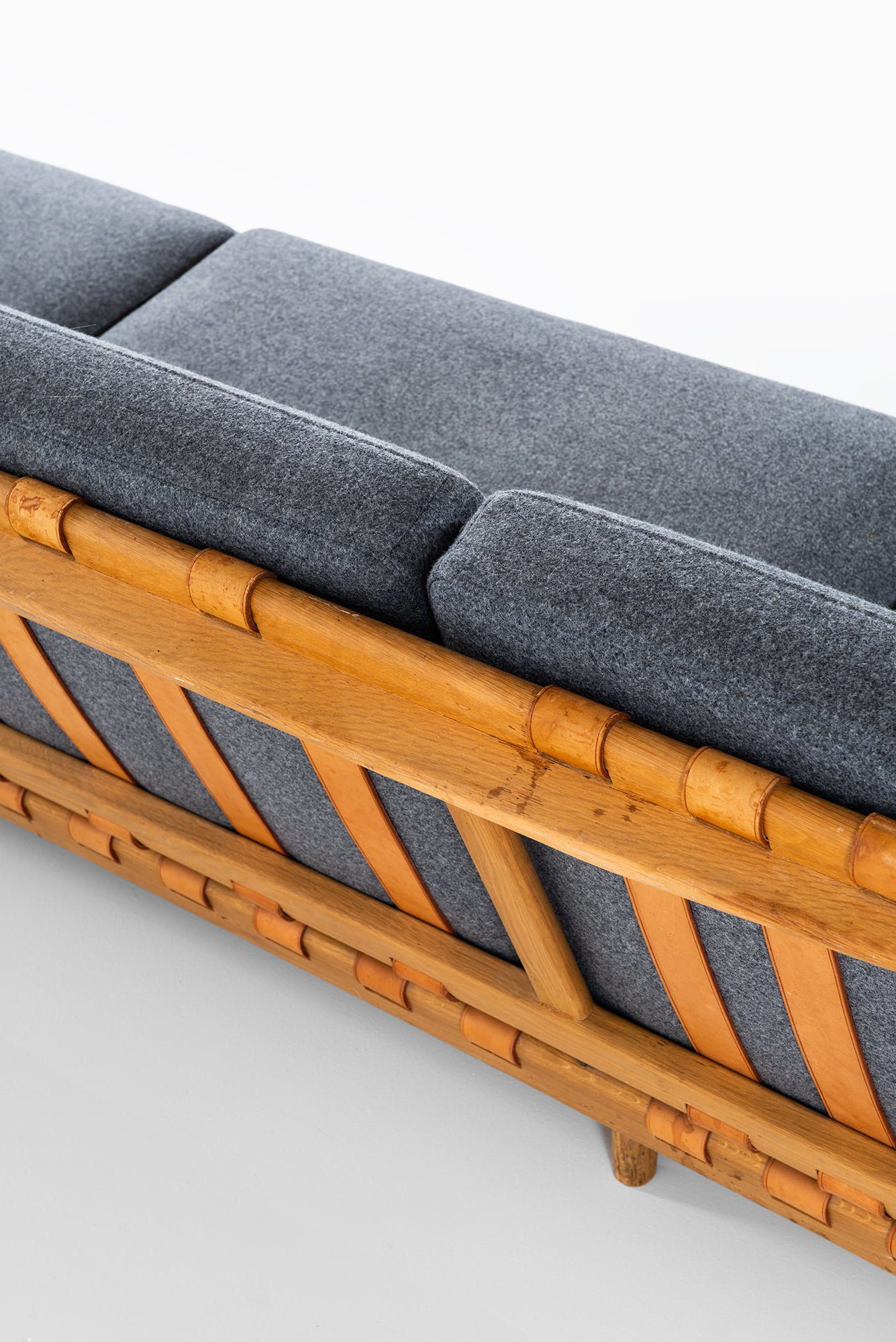 The cushions have been newly reupholstered in a textured grey wool fabric, offering a soft contrast to the golden tones of the oak and the patinated leather. The composition achieves a balance between structural strength and visual lightness, making the sofa both comfortable and striking from every angle.