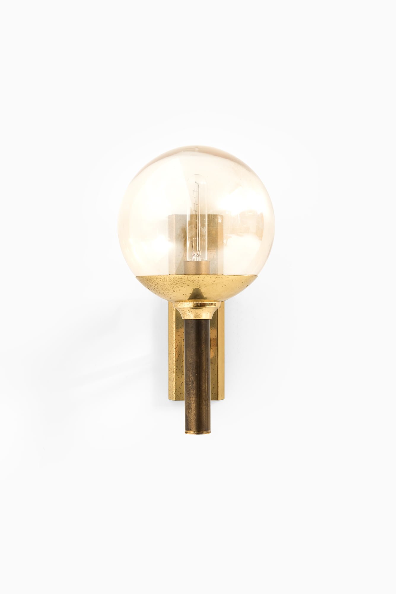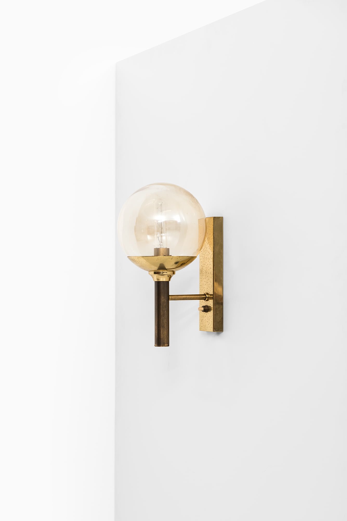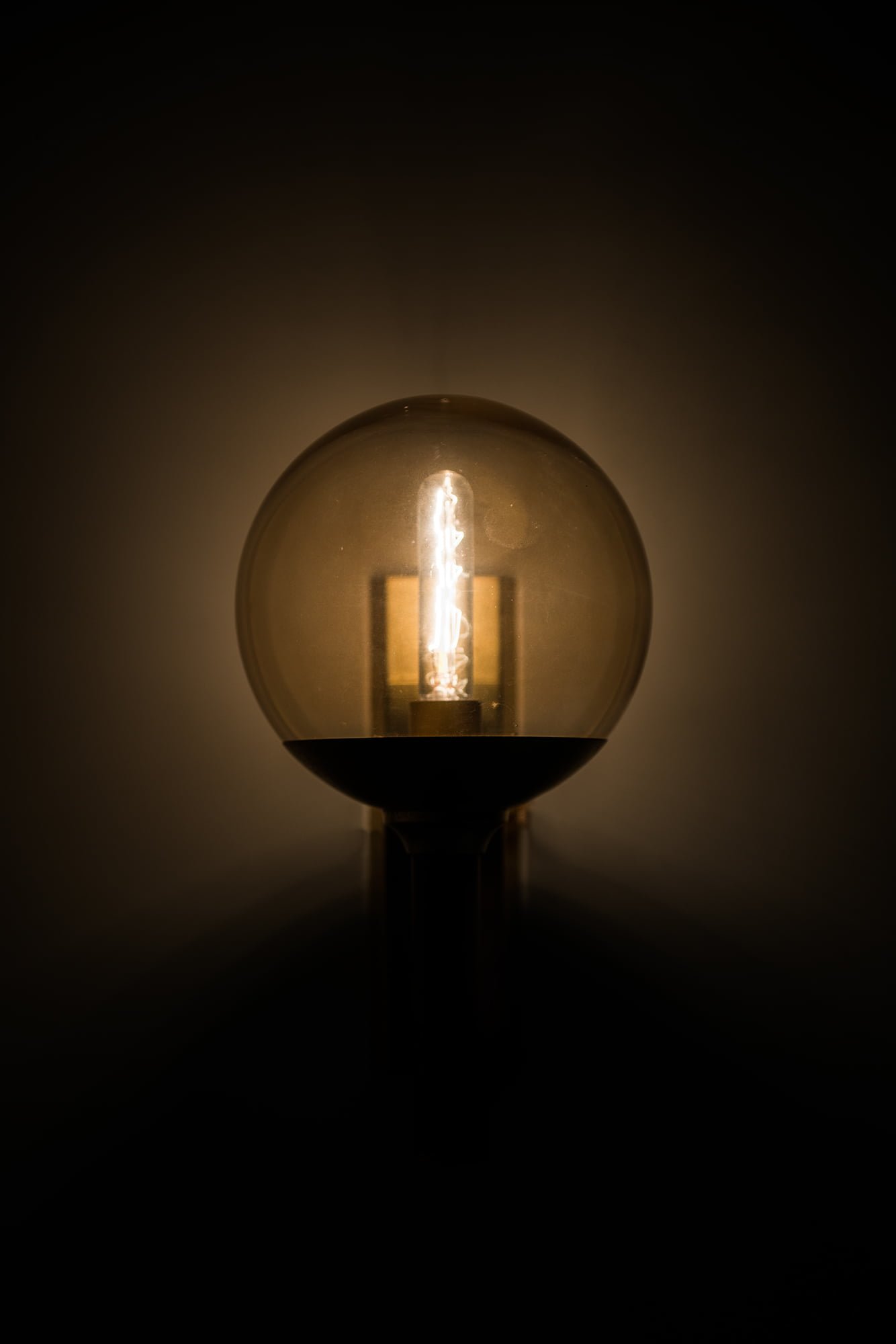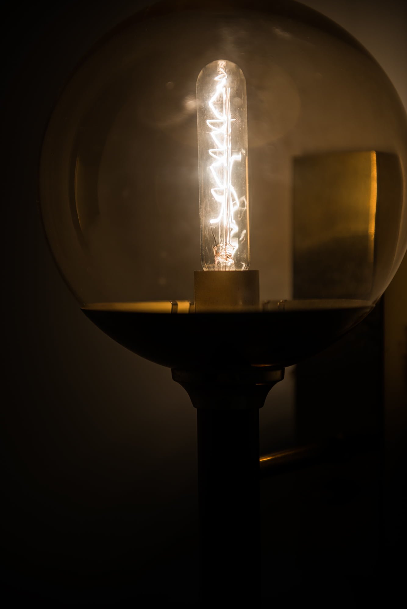 These rare wall lamps were designed by Sven Mejlstrøm and produced by Mejlstrøm Belysning in Norway during the 1960s. The lamps are executed in brass with a cylindrical arm and a rectangular wall plate, supporting a hemispherical brass cup and a clear glass globe that encases the light source. The combination of polished brass and glass creates a warm and atmospheric light when illuminated, with the globe softly diffusing the glow.
