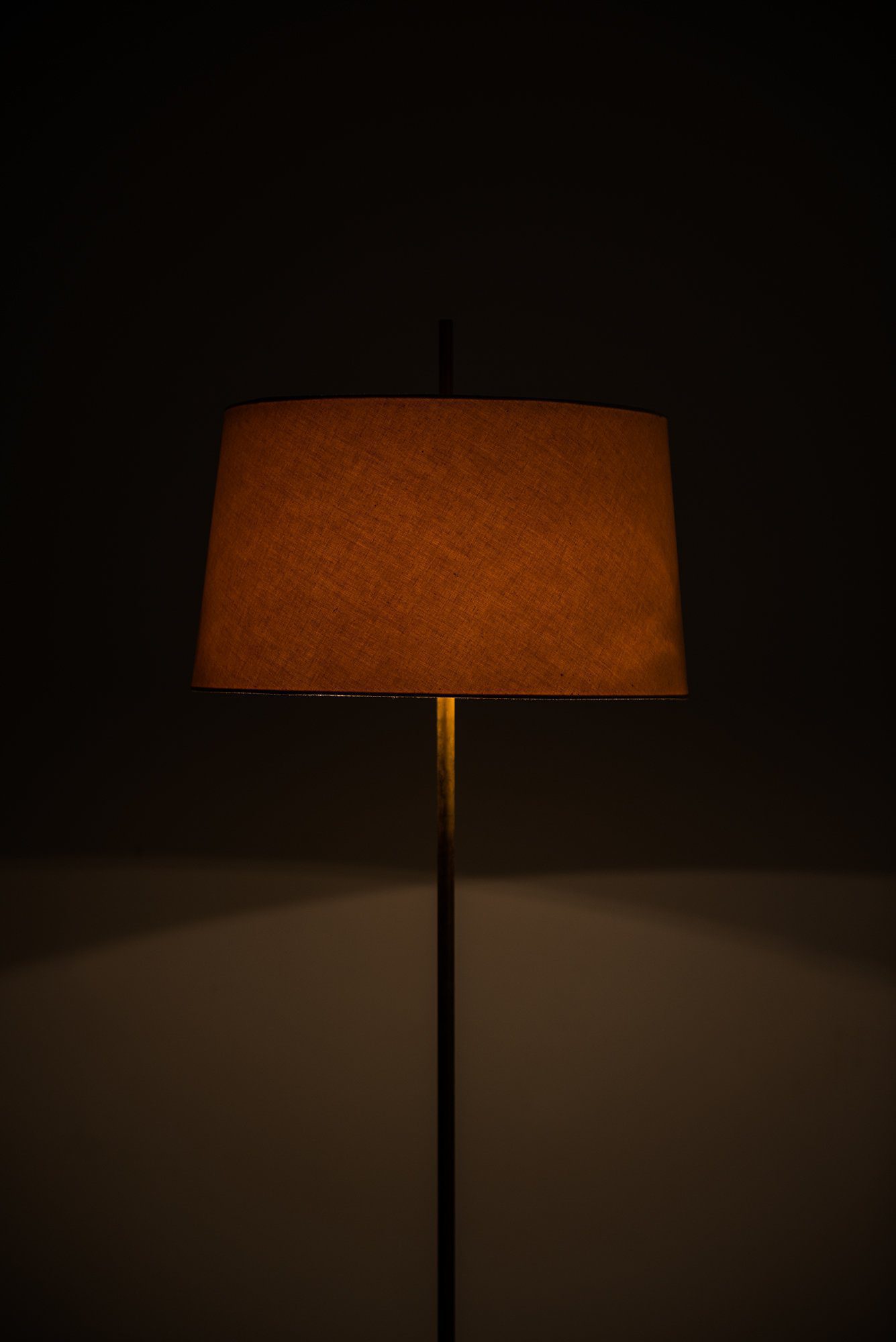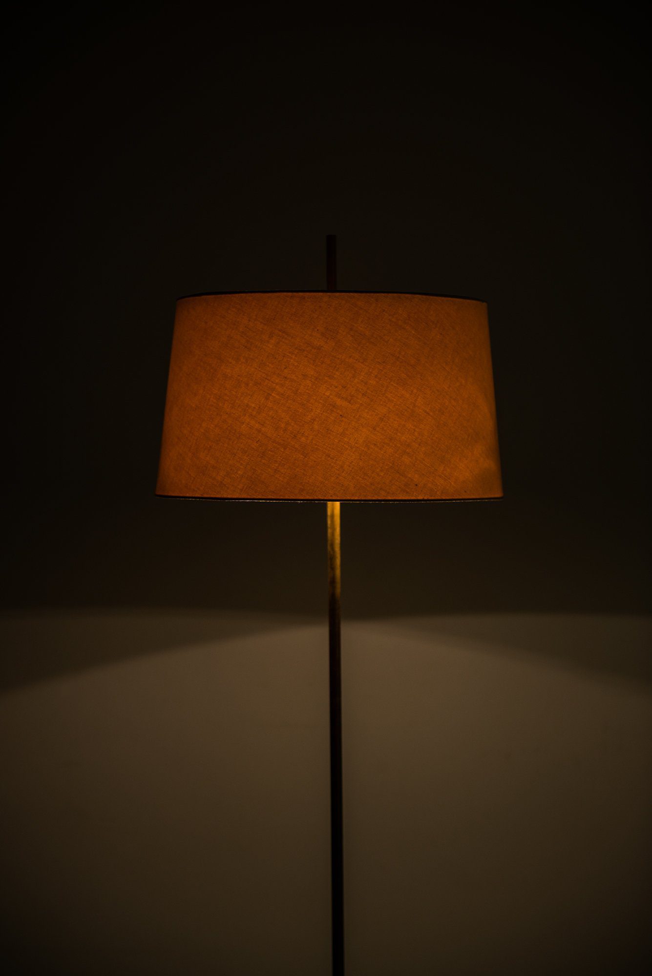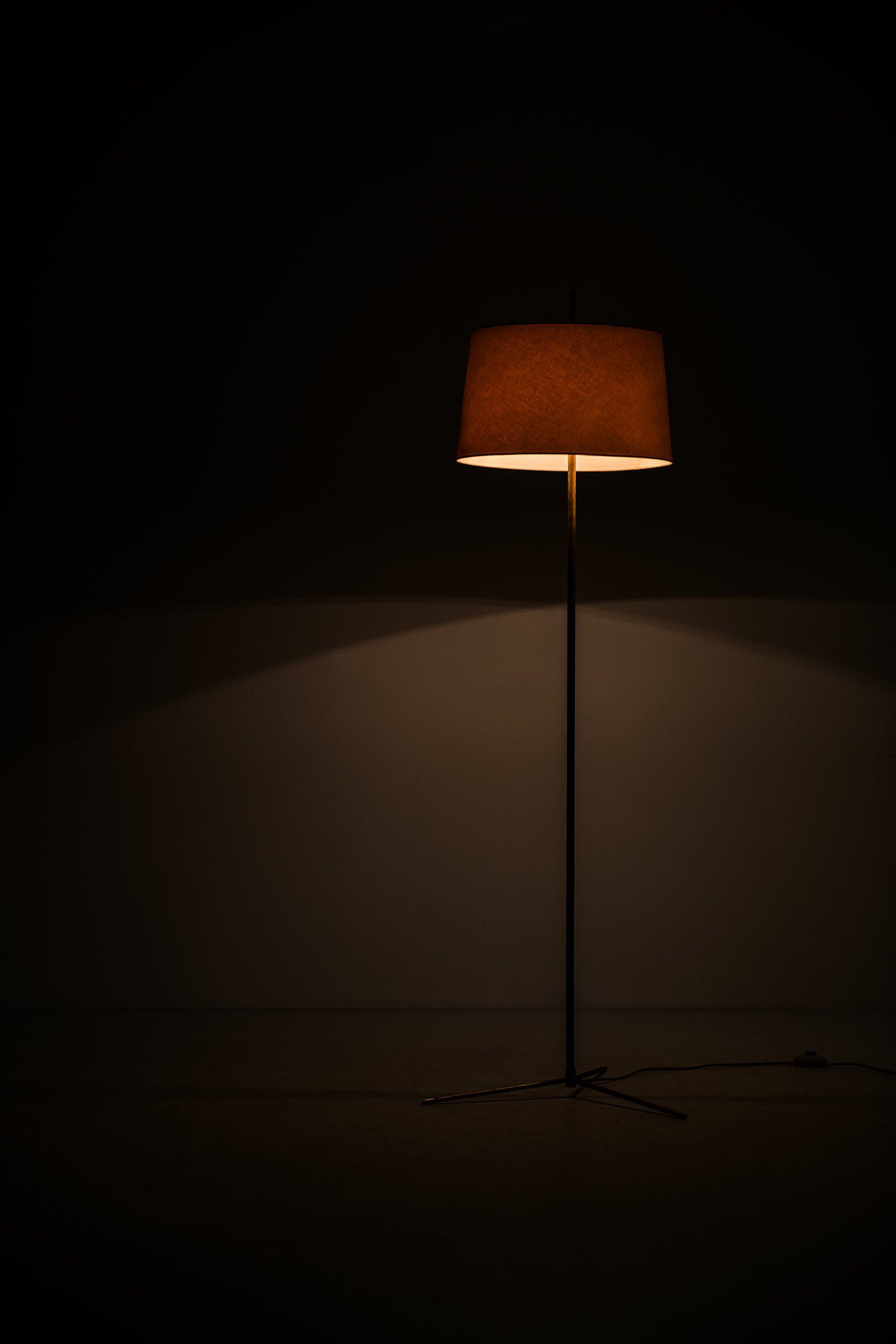 The original lampshade, preserved in good condition, is executed in a light fabric that diffuses the light evenly. When lit, the shade provides a warm, ambient glow, complementing the natural tones of the brass structure.