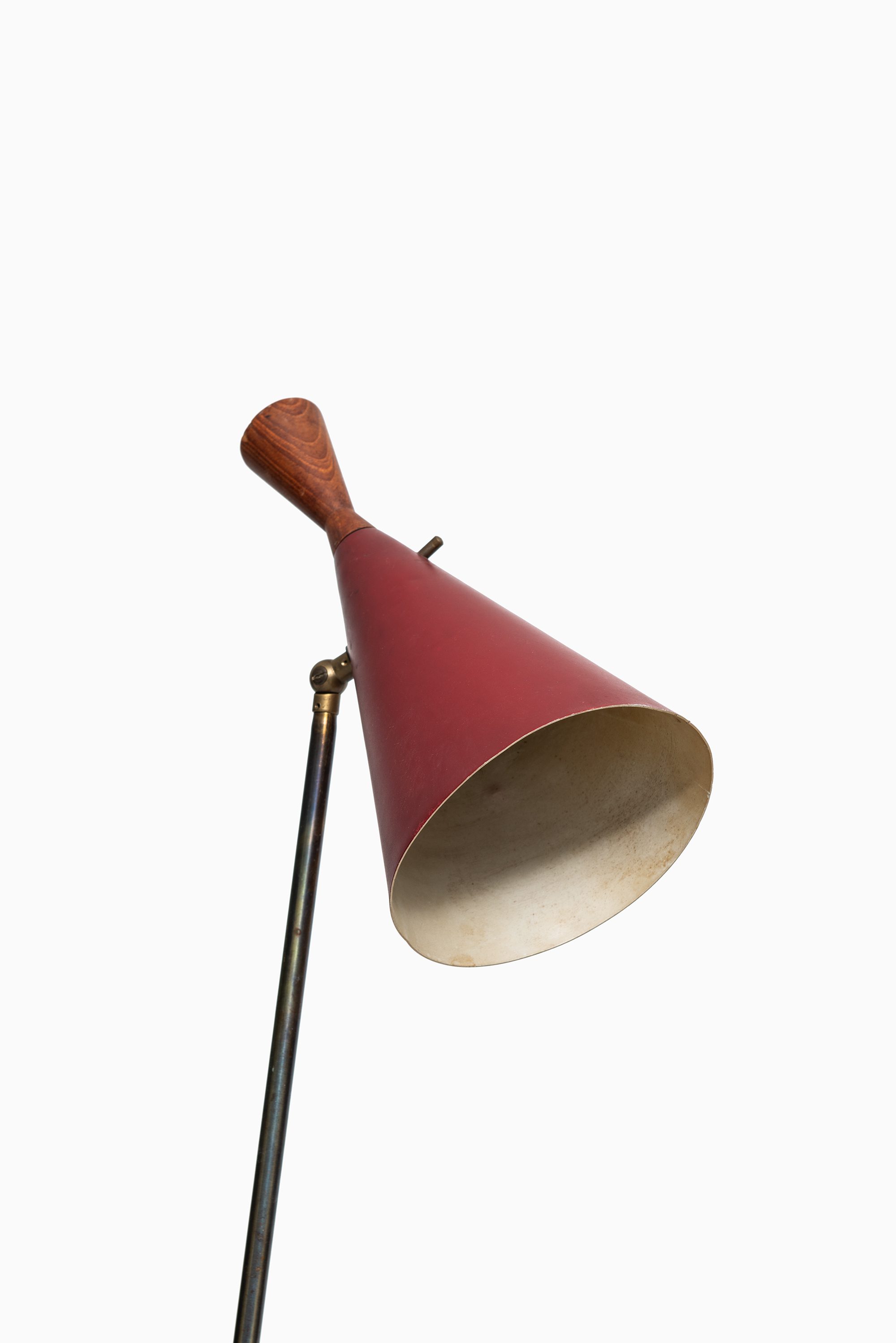 The lamp features a slender, asymmetrical brass structure set on three elegantly angled legs that provide both visual lightness and structural stability. At its center, a teak shelf is integrated into the design, serving as a small functional surface while visually grounding the composition. Above, the lamp is crowned with a sharply conical shade in deep red lacquered metal, accented by a teak finial, creating a warm contrast between the organic wood and the cool, industrial metal. The shade is adjustable, allowing the light to be directed as needed, which makes the piece not only decorative but also highly practical.