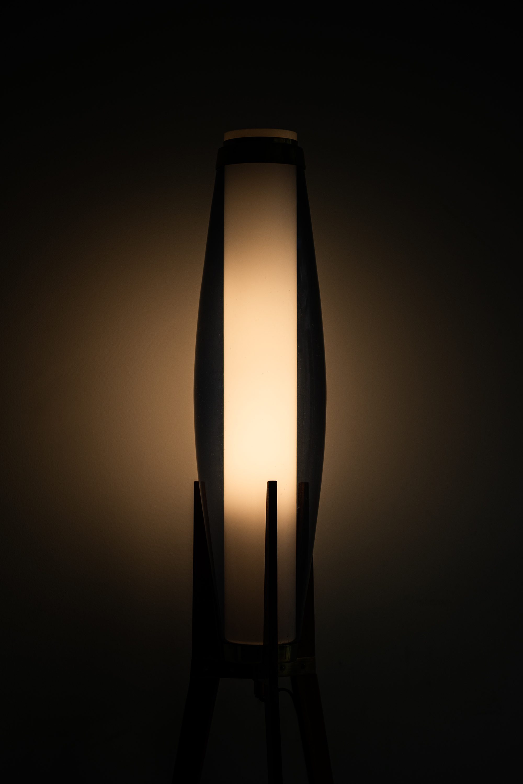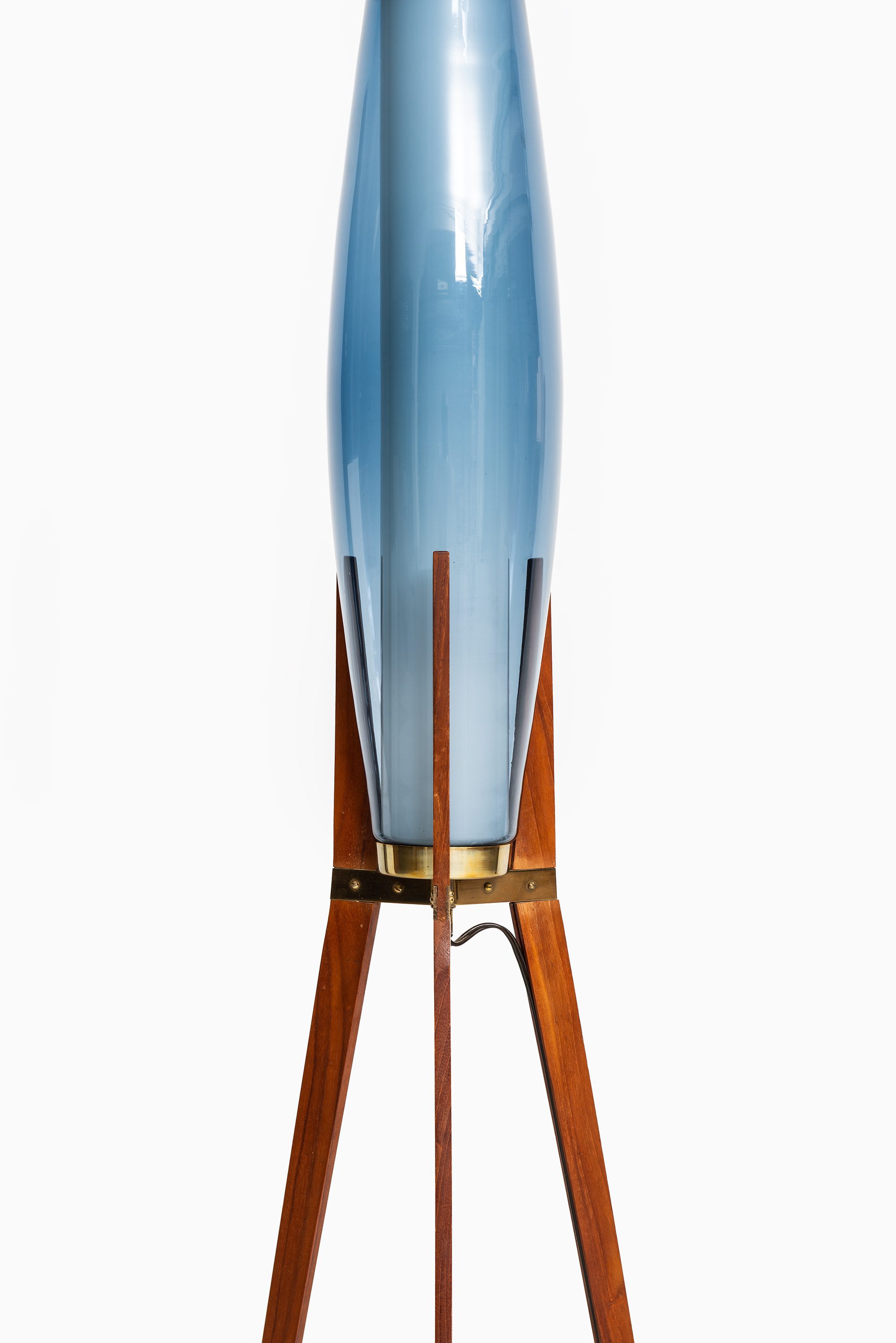 This rare floor lamp was designed by Svend Aage Holm Sørensen and produced by Holm Sørensen & Co in Denmark during the 1950s. It is composed of a sculptural teak frame with tapered legs joined by a brass cross-brace, supporting an elongated opal glass shade in a distinctive soft blue tone. The form is both architectural and organic, with the tall, slender silhouette characteristic of mid-century Scandinavian lighting design.