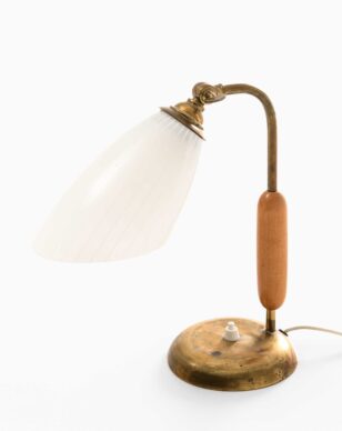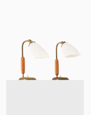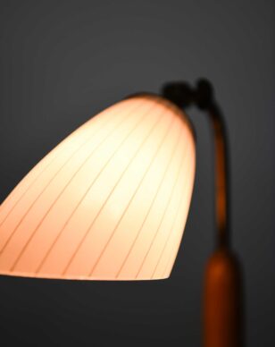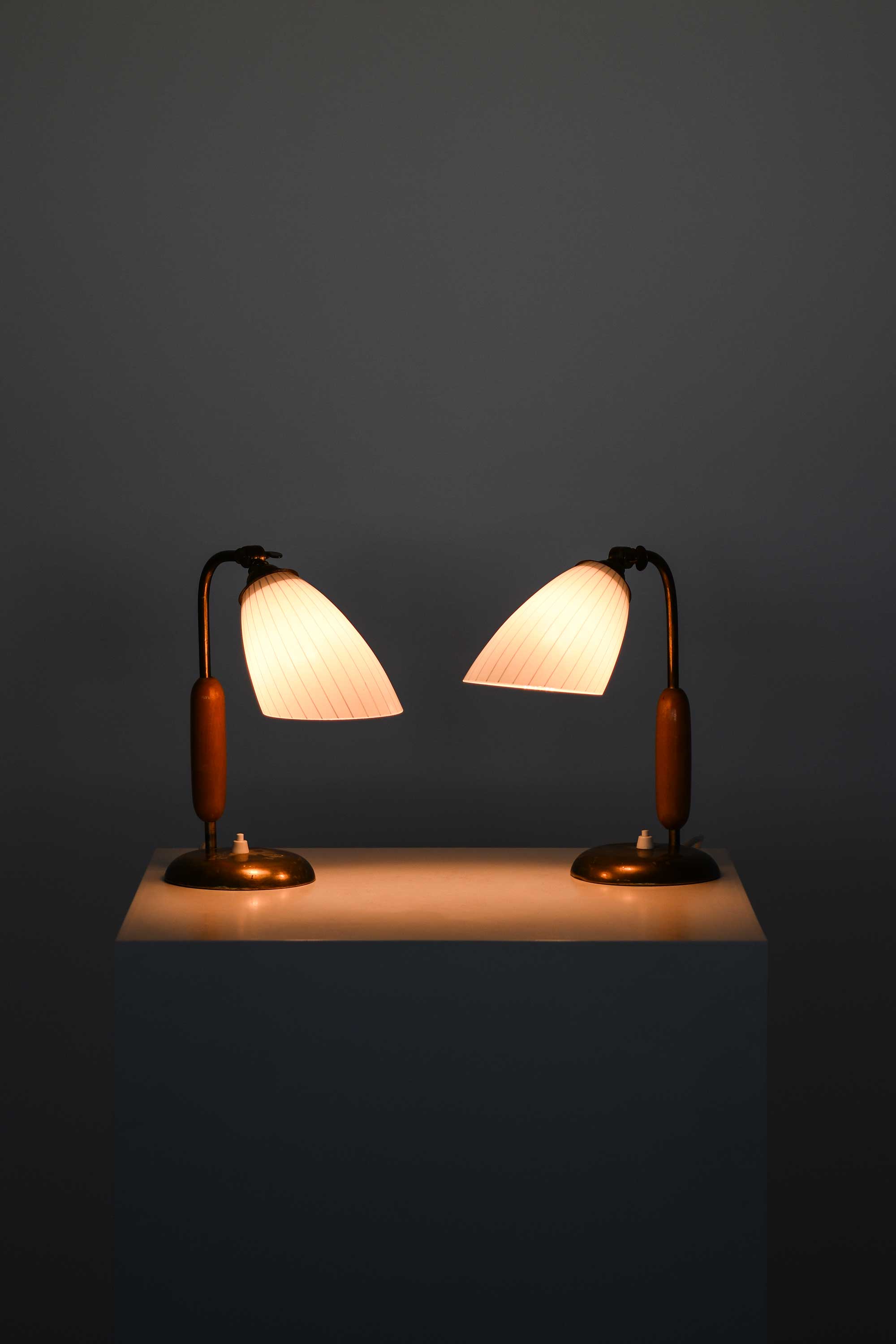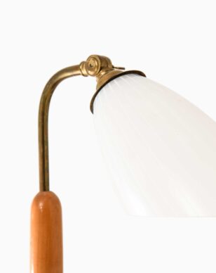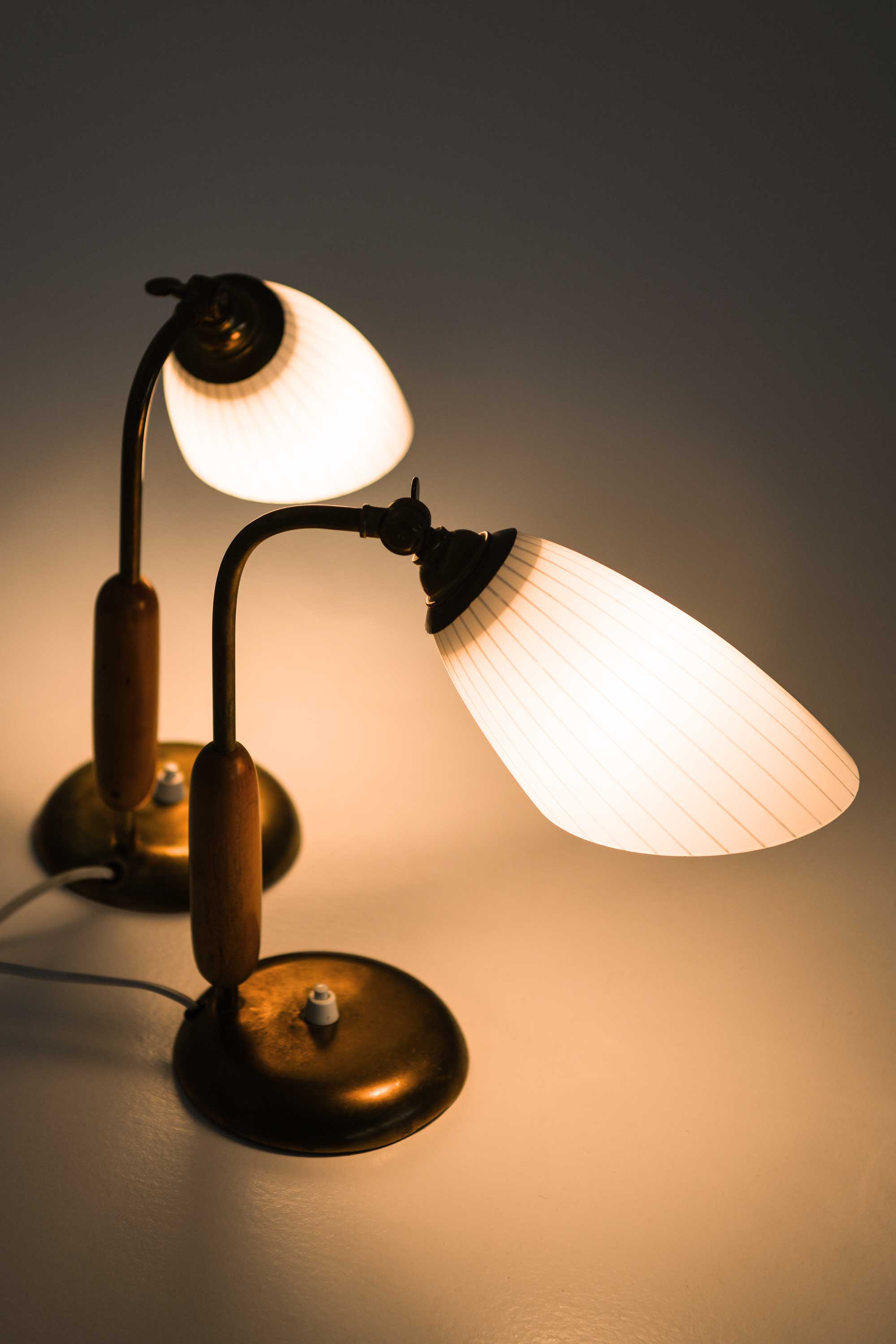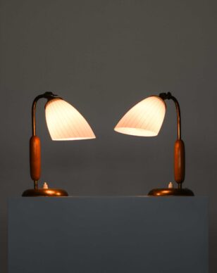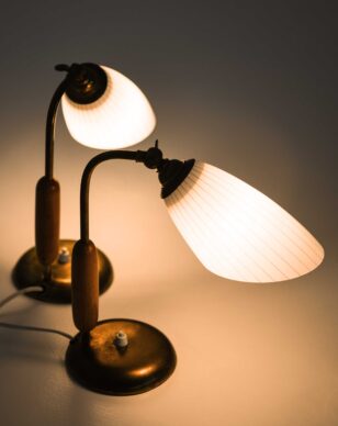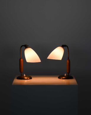 These lamps are characteristic of a transitional period in Scandinavian lighting design, where handcrafted elements such as wood turning and glasswork were beginning to merge with the streamlined metal forms that would come to define the mid-century aesthetic in the following decades.