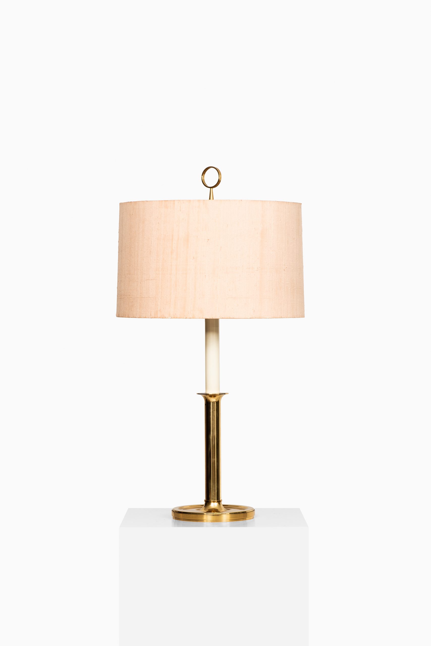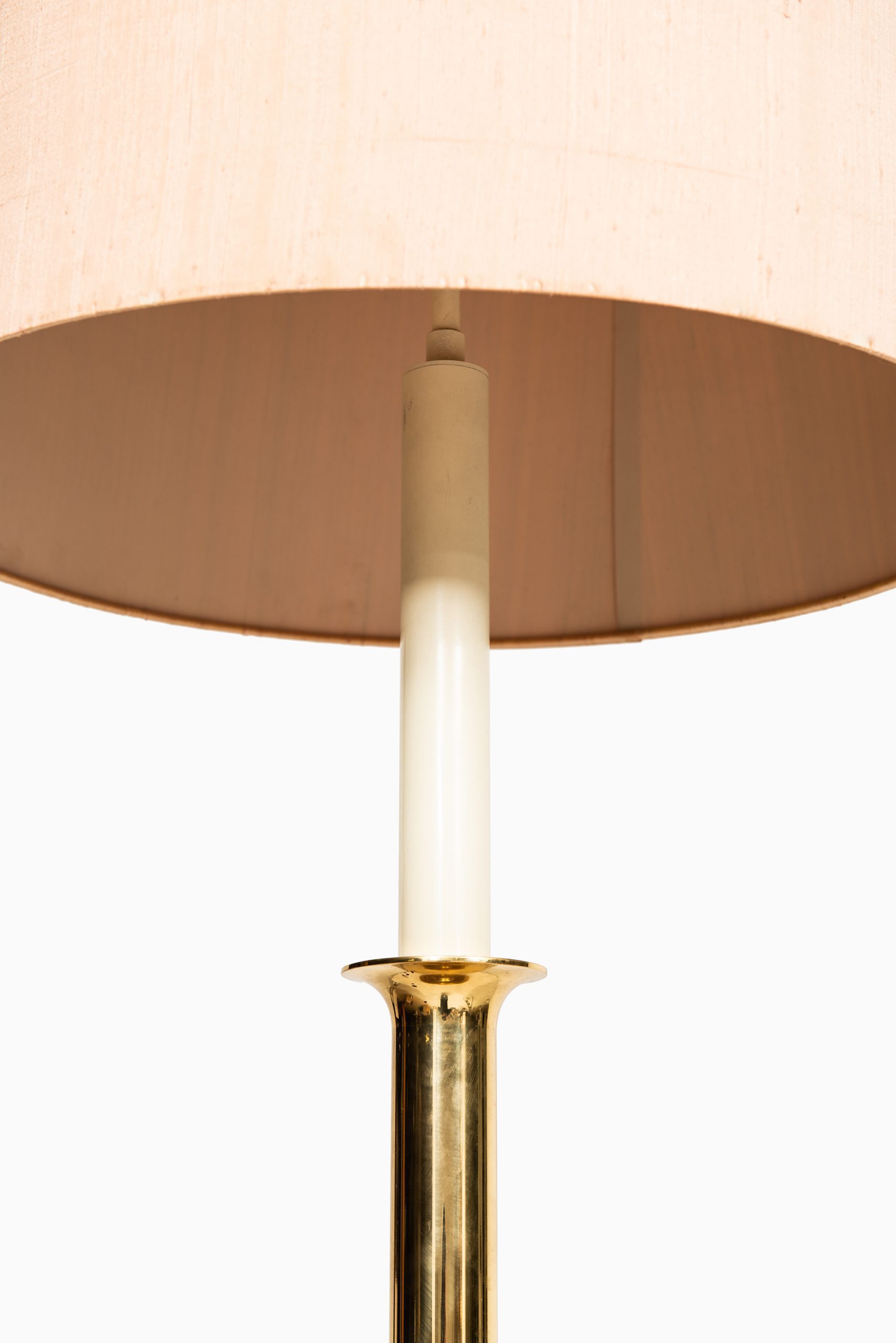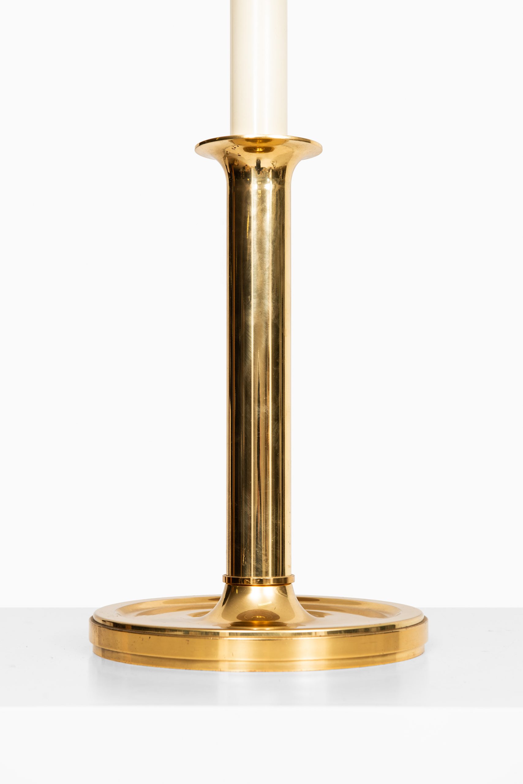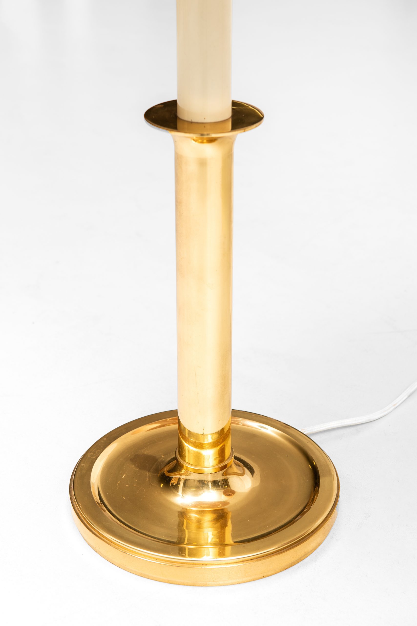 This pair of tall table lamps, dating from the 1950s, is executed in brass with a textile lampshade and demonstrates a refined mid-century character with potential German origins. The structure is defined by a flared circular base that supports a straight cylindrical brass stem. The transition to the upper portion is marked by a narrower candle-like central column in a cream-toned finish, evoking the appearance of classic candelabra forms. The lamp is topped with a wide cylindrical shade in a lightly textured, warm beige fabric that offers a subtle tactile contrast to the smooth brass elements. A brass ring finial crowns the composition, reinforcing the design’s symmetrical balance and understated elegance.