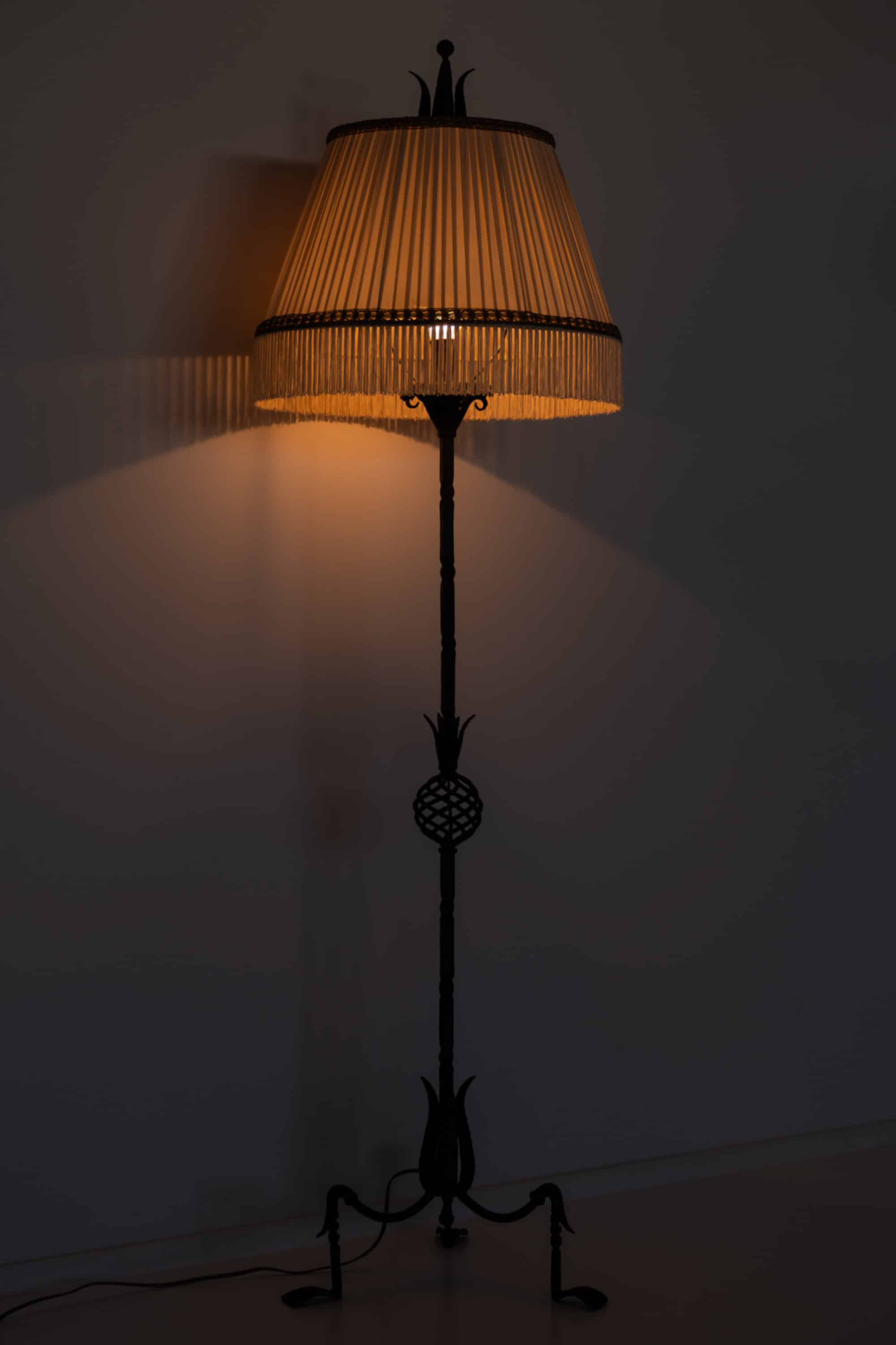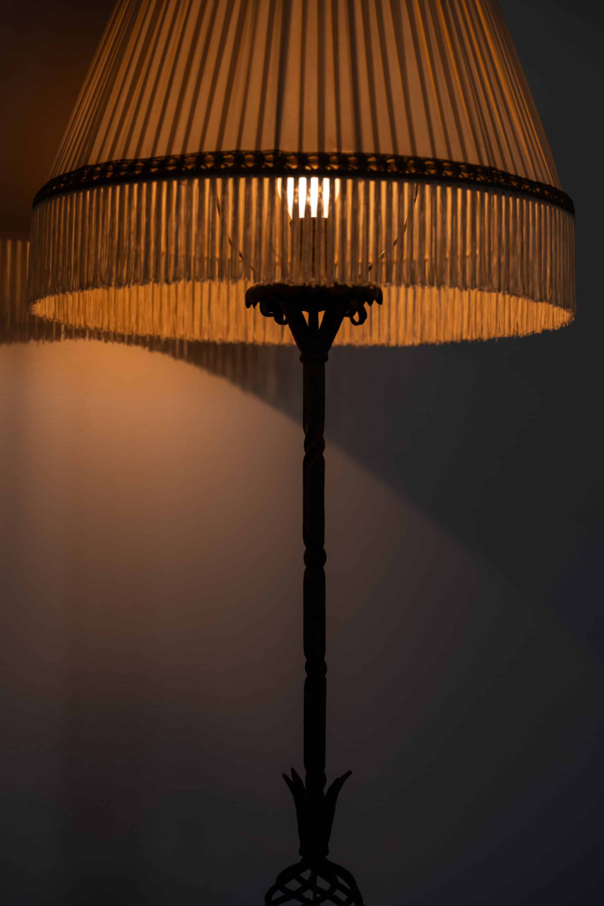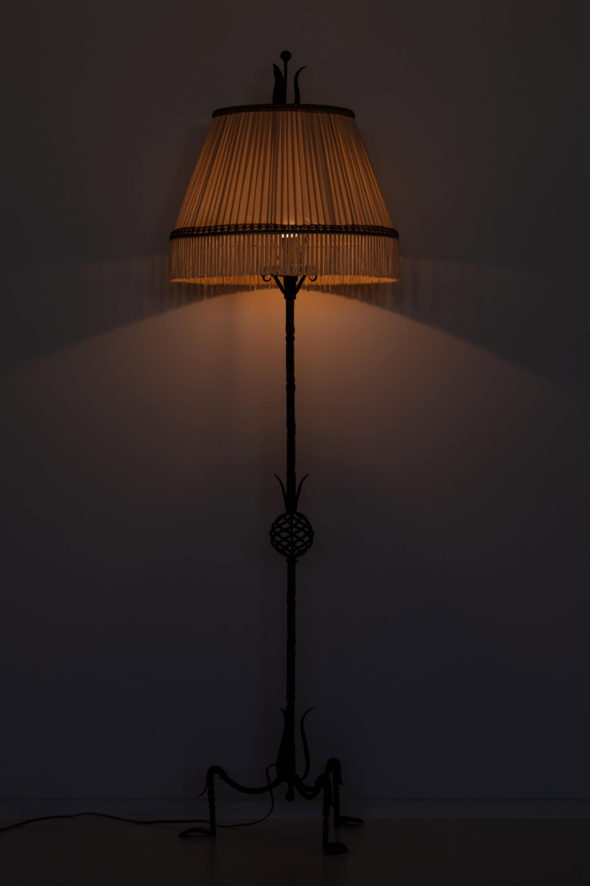 The shade is a later but sympathetic addition, made from pleated fabric in a warm off-white tone. It is finished with decorative trim and a fringe along the lower edge, adding softness and contrast to the otherwise robust iron construction. When lit, the shade diffuses the light into a warm, atmospheric glow that highlights both the texture of the fabric and the silhouette of the forged base.