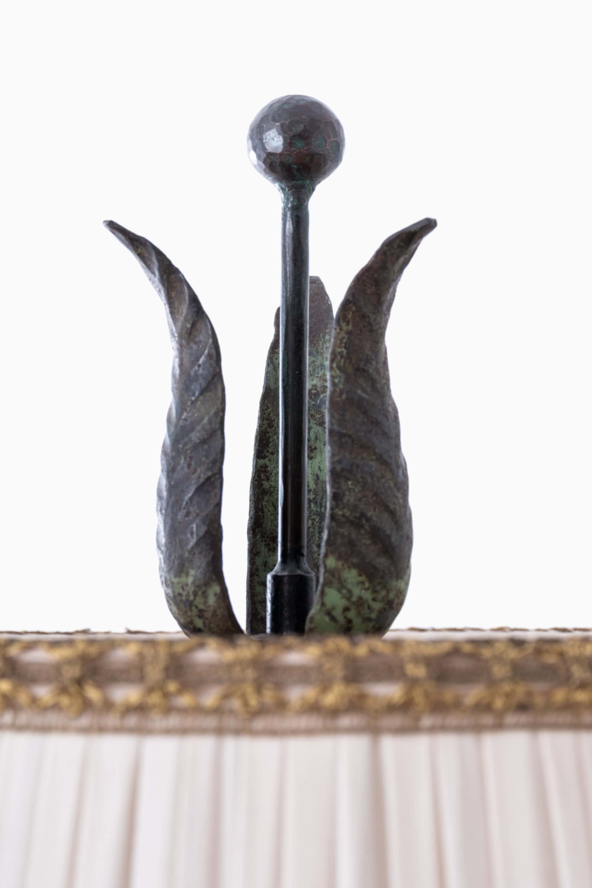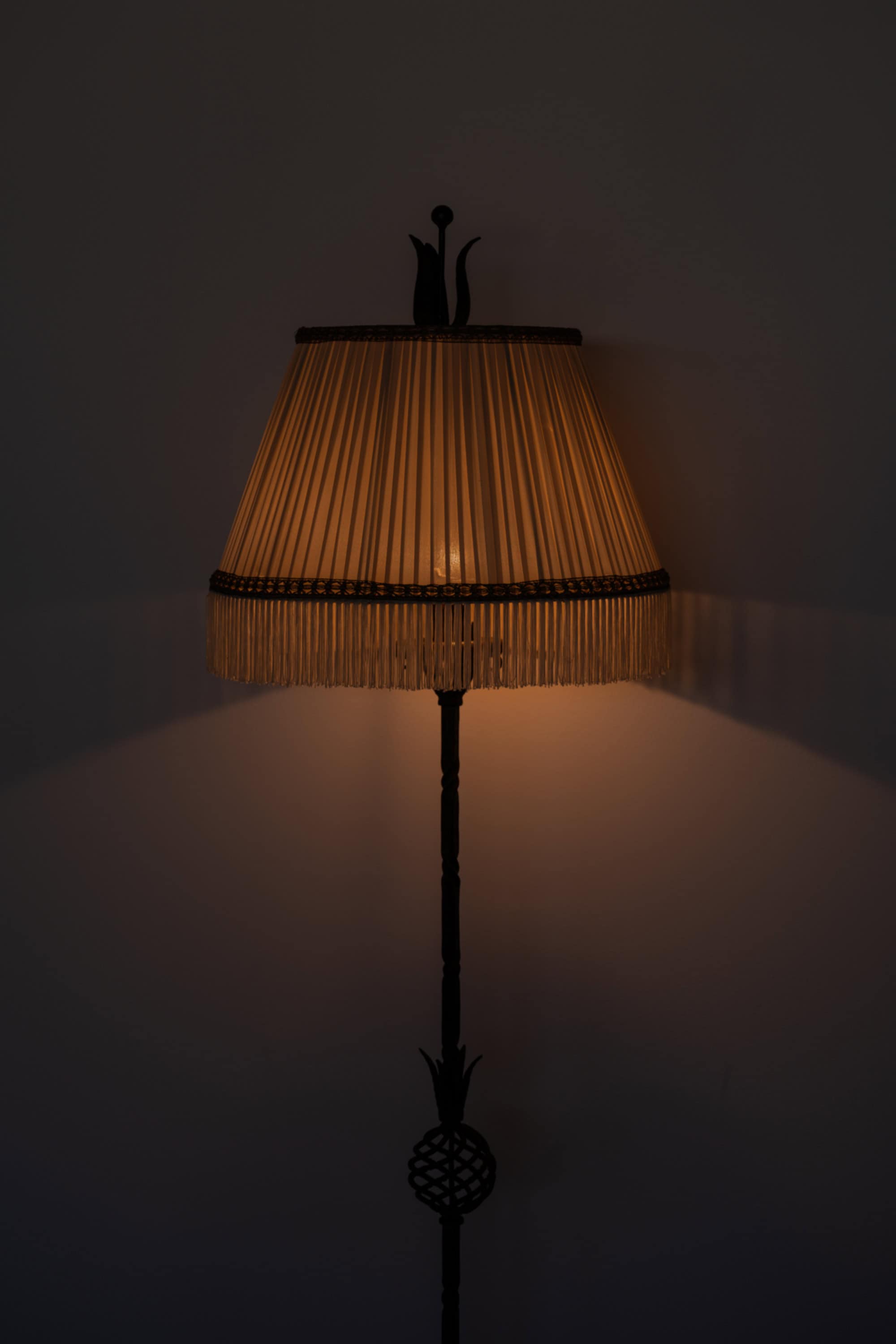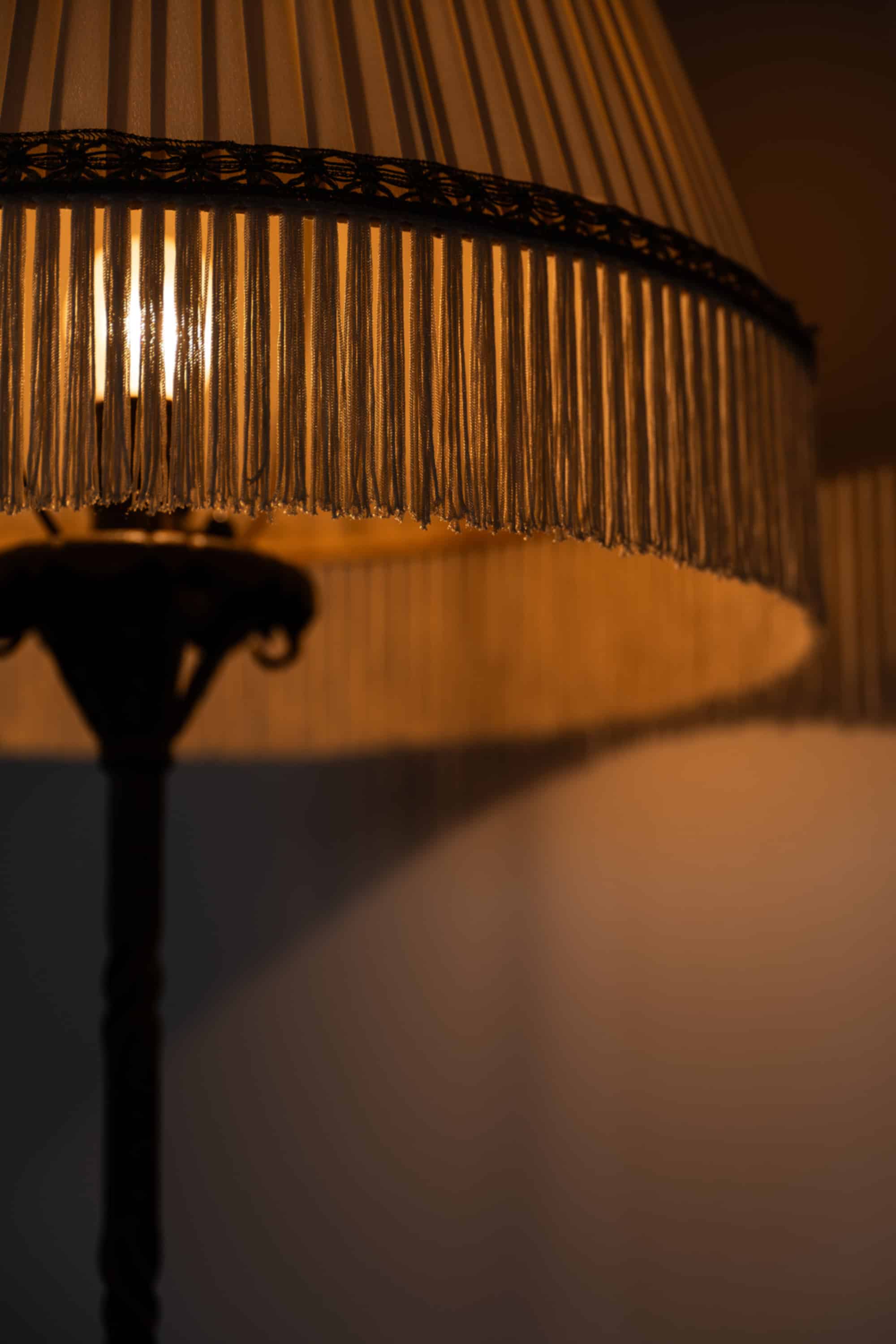 The shade is a later but sympathetic addition, made from pleated fabric in a warm off-white tone. It is finished with decorative trim and a fringe along the lower edge, adding softness and contrast to the otherwise robust iron construction. When lit, the shade diffuses the light into a warm, atmospheric glow that highlights both the texture of the fabric and the silhouette of the forged base.