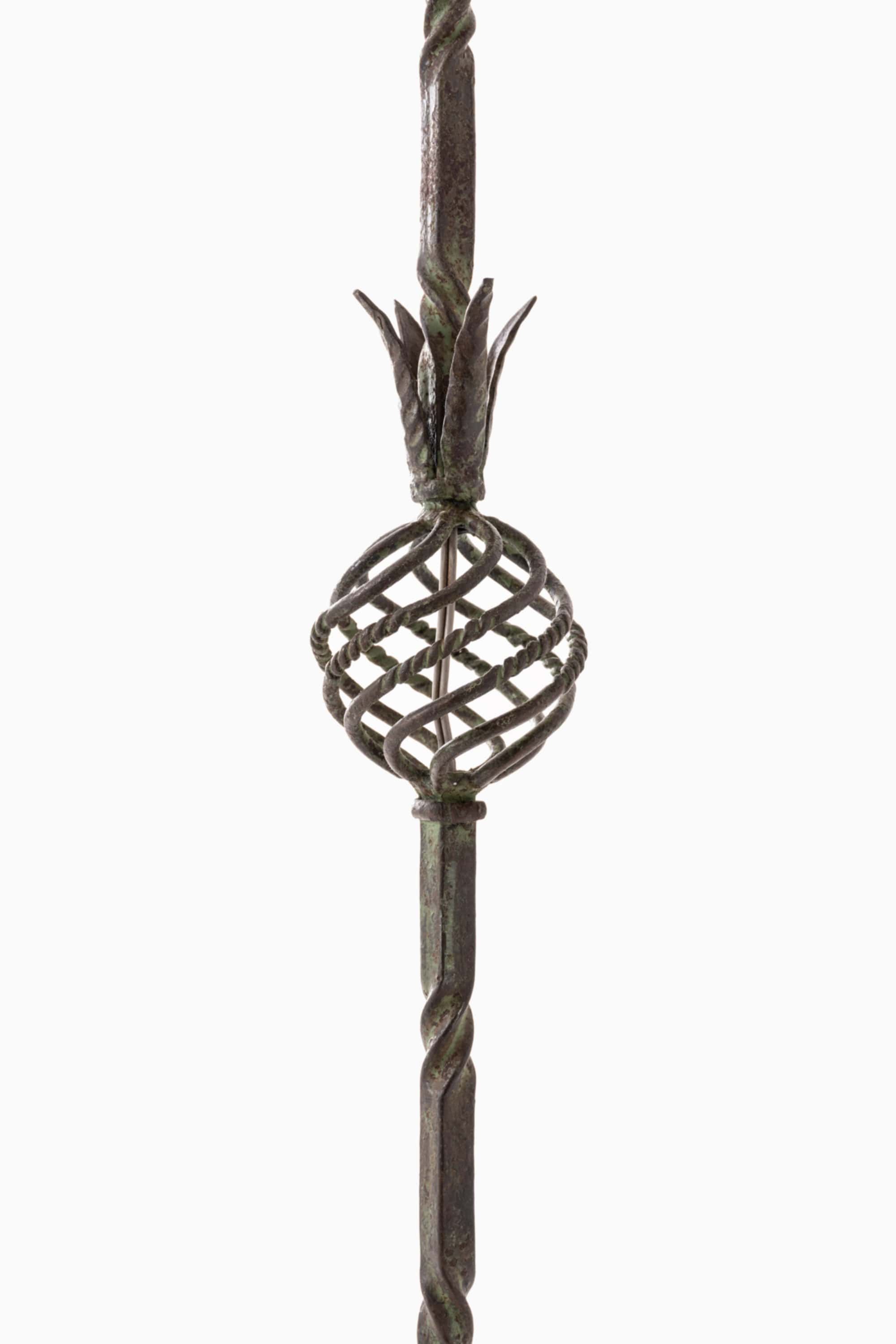 The upper section is crowned with a detailed finial composed of leaf-shaped elements surrounding a hammered sphere, echoing the botanical motifs found throughout the piece. The lamp holder is integrated into a forged crown-like structure, maintaining consistency in material and craftsmanship.