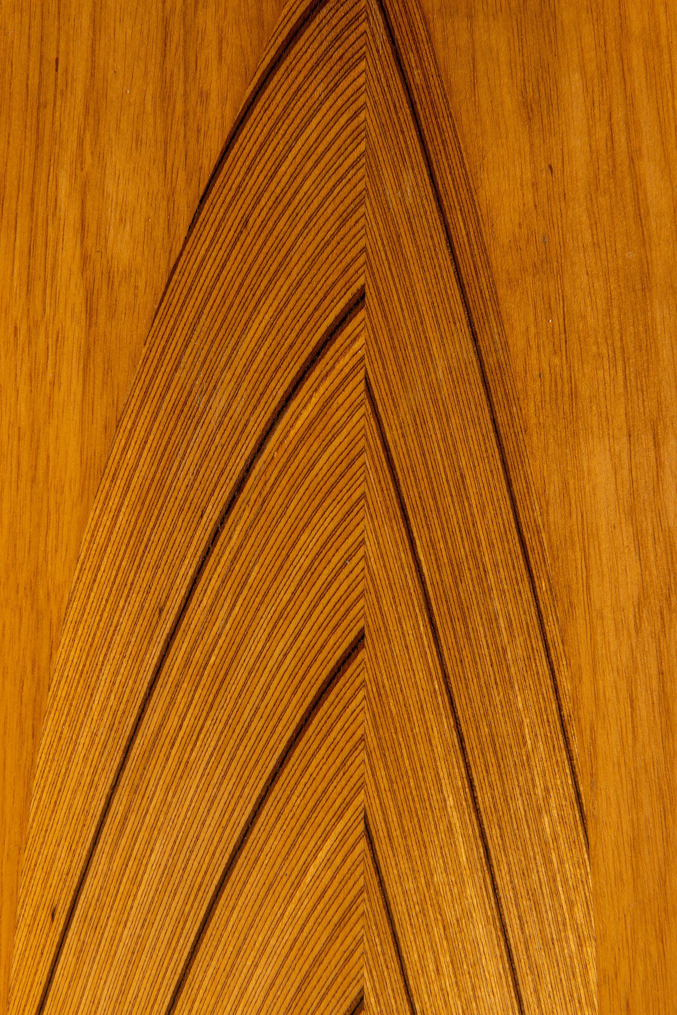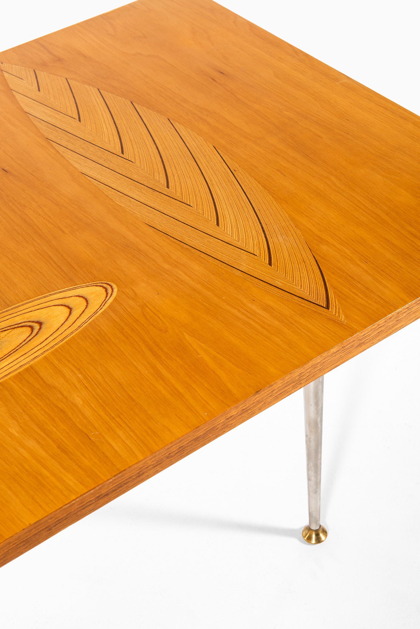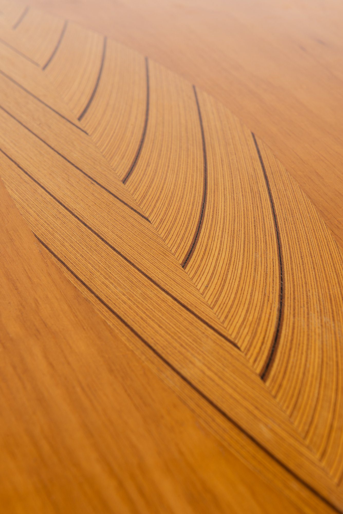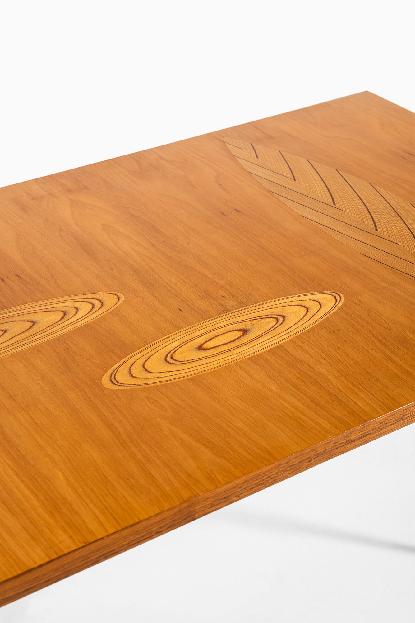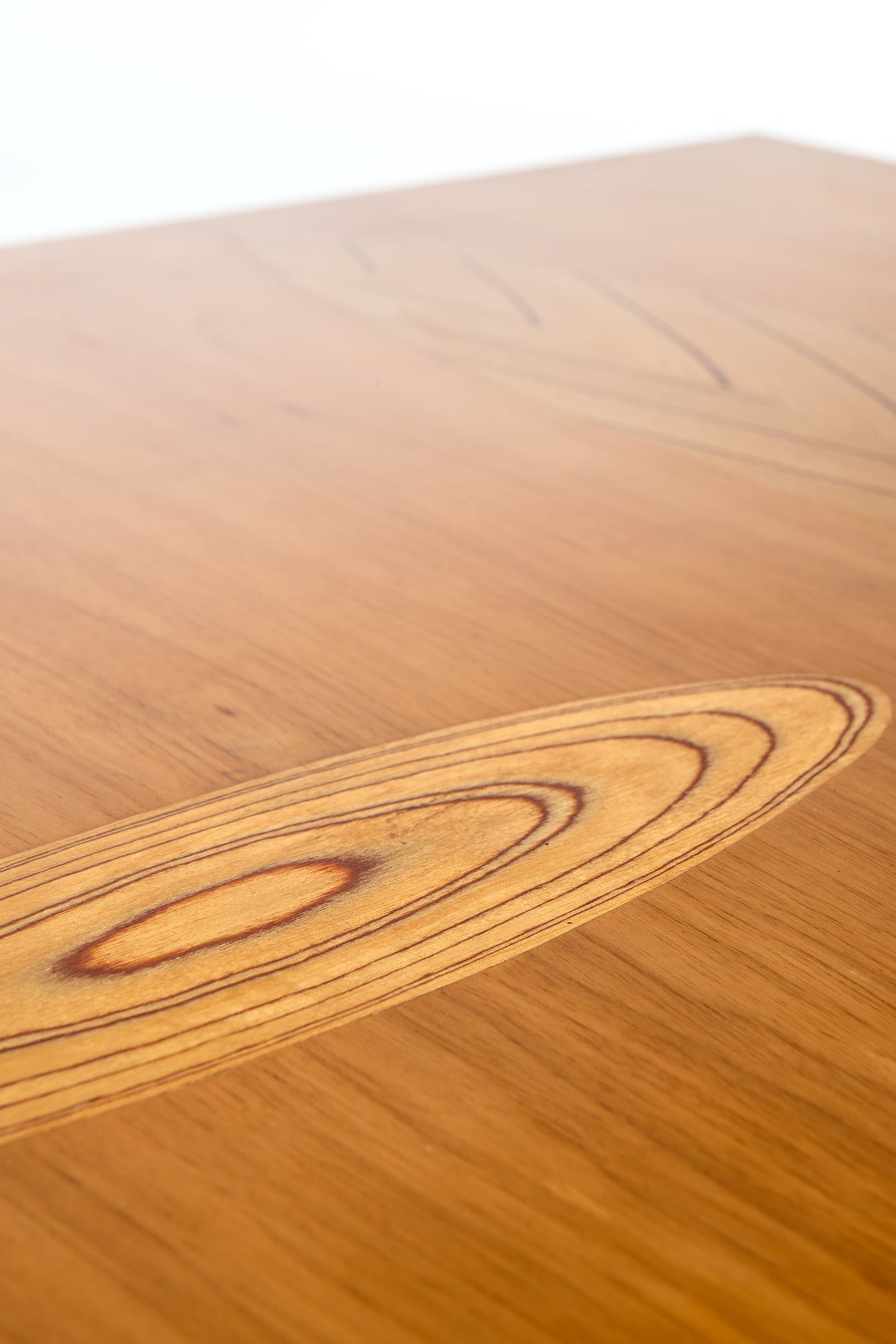 This rare coffee table was designed by Tapio Wirkkala and produced by Asko in Finland during the 1950s. The tabletop is executed in birch veneer and features Wirkkala’s characteristic “Mussel” and “Leaf” inlays, a technique where precision-cut veneers are arranged in organic patterns that resemble natural forms. These intricate inlays demonstrate Wirkkala’s deep interest in natural structures and his exceptional craftsmanship in working with wood. The surface displays a warm honey-brown tone with fine grain patterns and a satin finish that emphasizes the texture and detail of the veneer composition.