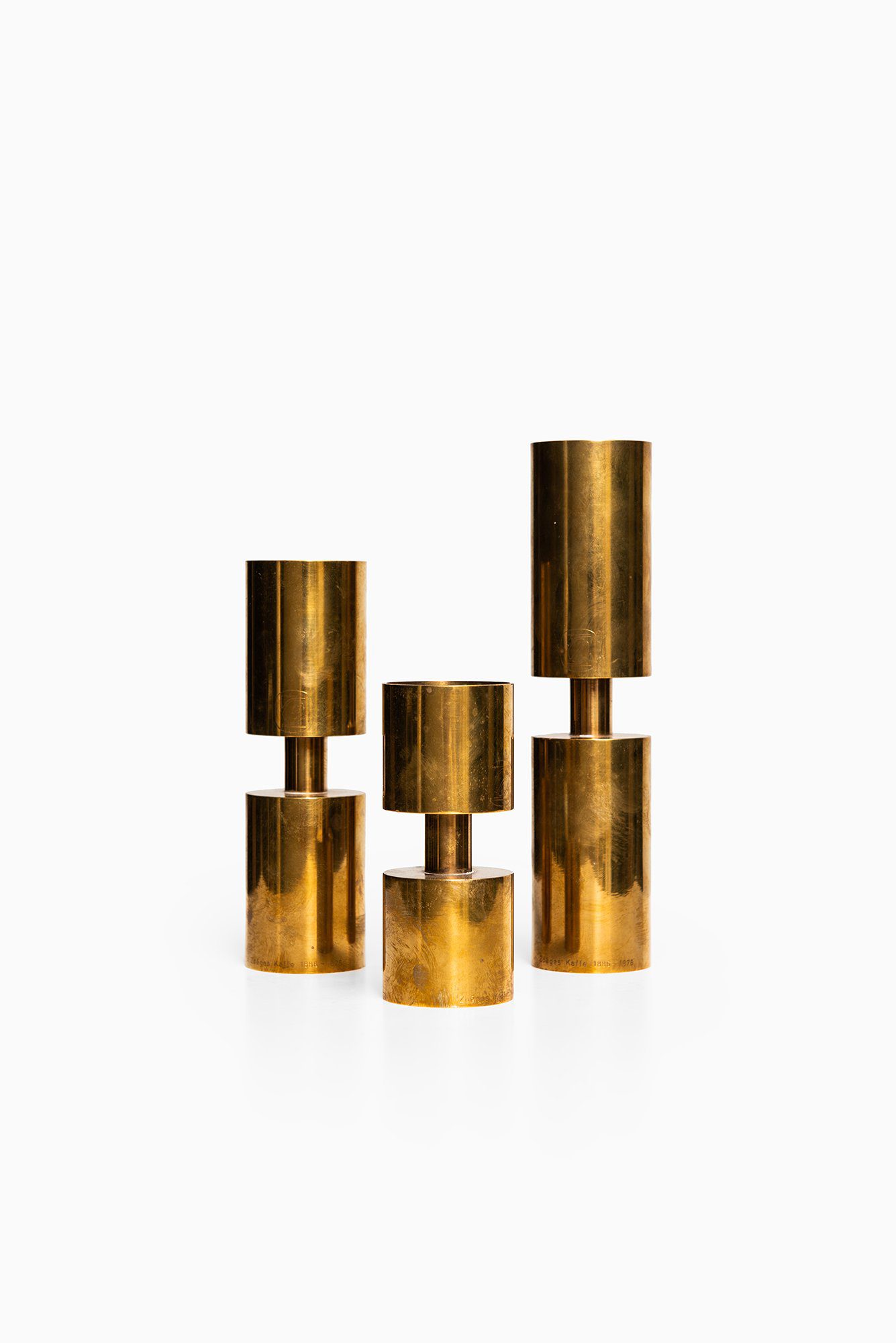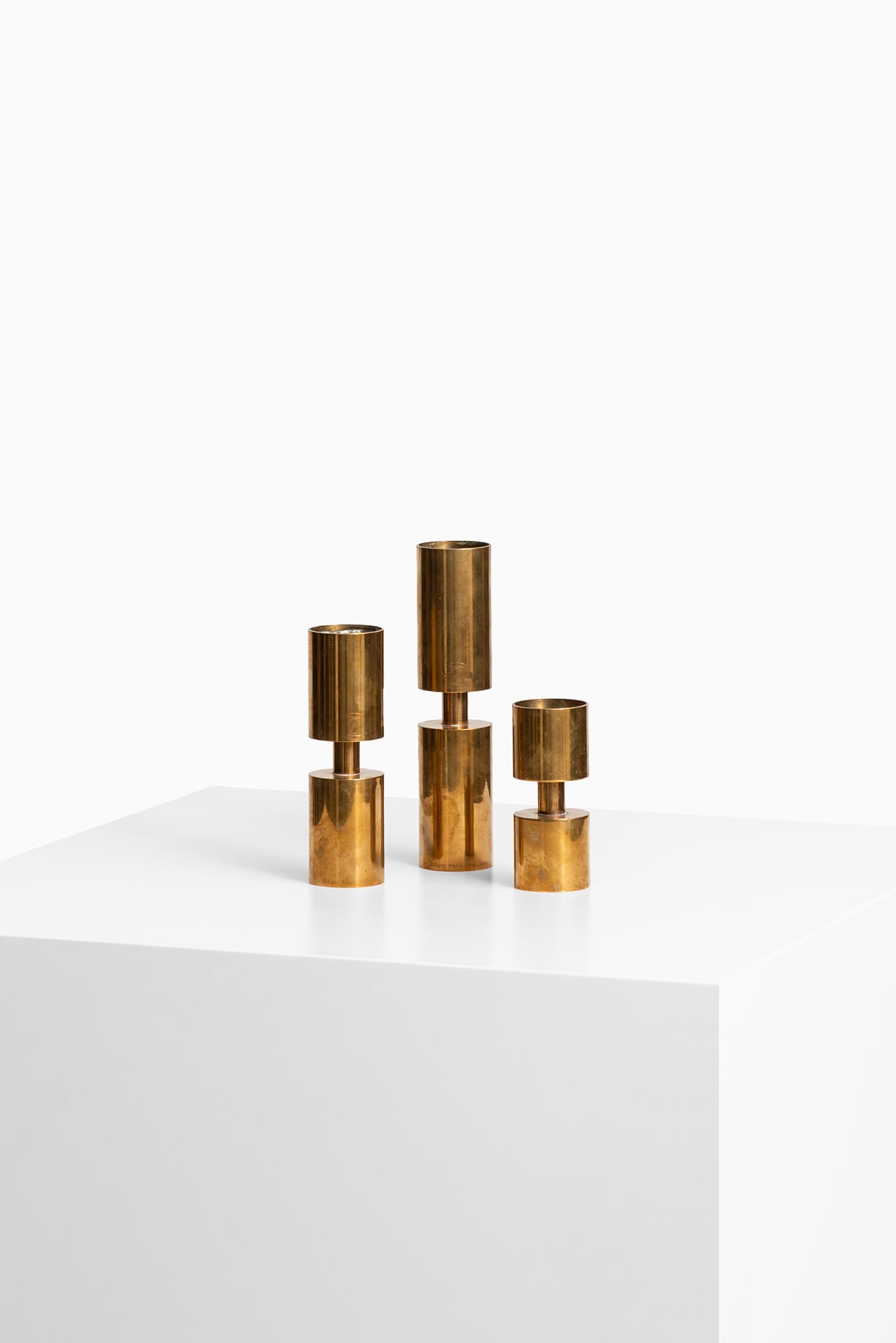 This set of three brass candlesticks was designed by Thelma Zoéga and produced in Sweden during the 1970s. Zoéga’s work reflects the Scandinavian modernist sensibility of the period, characterized by clean geometry, precision, and a focus on material presence. The design emphasizes proportion and repetition, with cylindrical forms arranged in a balanced, architectural composition.