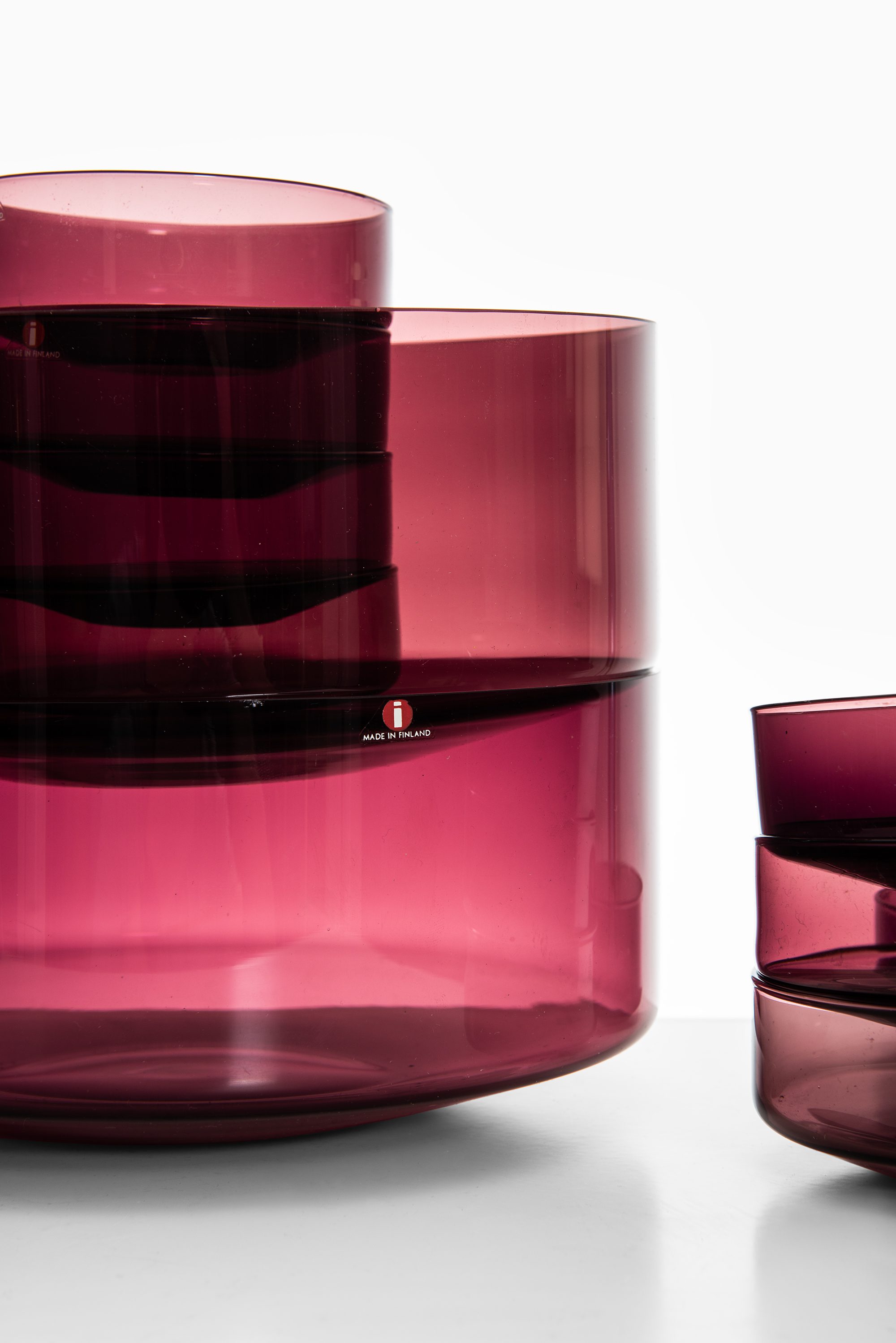 The set consists of two large bowls and eleven smaller ones, each crafted from richly colored glass in a deep, translucent cranberry hue. The bowls feature clean, cylindrical silhouettes with gently rounded bases and thin, precise rims that emphasize their refined, modernist character. The minimal, balanced form reflects Sarpaneva’s focus on purity of shape and material, while the rich tone of the glass captures and reflects light beautifully, enhancing the sense of depth and volume.
