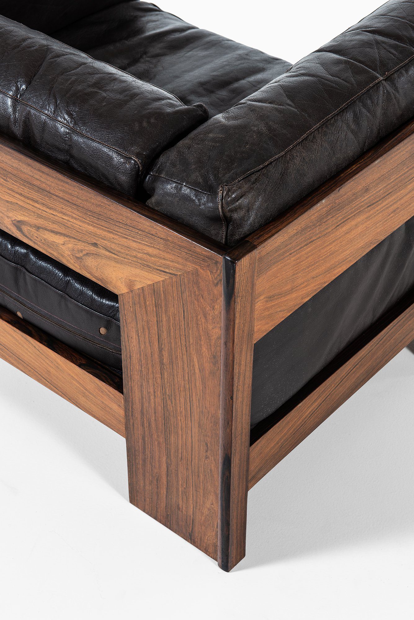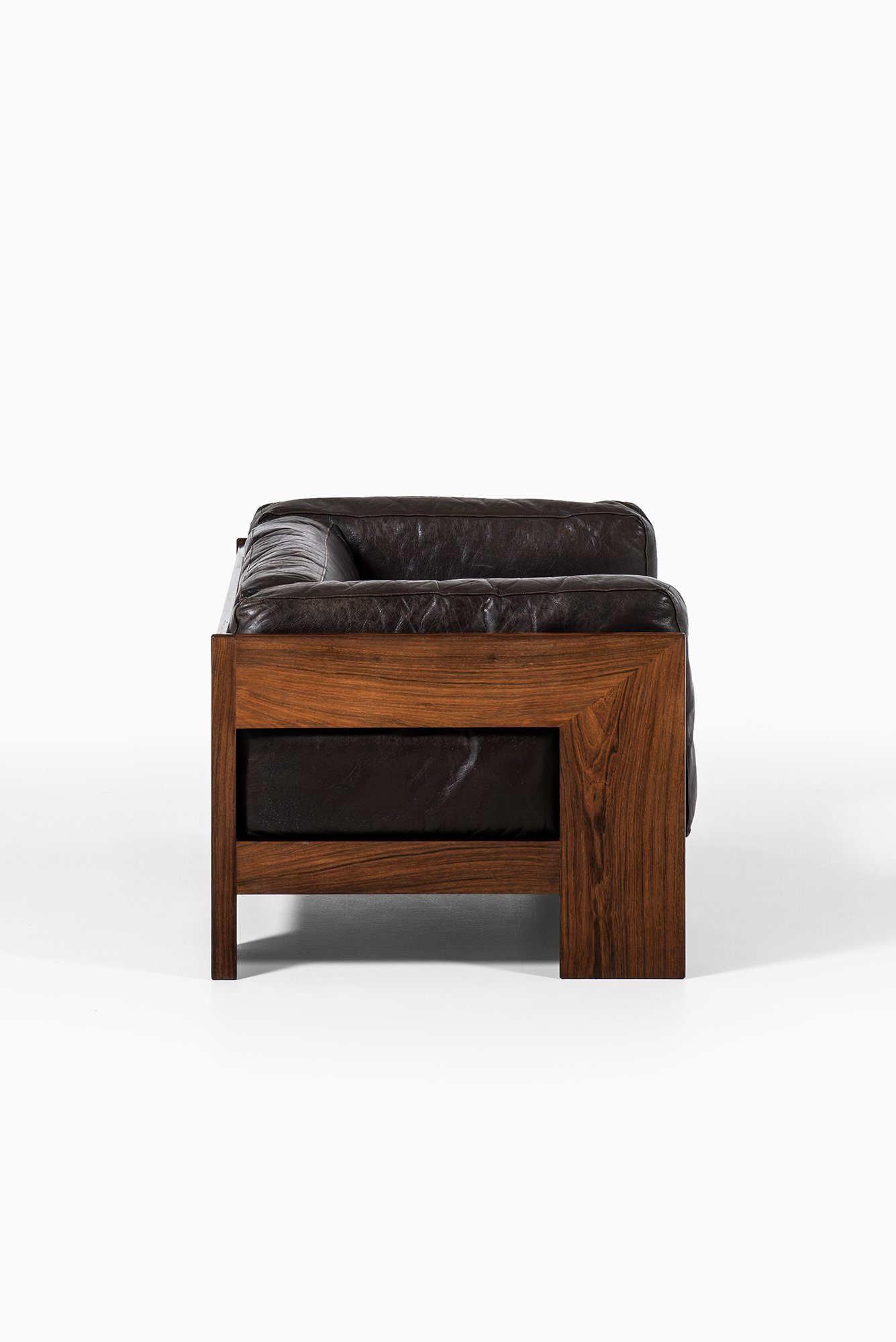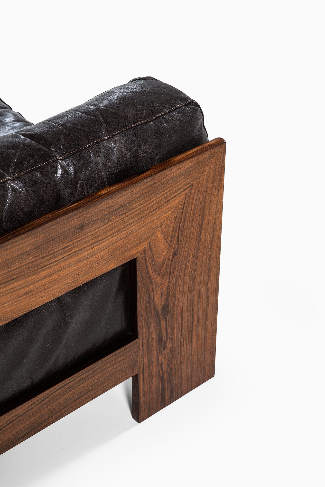 The dark leather displays natural patina and fine creasing, complementing the warm tone and texture of the rosewood. The cushions are loose and substantial, following the Italian modernist tradition of combining structural precision with soft, organic materials. The craftsmanship reveals careful attention to joinery and proportion, hallmarks of high-quality mid-century production.