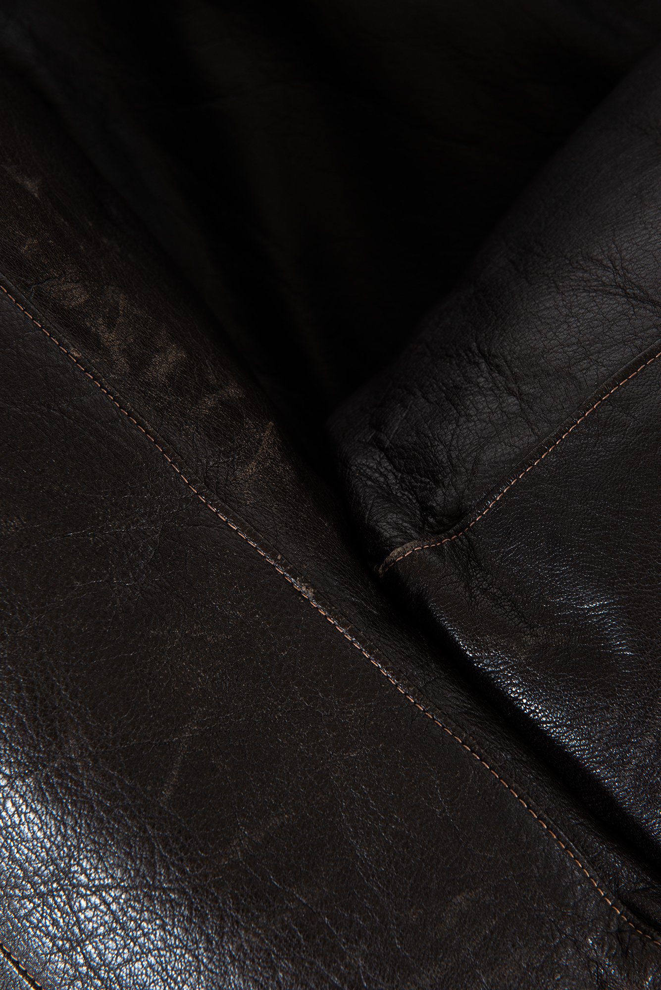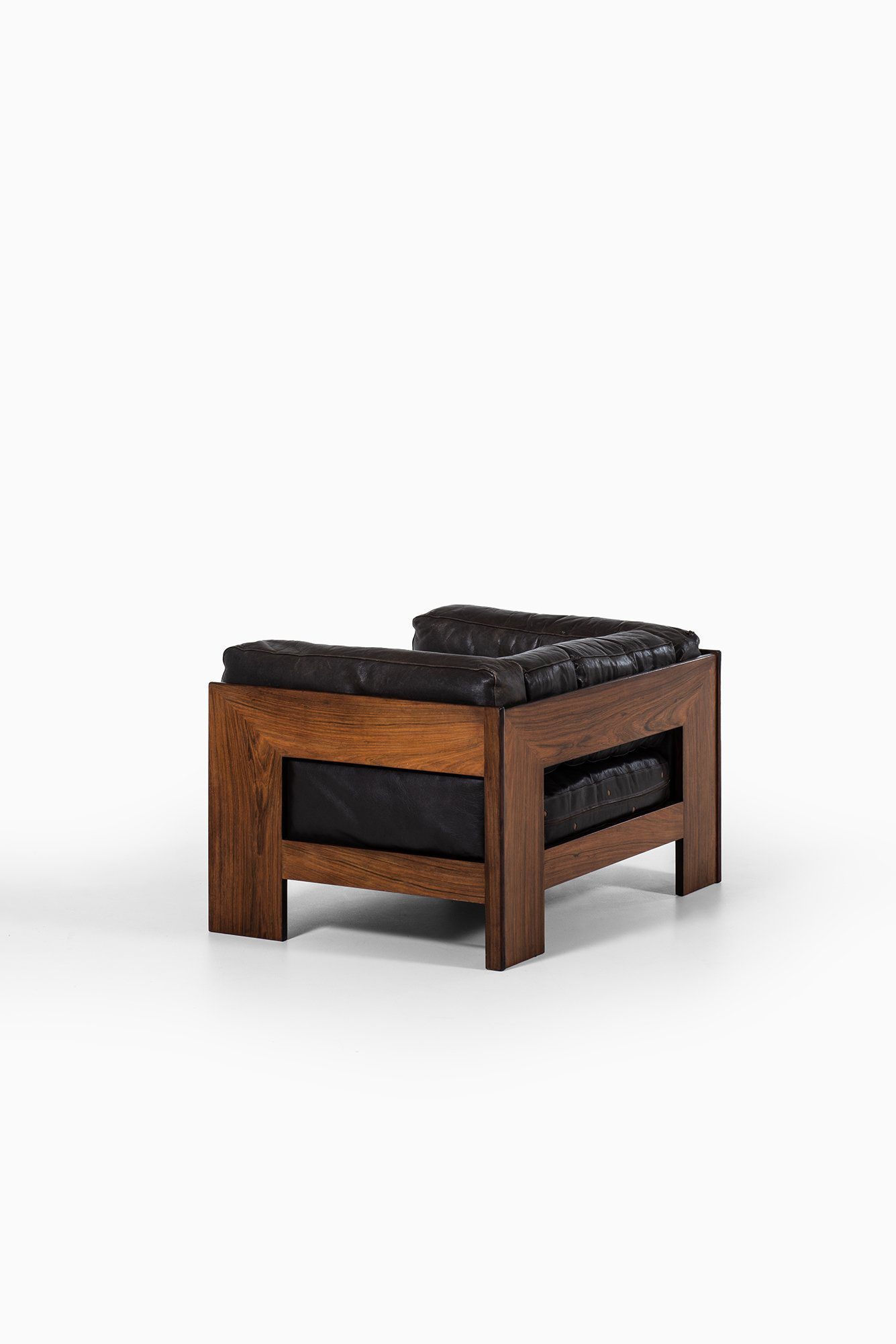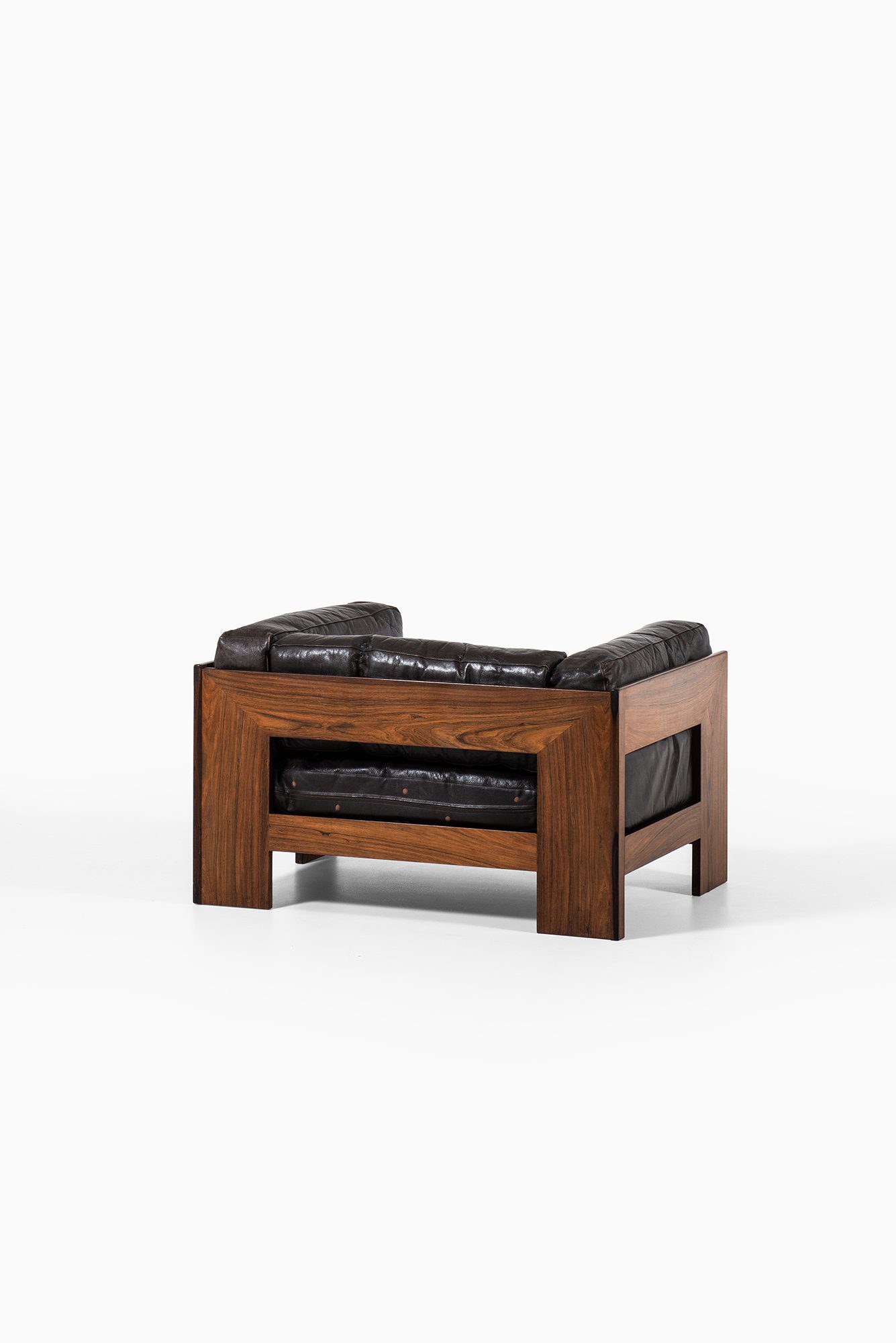 The dark leather displays natural patina and fine creasing, complementing the warm tone and texture of the rosewood. The cushions are loose and substantial, following the Italian modernist tradition of combining structural precision with soft, organic materials. The craftsmanship reveals careful attention to joinery and proportion, hallmarks of high-quality mid-century production.