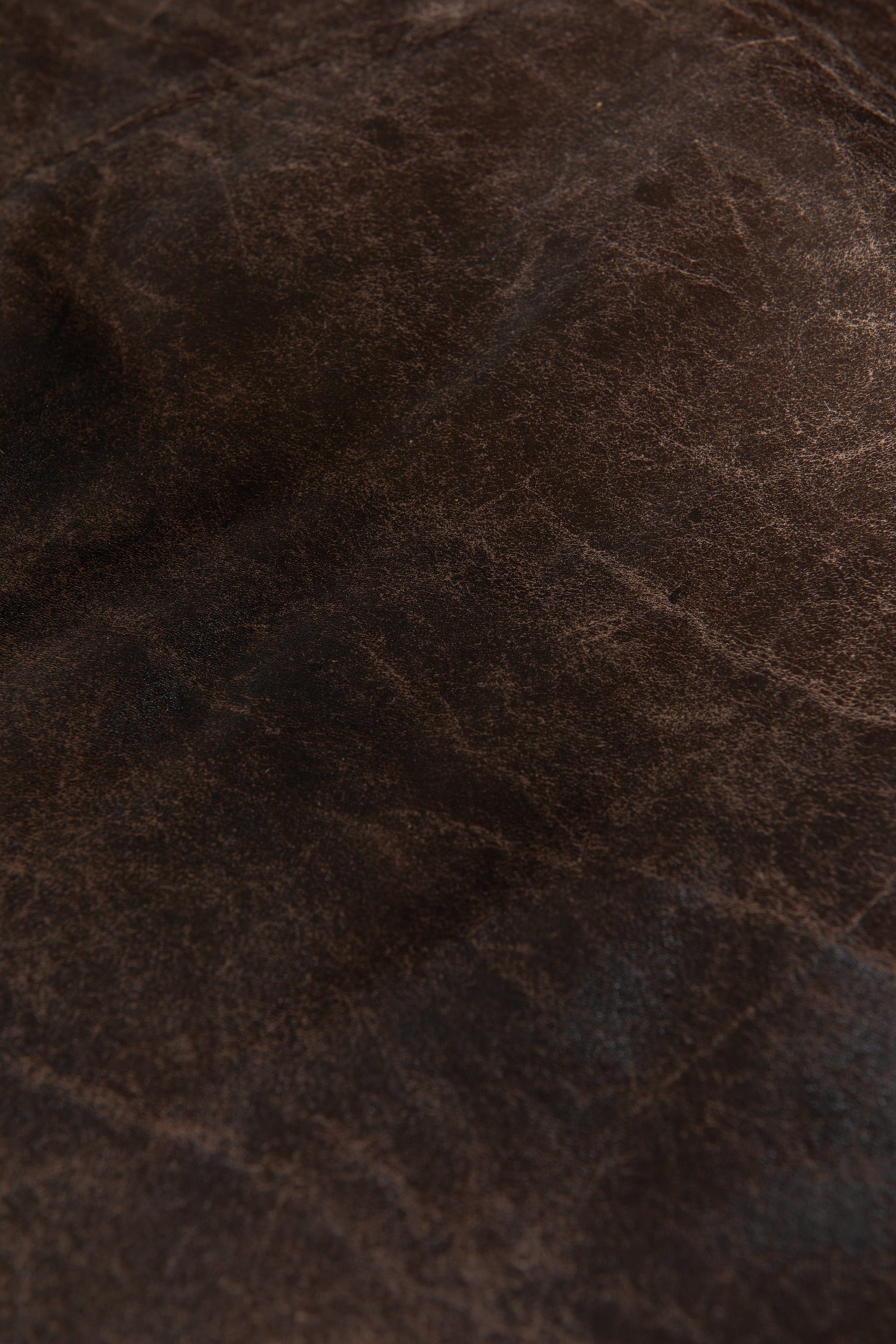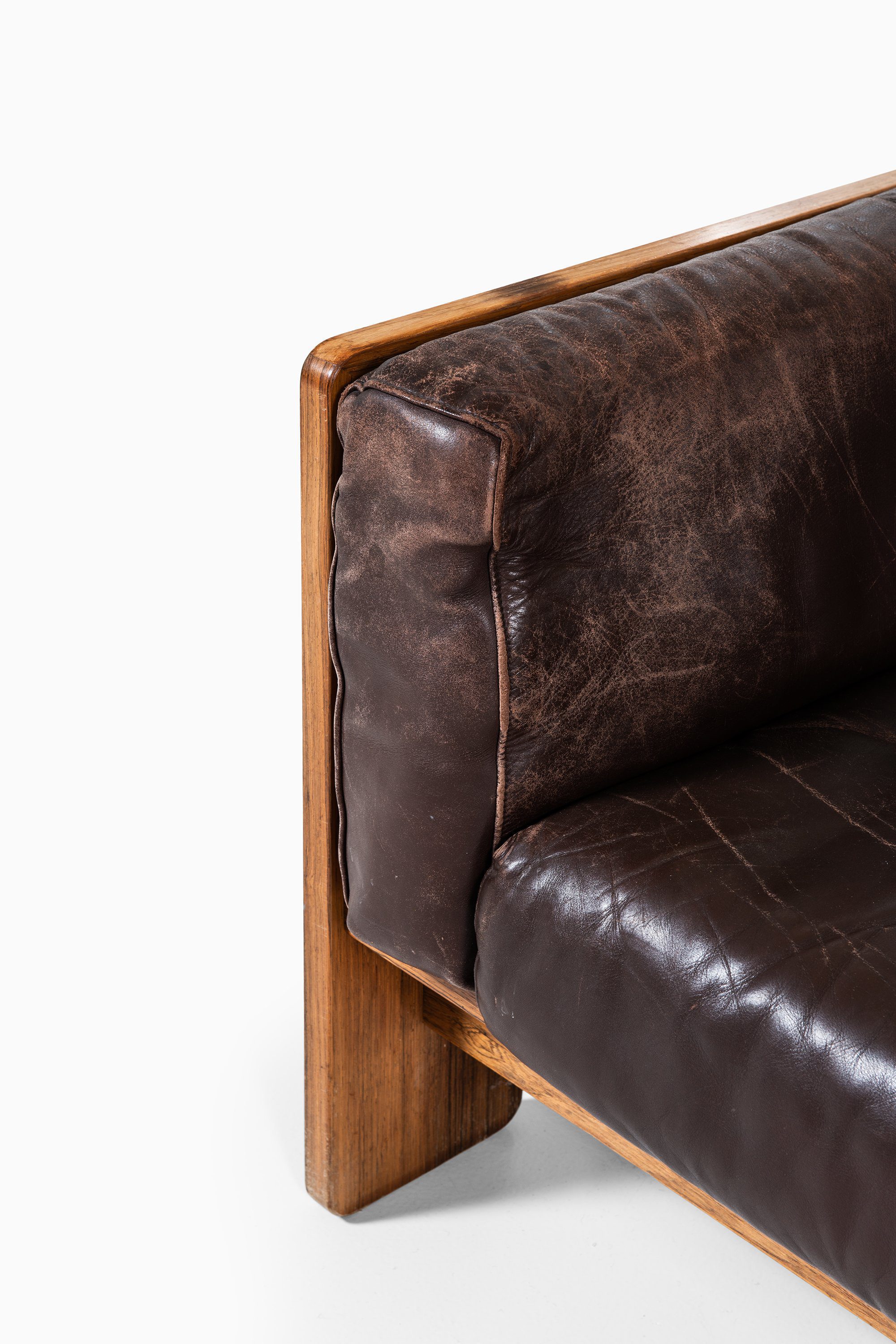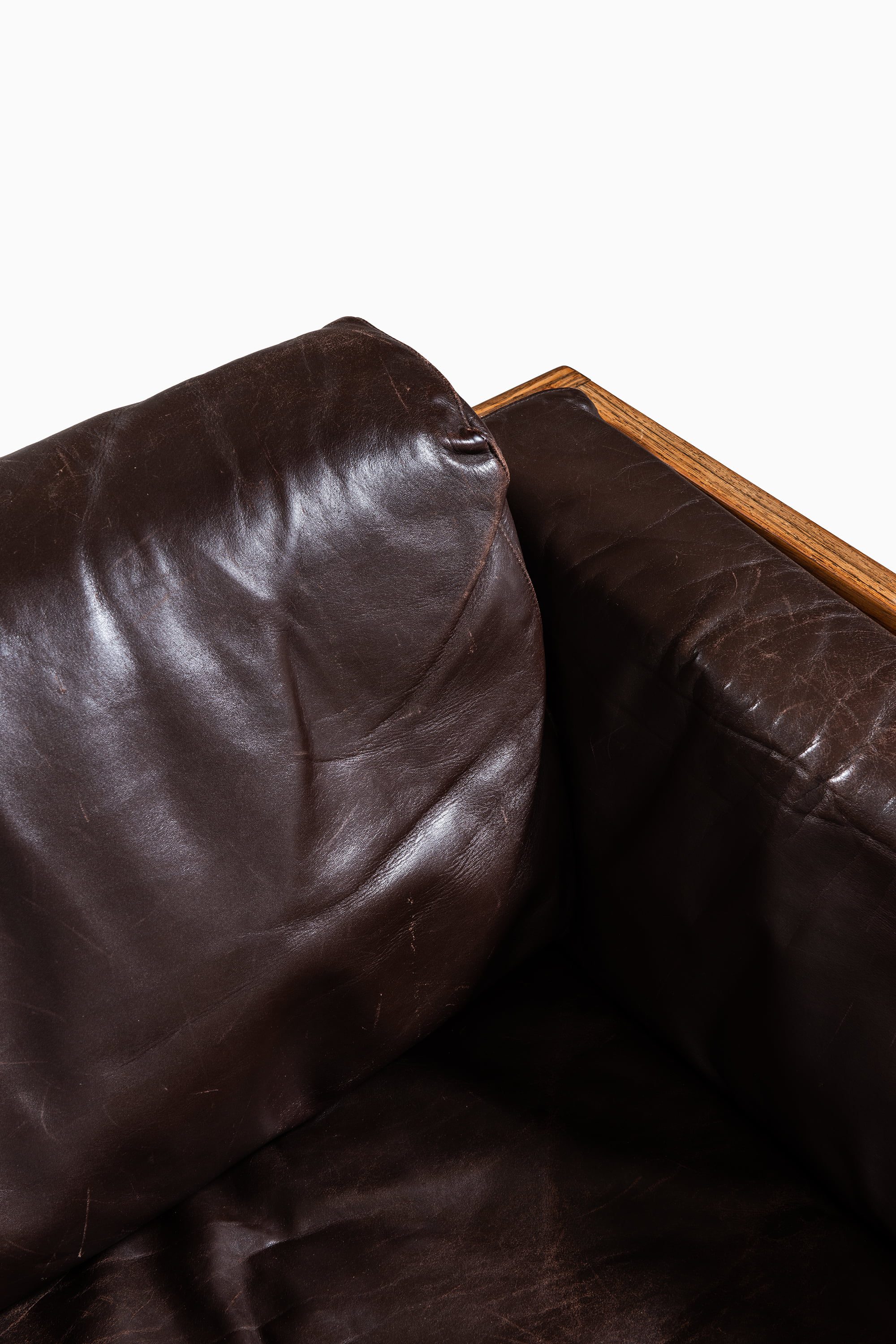 The design combines structural clarity with luxurious materials. The frame is constructed with thick rosewood boards joined at clean right angles, emphasizing both stability and geometry. The deep seat and generous cushions create a strong visual contrast between the rigid wooden structure and the soft, worn leather. The cushions retain their original patina, showing natural creases and wear that attest to the quality of the material and the passage of time.