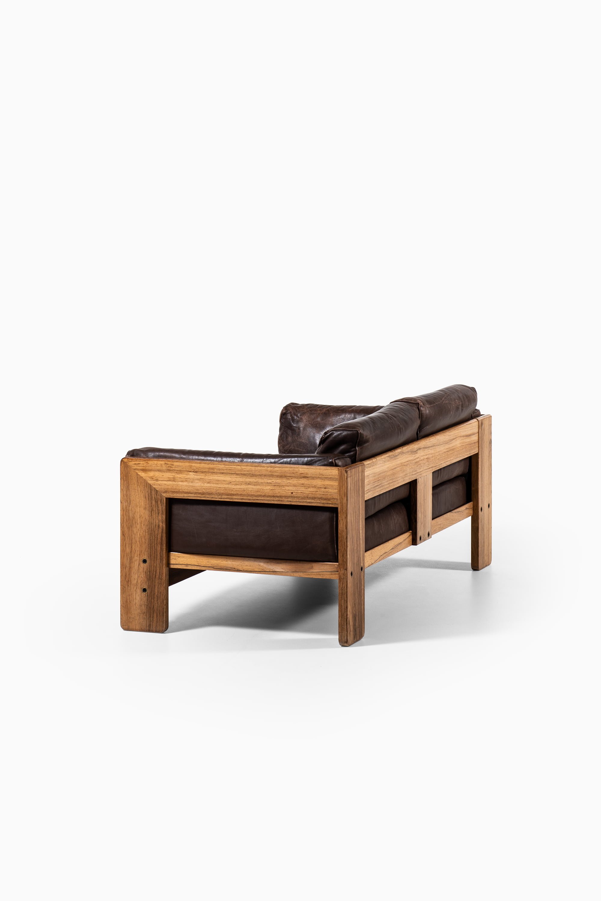 Sofa model Bastiano designed by Tobia Scarpa and produced by Haimi in Finland during the 1960s. The frame is made of solid rosewood with a rich grain pattern and warm tone, complemented by the original brown leather upholstery.