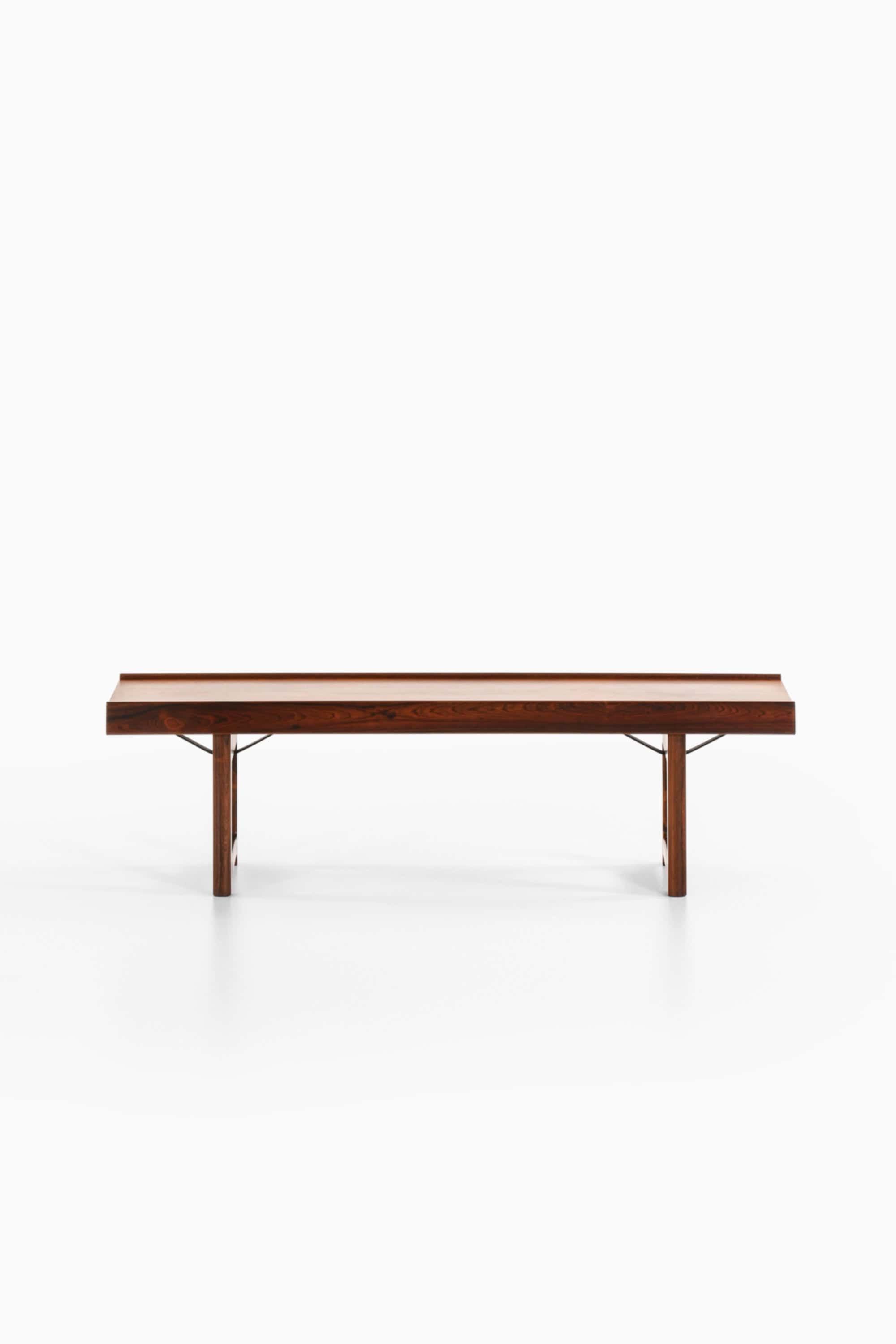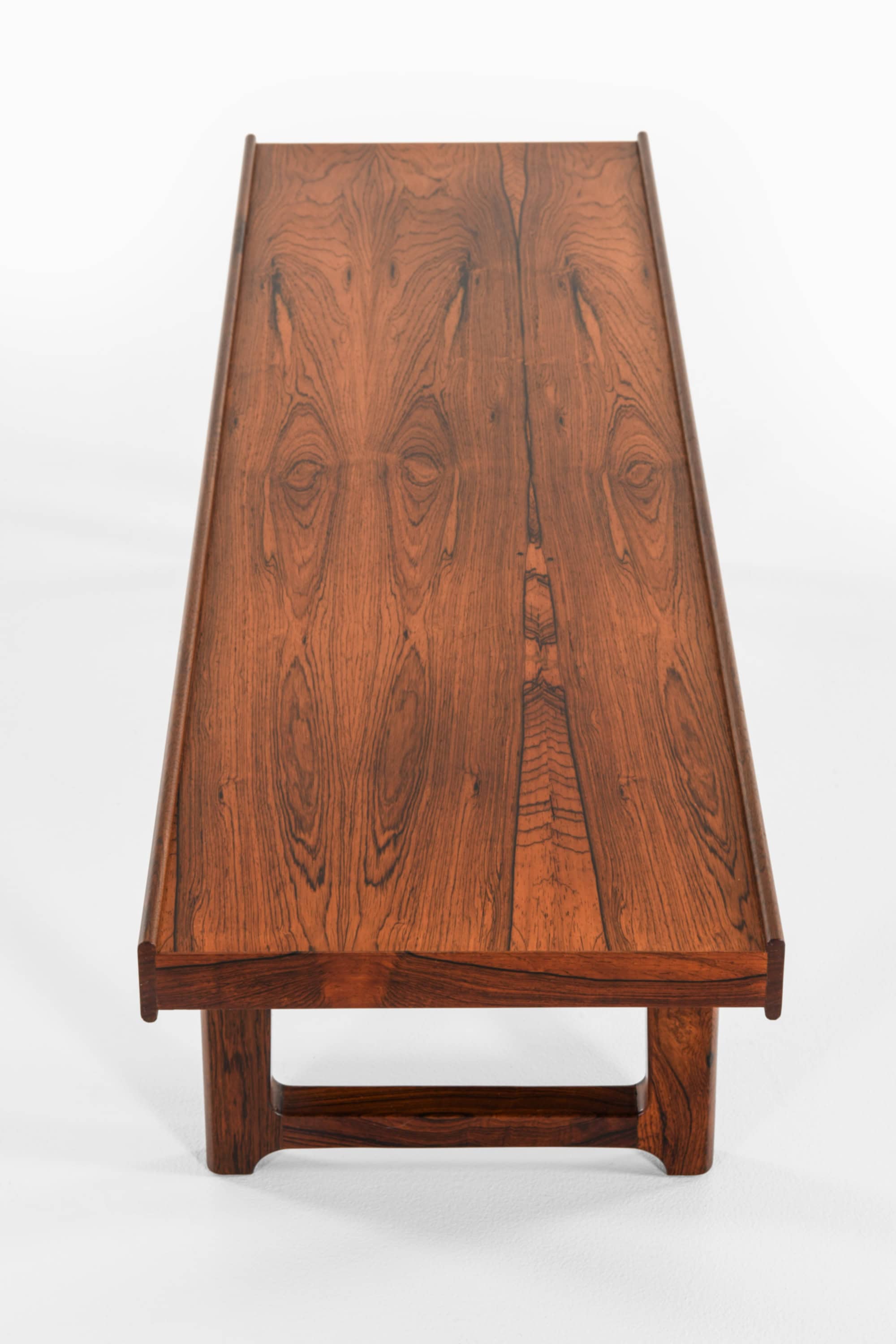 Krobo bench / side table designed by Torbjørn Afdal and produced by Mellemstrands Møbelfabrik in Norway in 1960. The piece is executed in rosewood with a rich, warm brown tone and pronounced dark grain patterning that runs lengthwise along the top. The rectangular top has slightly raised, rounded edges on the long sides, giving a shallow tray-like profile that helps define the surface and keeps objects visually contained.